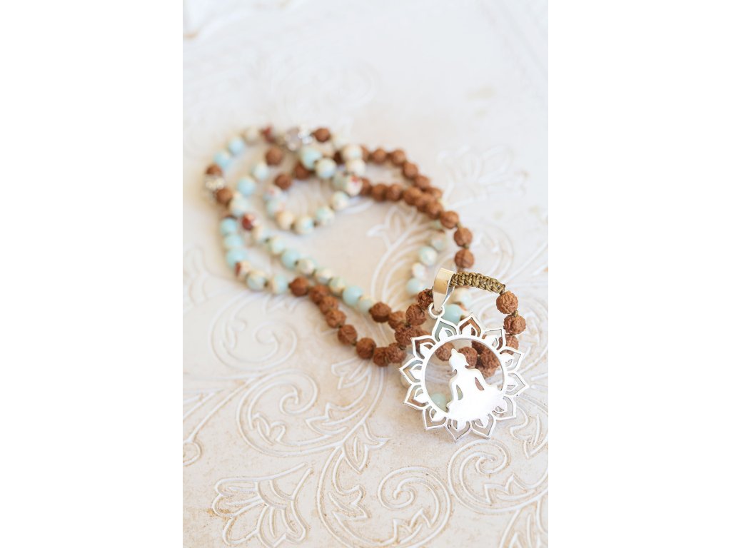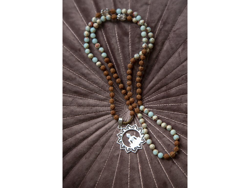 108 mála s rudrakshou a jaspisem 108 mála obsahuje jaspis mořský, žíhaný achát a rudrakshu. Ve středu je kovový přívěšek Buddha. Achát podporuje vnitřní stabilitu, vyrovnanost a zralost, pocit bezpečí a sebevědomí. Usnadňuje třídění myšlenek, napomáhá při řešení komplikovaných úkolů. Ve vztazích podporuje věrnost a chápavost. Upevňuje rodinná a přátelská pouta. Jaspis přináší do života klid, pomáhá ve stresu, uvádí do rovnováhy duševní i tělesnou stránku. Umožňuje dosahování cílů, tím že podporuje pronikavost vhledu na podstatu problému. Zvyšuje organizační schopnosti a schopnost dělat rychlá a správná rozhodnutí. Chrání před negativní energií. Je výborným pomocníkem v pracovním i soukromém životě. Celková délka cca 45 cm.Doplňkové parametry