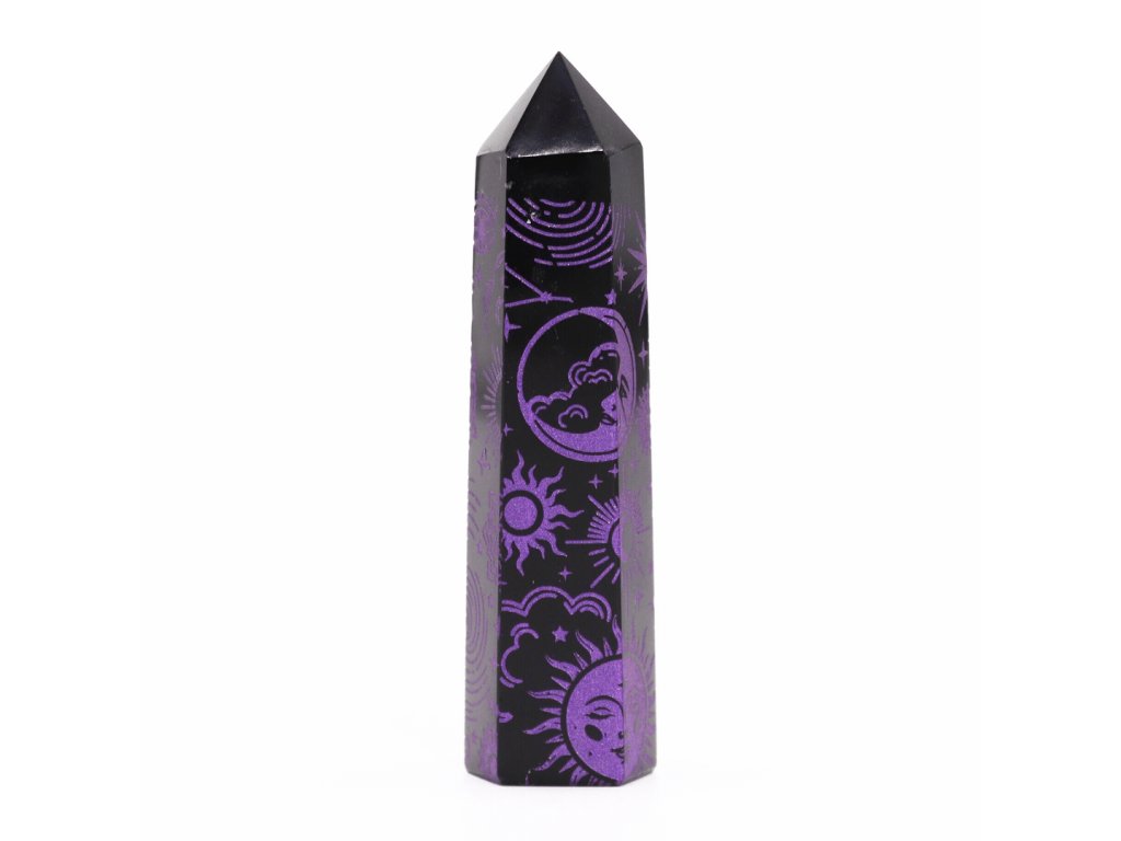 Černý obsidián je známý svou schopností chránit a uzemňovat, pomáhá odvrátit negativitu a absorbovat škodlivé energie. Předpokládá se, že mystické symboly vyleptané do každého kusu tyto účinky zesilují a činí z těchto bodů mocné nástroje pro meditaci, duchovní praktiky nebo léčení krystaly.