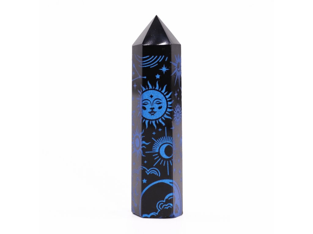 Spojte se s vesmírem prostřednictvím našeho modrého kosmického obsidiánového obelisku, zdobeného zářivými nebeskými symboly.