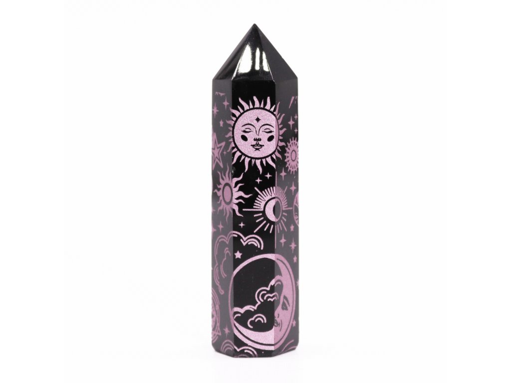 Černý obsidián je známý svou schopností chránit a uzemňovat, pomáhá odvrátit negativitu a absorbovat škodlivé energie. Předpokládá se, že mystické symboly vyleptané do každého kusu tyto účinky zesilují a činí z těchto bodů mocné nástroje pro meditaci, duchovní praktiky nebo léčení krystaly.