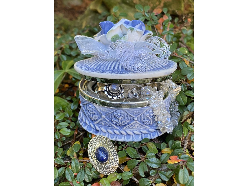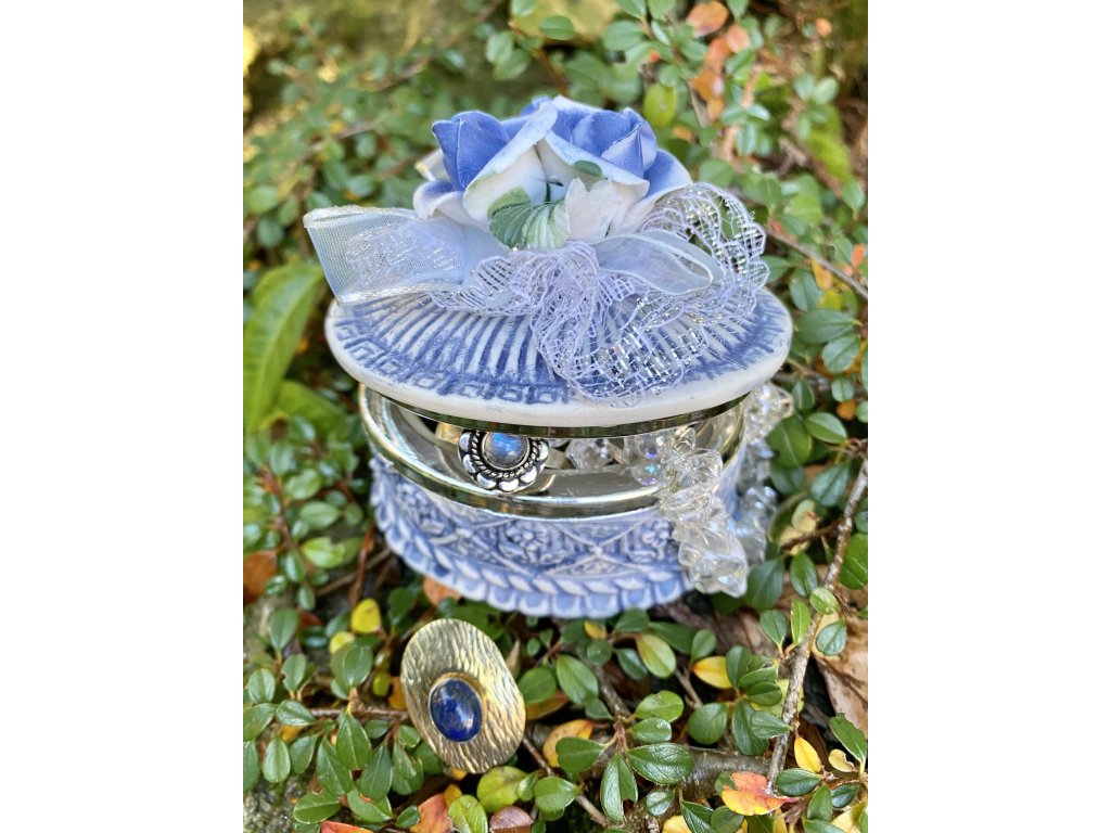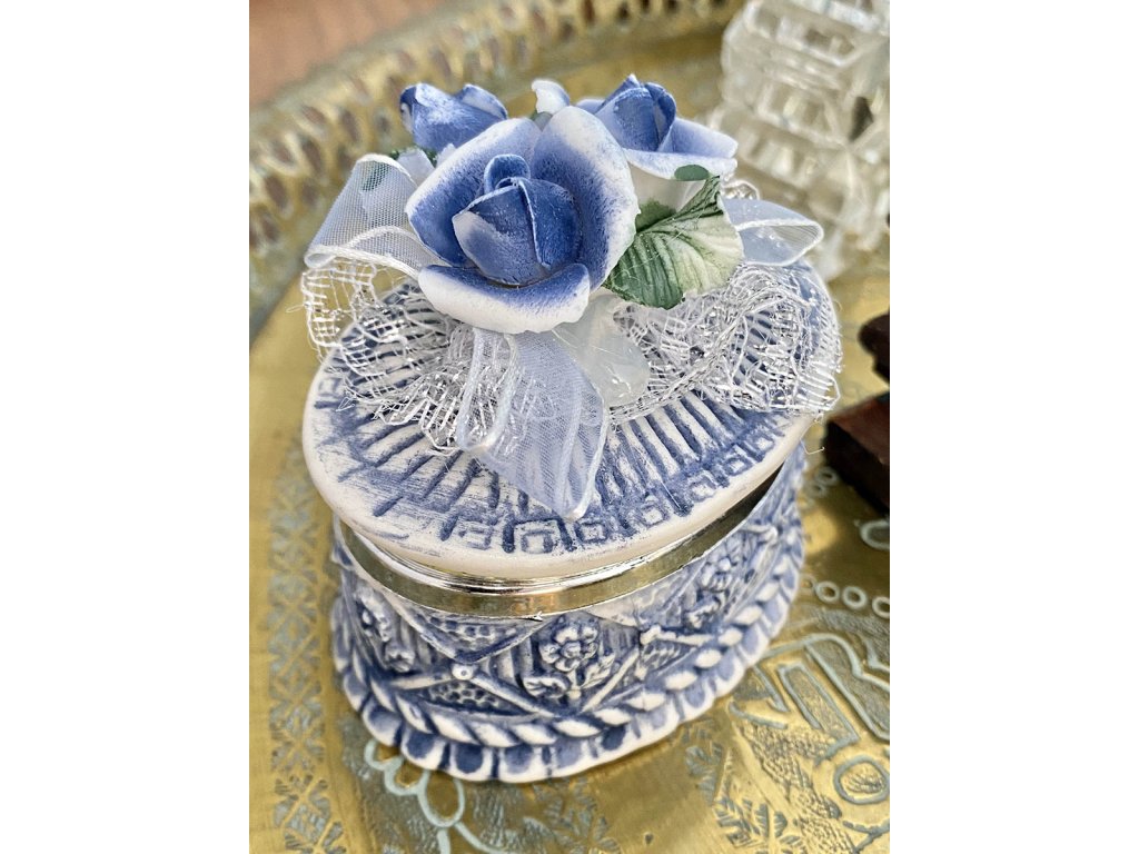 Dózička s růžemi Starožitná keramická dózička na šperky s růžemi a kovovým uzavíracím pantem. Výška bez ozdobné aplikace cca 4,5 cm Šířka cca 7 cm Hloubka cca 5,5 cmDoplňkové parametry