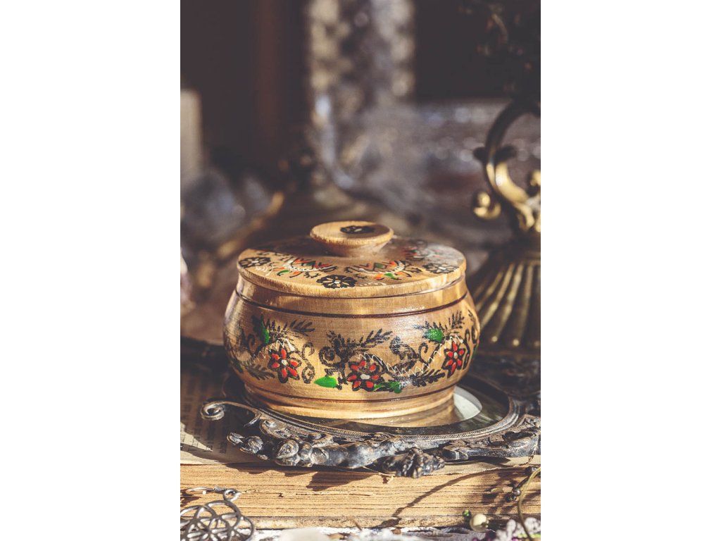 Dřevěná krabička na šperky Dřevěná velmi zachovalá starožitná krabička na šperky a jiné rozličnosti. Výška cca 4 cm Průměr cca 7,5 cm