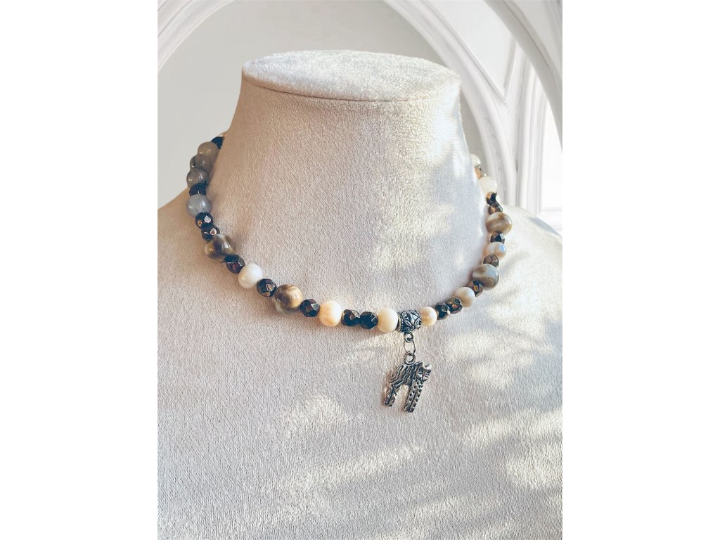 Druhý náhrdelník s kočkou Druhý náhrdelník s kočkou je fešácký obojek s říčníma perlama smetanového zabarvení, nalezených korálků z druhé ruky i mých oblíbených ohňovek od českých sklářů. Navlečeno na paměťový drátek. Přítomny jsou také acháty, ségra kočka a vzadu na zapínání sloník pro štěstí.Doplňkové parametry