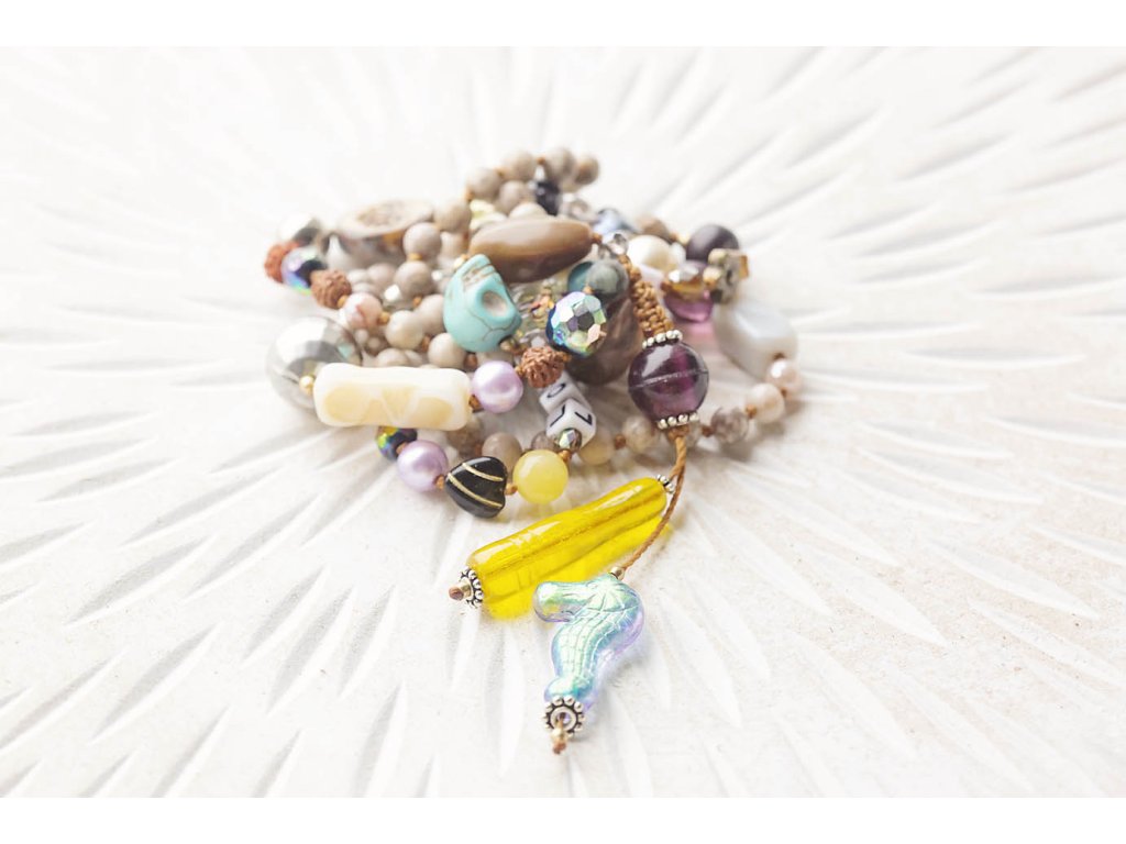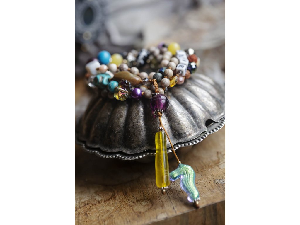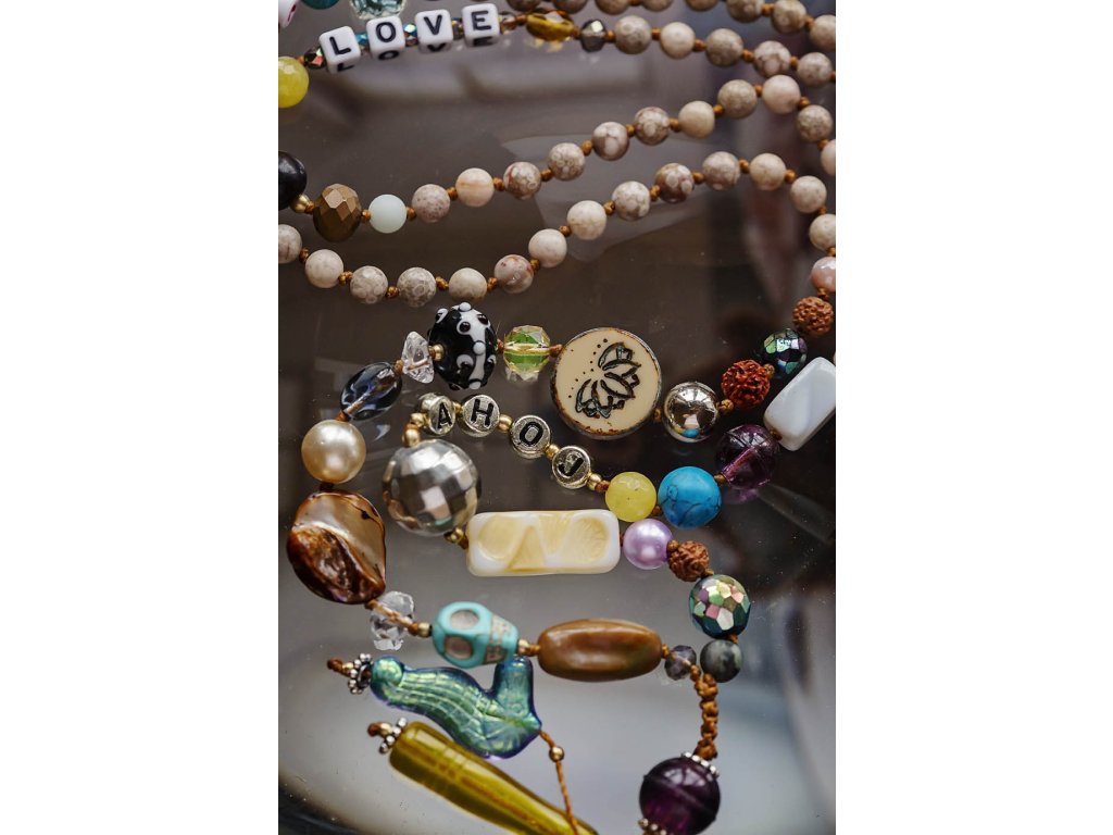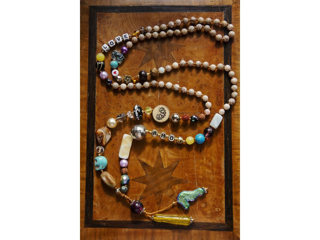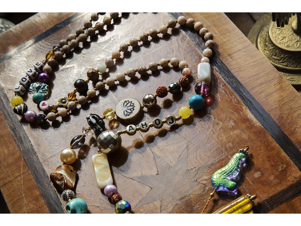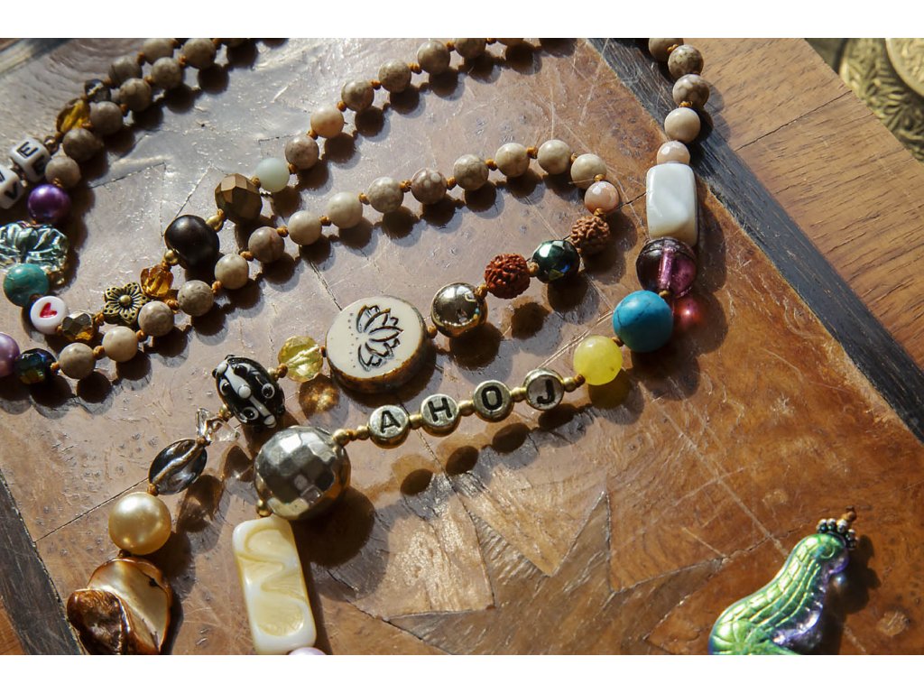 Harajuku mála 108 #6 Tohle je Harajuku mála 108 #5. Tvořit harajuku mály mne napadlo v létě 2025, když jsem přijela domu integrovat silné dojmy z Healing festivalu. Tu noc jsem měla sen, ve kterém navlékám na niť sbírku krásných korálků, hrály duhovými barvami a jejich rozličné tvary se třpytily na slunci jako vesmírné drahokamy. Korálky a vše blýskavé sbírám už snad od narození, možná proto, že mi připomínají svět, odkud jsem přišla. Duha, třpyt a blýskavé odlesky...něco na tom je, co možná nejenom mě připomíná pradávné "doma". Když jsem se probudila, věděla jsem, že chci navlékat mály z těchto korálků, hravé a barevné jako svět japonského pouličního stylu harajuku. Styl, ve kterém můžete po Tokyu chodit jako krajková panenka, jsem kdysi objevila v knihovně Langhans v jedné z mnoha těch úžasných fotografických knih, které knihovna Langhans nabízela k prohlédnutí. A tak vznikají mé barevné mály, které zaujmou oko, ale nezadají si ani s plnou funkčností pro lidi, co milují zpěv manter, stejně jako já. Navíc praxe s harajuku málou je obohacená o to, že díky rozmanitosti a odlišnosti tvaru korálků nás haptický vjem udžuje krásně v bdělosti. Představuji vám tu třetí harajuku málu laděnou do zemitých tónů s výrazně barevnými akcenty, požehnanou Lakshmí mantrou, hinduistickou bohyní prosperity a lásky. Kromě vintage korálků všemožného druhu na ní najdete i v nemalé míře zastoupené drahokamy, hlavně křepelčí kámen ve veikosti korálku 6mm.Doplňkové parametry