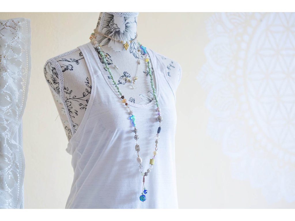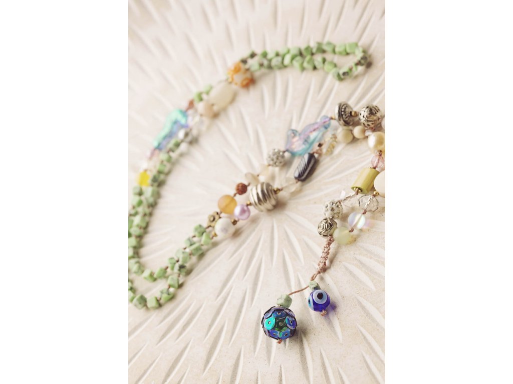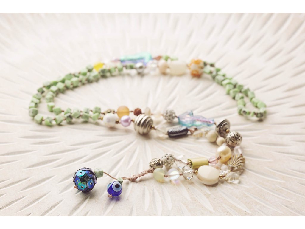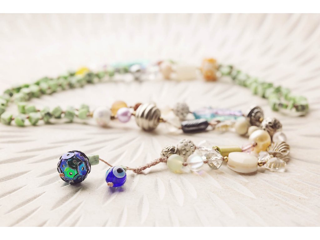 Harajuku mála 108 #7 Tohle je Harajuku mála 108 #7. Tvořit harajuku mály mne napadlo v létě 2025, když jsem přijela domu integrovat silné dojmy z Healing festivalu. Tu noc jsem měla sen, ve kterém navlékám na niť sbírku krásných korálků, hrály duhovými barvami a jejich rozličné tvary se třpytily na slunci jako vesmírné drahokamy. Korálky a vše blýskavé sbírám už snad od narození, možná proto, že mi připomínají svět, odkud jsem přišla. Duha, třpyt a blýskavé odlesky...něco na tom je, co možná nejenom mě připomíná pradávné "doma". Když jsem se probudila, věděla jsem, že chci navlékat mály z těchto korálků, hravé a barevné jako svět japonského pouličního stylu harajuku. Styl, ve kterém můžete po Tokyu chodit jako krajková panenka, jsem kdysi objevila v knihovně Langhans v jedné z mnoha těch úžasných fotografických knih, které knihovna Langhans nabízela k prohlédnutí. A tak vznikají mé barevné mály, které zaujmou oko, ale nezadají si ani s plnou funkčností pro lidi, co milují zpěv manter, stejně jako já. Navíc praxe s harajuku málou je obohacená o to, že díky rozmanitosti a odlišnosti tvaru korálků nás haptický vjem udžuje krásně v bdělosti. Představuji vám tu třetí harajuku málu laděnou do slastných odstínů a krásné řecké a mořské symboliky ostrova Korfu, požehnanou Lakshmí mantrou, hinduistickou bohyní prosperity a lásky. Kromě vintage korálků všemožného druhu na ní najdete i v nemalé míře zastoupené drahokamy, hlavně sekaný zelenkavý magnezit.Doplňkové parametry