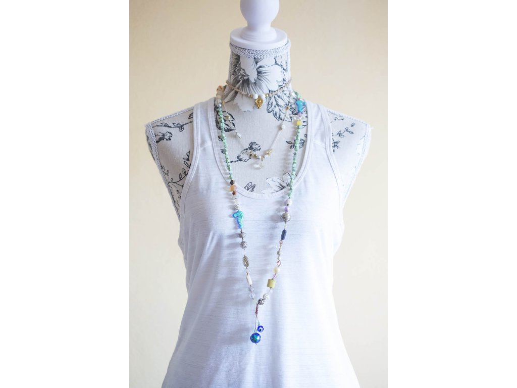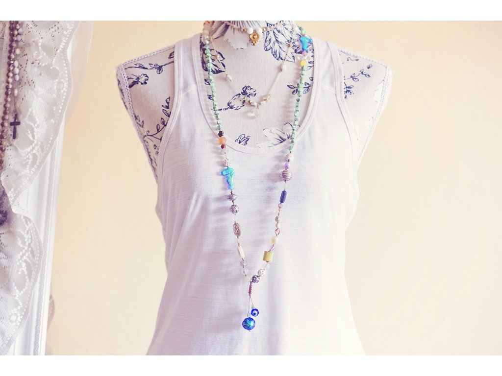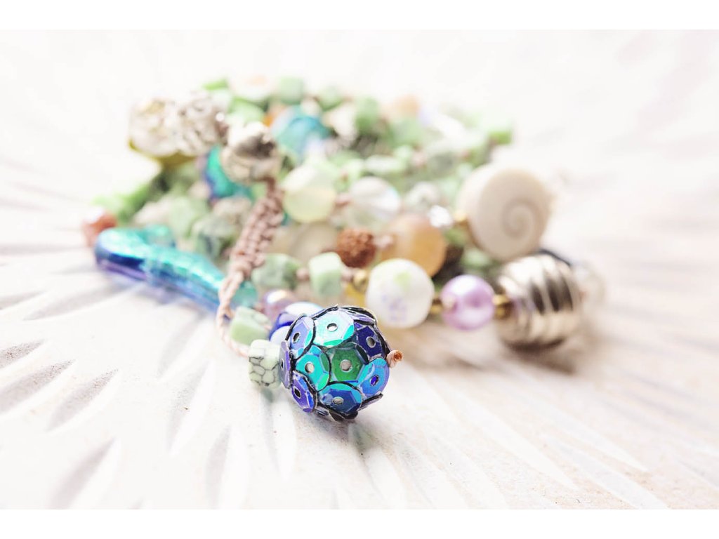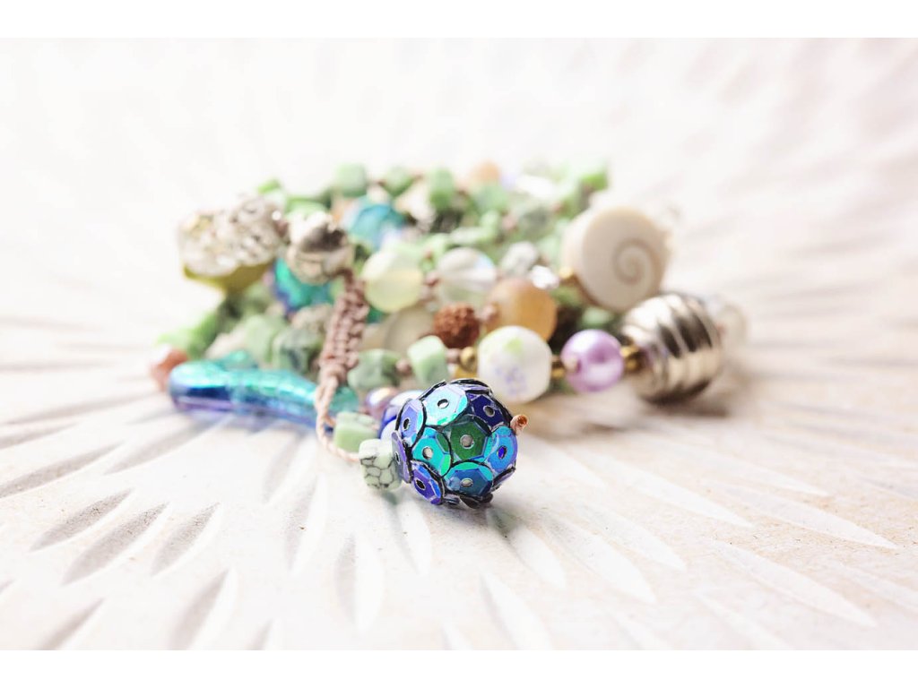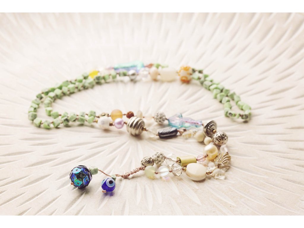 Harajuku mála 108 #7 Tohle je Harajuku mála 108 #7. Tvořit harajuku mály mne napadlo v létě 2025, když jsem přijela domu integrovat silné dojmy z Healing festivalu. Tu noc jsem měla sen, ve kterém navlékám na niť sbírku krásných korálků, hrály duhovými barvami a jejich rozličné tvary se třpytily na slunci jako vesmírné drahokamy. Korálky a vše blýskavé sbírám už snad od narození, možná proto, že mi připomínají svět, odkud jsem přišla. Duha, třpyt a blýskavé odlesky...něco na tom je, co možná nejenom mě připomíná pradávné "doma". Když jsem se probudila, věděla jsem, že chci navlékat mály z těchto korálků, hravé a barevné jako svět japonského pouličního stylu harajuku. Styl, ve kterém můžete po Tokyu chodit jako krajková panenka, jsem kdysi objevila v knihovně Langhans v jedné z mnoha těch úžasných fotografických knih, které knihovna Langhans nabízela k prohlédnutí. A tak vznikají mé barevné mály, které zaujmou oko, ale nezadají si ani s plnou funkčností pro lidi, co milují zpěv manter, stejně jako já. Navíc praxe s harajuku málou je obohacená o to, že díky rozmanitosti a odlišnosti tvaru korálků nás haptický vjem udžuje krásně v bdělosti. Představuji vám tu třetí harajuku málu laděnou do slastných odstínů a krásné řecké a mořské symboliky ostrova Korfu, požehnanou Lakshmí mantrou, hinduistickou bohyní prosperity a lásky. Kromě vintage korálků všemožného druhu na ní najdete i v nemalé míře zastoupené drahokamy, hlavně sekaný zelenkavý magnezit.Doplňkové parametry