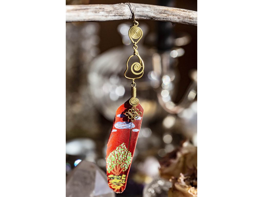 Indiánská náušnice s peříčkem Indiánská solitérní náušnice peříčko s malbou keře a oblaků. Peříčko je upevněné v překrásném mosazném závěsu. Šperk byl navržen a ručně vytvořen v dílně našeho milého přítele a kolegy, kečuánského indiána Arona. Jeho tvorba vychází z tradičních peruánských technik výroby šperků. Délka cca 15 cm Hmotnost náušnice cca 3 gDoplňkové parametry