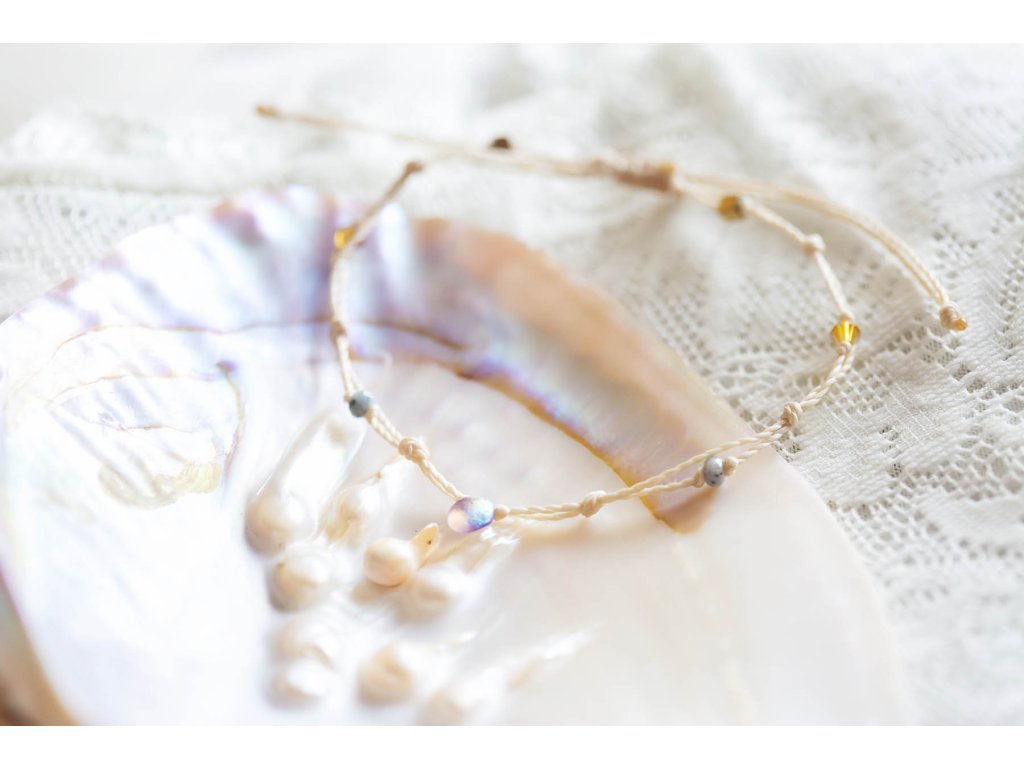 Jemný náramek na nohu Jemný náramek na nohu je meditativním výrobkem v nejvyšší jemnosti, co jsem asi dosáhla onoho léta. Jaká jednoduchost, jen uzlíky a pár kamíků...a přesto, ta krása se mi zdá nejvyšší...díky té jemnosti. Obsaženy jsou korálky od českých sklářů, hematit ve zlaté úpravě a krásně zelené přírodní jadeity. Velikost je nastavitelná díky macramé zámečku.Doplňkové parametry