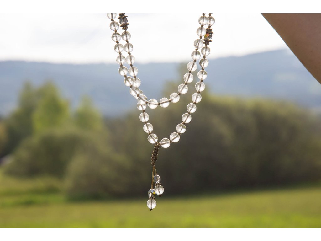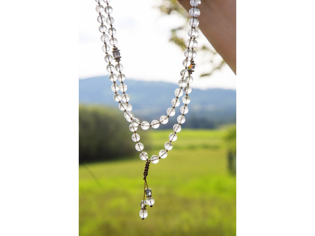 Křišťálová mála 108 Potřebujete jedinečný posilující a uklidňující šperk? Pak je tu tato přenádherná křišťálová mála. Je to úžasný náhrdelník a pro ty z vás, kdo rádi zpíváte mantry, má i praktický přínos. Já jí mám a nemůžu ji pustit z ruky (a krku). Křišťál je jedinečný kámen, který uvádí energii svého nositele do harmonie, zesiluje jí a tím povzbuzuje psychiku, jasnozřivost a samostatnost a sebezdokonalení. Ochraňuje před zlými a negativními silami. Harmonizuje, čistí a chrání auru a tím zajišťuje klidný spánek. Je vhodný pro meditace a magické účely. Obvod cca 60 cmDoplňkové parametry