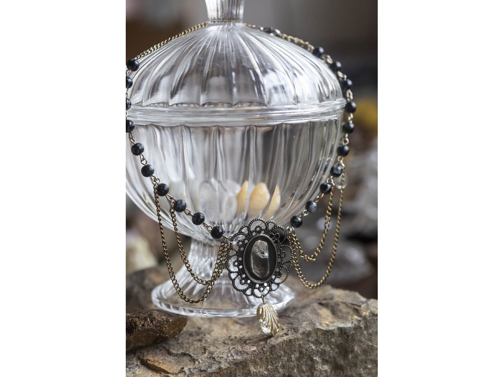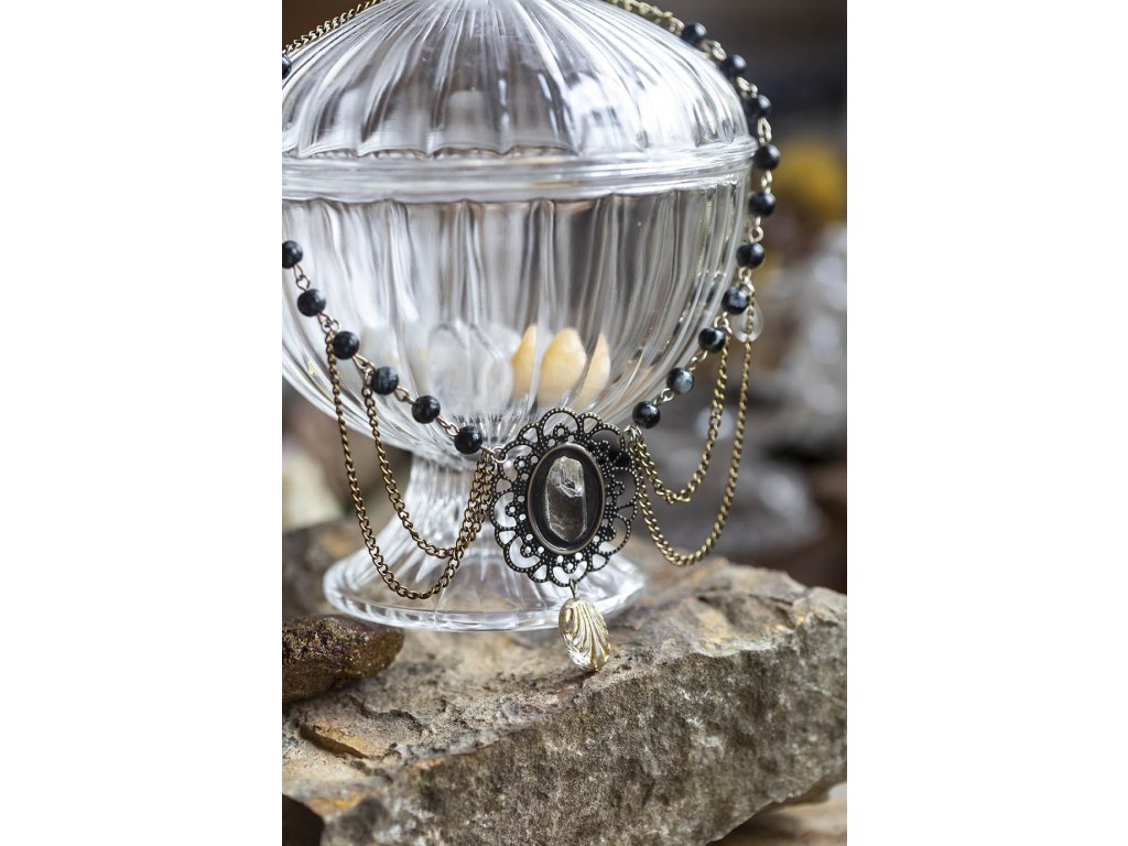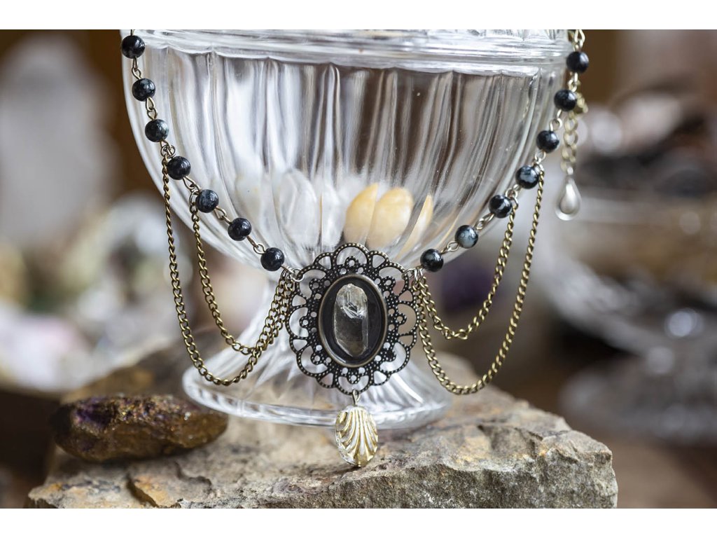 Magický náhrdelník Dalším ze série našich čarodějných šperků je tento magický náhrdelník, který je vytvořený z křišťálové drúzy v medailonku, starého růžence a korálku od českých sklářů. Je vhodný na slavnostní příležitosti, k magickým rituálům i k dennímu nošení. Křišťál je jedinečný kámen, který uvádí energii svého nositele do harmonie, zesiluje jí a tím povzbuzuje psychiku, jasnozřivost a samostatnost a sebezdokonalení. Ochraňuje před zlými a negativními silami. Harmonizuje, čistí a chrání auru a tím zajišťuje klidný spánek. Je vhodný pro meditace a magické účely. Maximální délka cca 46 cm, délka je nastavitelná Hmotnost cca 19 gDoplňkové parametry
