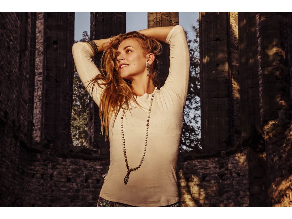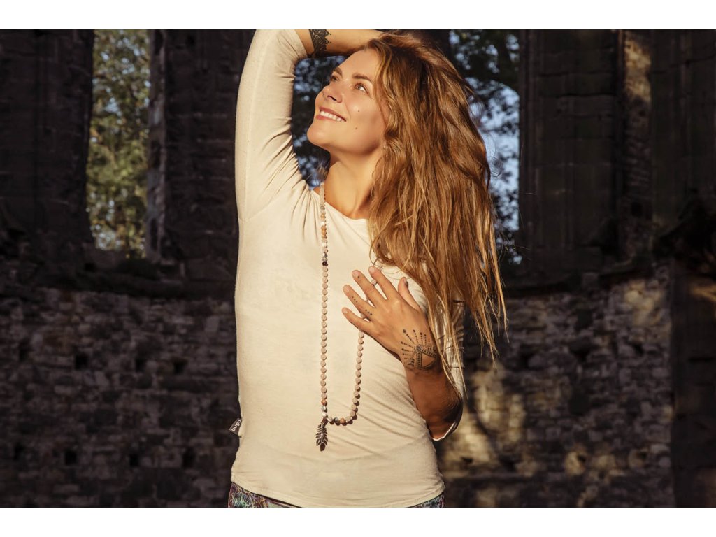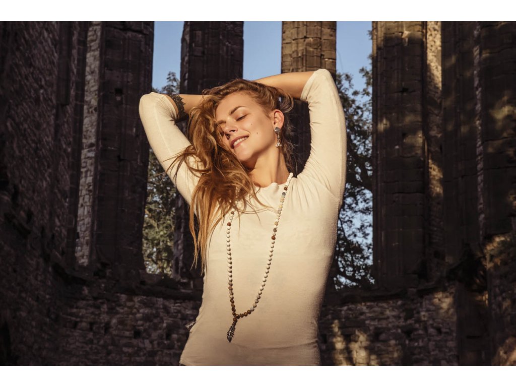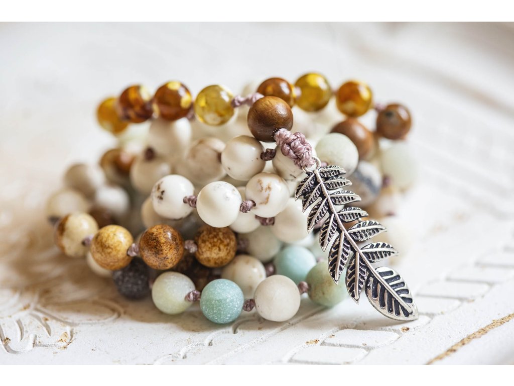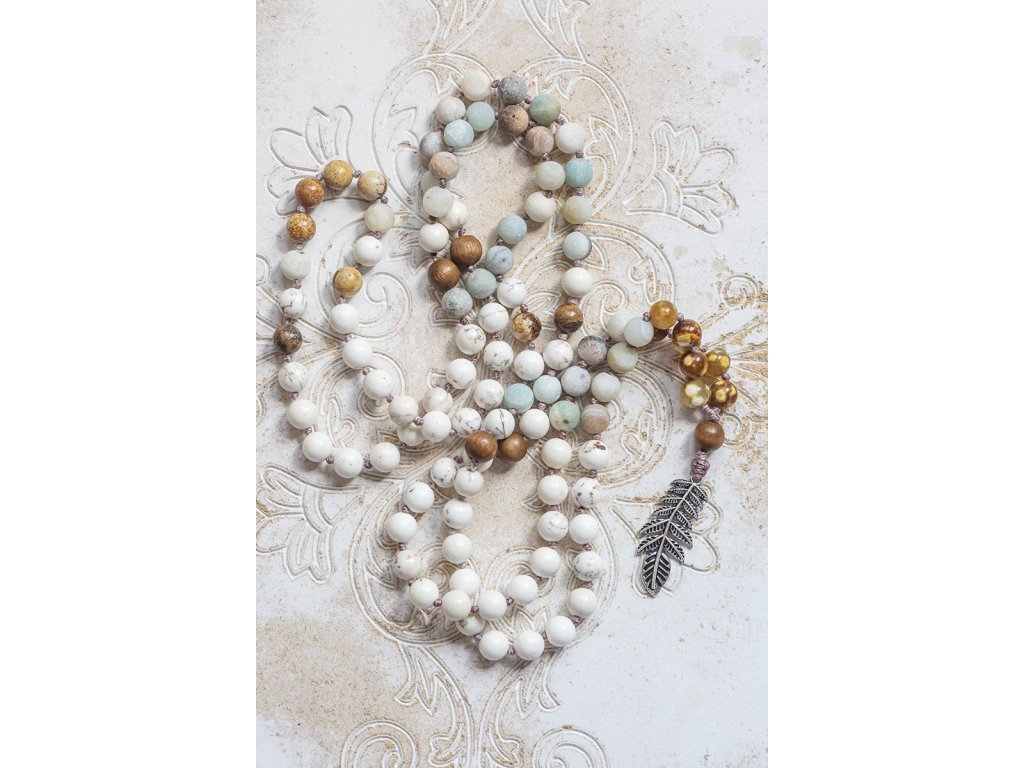 Mála 108 kapradina Překrásná mála 108 s kapradinou z bílého kovu je vytvořena za zpěvu manter ze tří druhů drahokamů a dřevěných korálků. Amazonit je kamenem úspěchu, klidu a intuice. Je mimořádně uklidňující a tiší nervový systém. Udržuje v rovnováze mužskou a ženskou energii, rozptyluje energie negativní a rozpouští bloky. Zmenšuje obavy a strach, zvyšuje intuici, pohlcuje škodlivé záření z mobilních telefonů. Zajišťuje úspěch při riskantních krocích. Podporuje vitalitu, udržuje rovnováhu v těle. Jaspis přináší do života klid, pomáhá ve stresu, uvádí do rovnováhy duševní i tělesnou stránku. Umožňuje dosahování cílů, tím že podporuje pronikavost vhledu na podstatu problému. Zvyšuje organizační schopnosti a schopnost dělat rychlá a správná rozhodnutí. Chrání před negativní energií. Je výborným pomocníkem v pracovním i soukromém životě. Magnezit je kámen, který se náramně hodí pro podporu zklidnění, chceme-li meditovat. Podporuje totiž soustředění, klid mysli a oproštění od myšlenek. Dále je vhodný při studiu a učení. Snižuje stres, podporuje rovnováhu, odevzdání a setrvání v neutrálu. Obvod cca 105 cmDoplňkové parametry