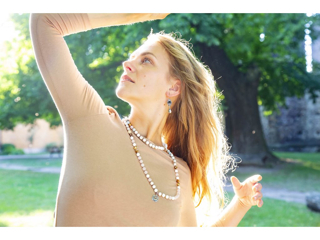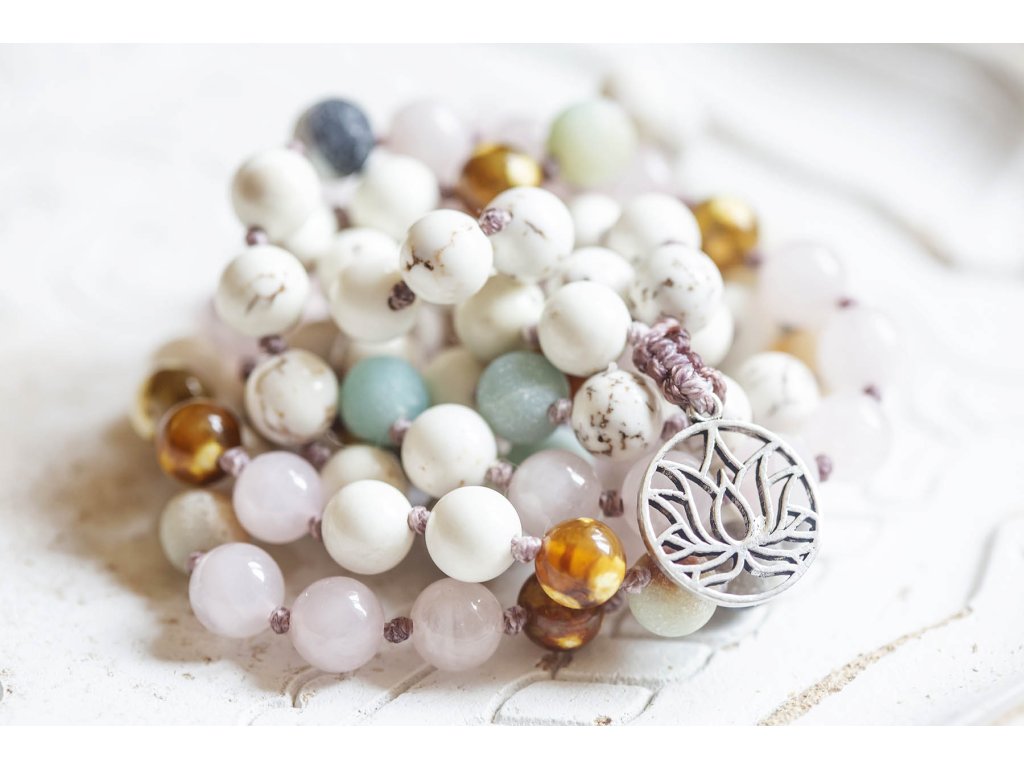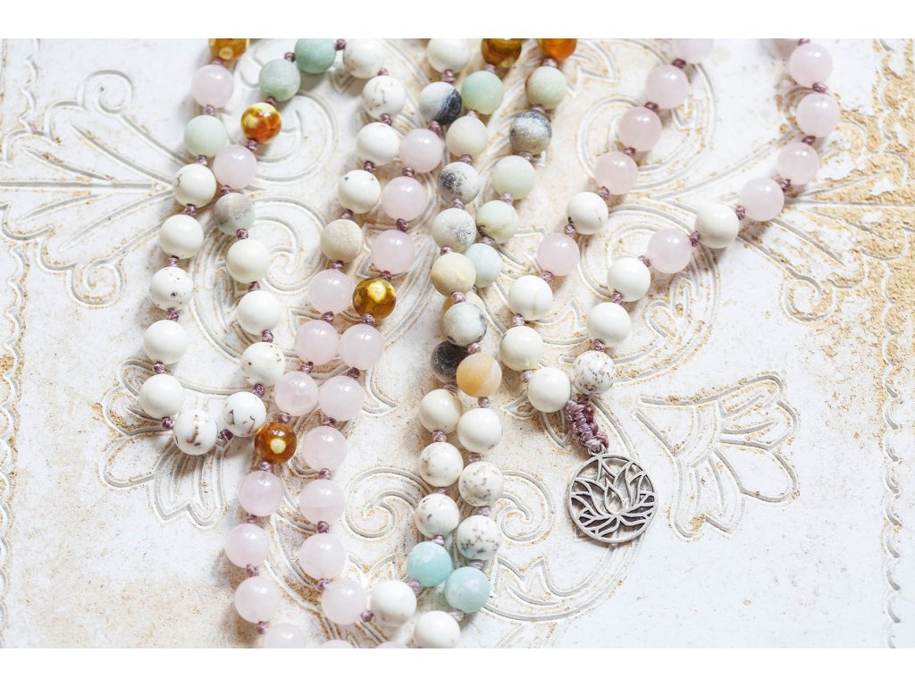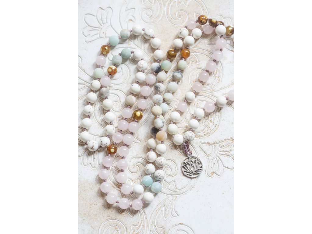 Mála 108 lotosový květ Překrásná mála 108 v pastelových barvách s lotosovým květem z bílého kovu je vytvořena za zpěvu manter ze čtyř druhů drahokamů. Amazonit je kamenem úspěchu, klidu a intuice. Je mimořádně uklidňující a tiší nervový systém. Udržuje v rovnováze mužskou a ženskou energii, rozptyluje energie negativní a rozpouští bloky. Zmenšuje obavy a strach, zvyšuje intuici, pohlcuje škodlivé záření z mobilních telefonů. Zajišťuje úspěch při riskantních krocích. Podporuje vitalitu, udržuje rovnováhu v těle. Jaspis přináší do života klid, pomáhá ve stresu, uvádí do rovnováhy duševní i tělesnou stránku. Umožňuje dosahování cílů, tím že podporuje pronikavost vhledu na podstatu problému. Zvyšuje organizační schopnosti a schopnost dělat rychlá a správná rozhodnutí. Chrání před negativní energií. Je výborným pomocníkem v pracovním i soukromém životě. Magnezit je kámen, který se náramně hodí pro podporu zklidnění, chceme-li meditovat. Podporuje totiž soustředění, klid mysli a oproštění od myšlenek. Dále je vhodný při studiu a učení. Snižuje stres, podporuje rovnováhu, odevzdání a setrvání v neutrálu. Růženín je kámen lásky. Pomáhá projevovat city, dodává lásku a krásu, podporuje něžnost, mírnost, přátelskost a nesobeckost. Podněcuje citlivost a vnímavost vůči ostatním i sobě samému, podporuje fantazii, inspiraci a tvořivost a trpělivost. Dává sílu k odpuštění, učí sebeúctě a sebelásce. S lotosem se často setkáváme v prastarých kulturách různých národů. Je symbolem znovuzrození, krásy, života, štěstí, čistoty a duchovnosti, jednoty mikro a makrokosmu, symbolem rovnováhy mužského a ženského počátku. Lotosový květ napomáhá zrození harmonie a lásky uvnitř nás. Obvod cca 105 cmDoplňkové parametry