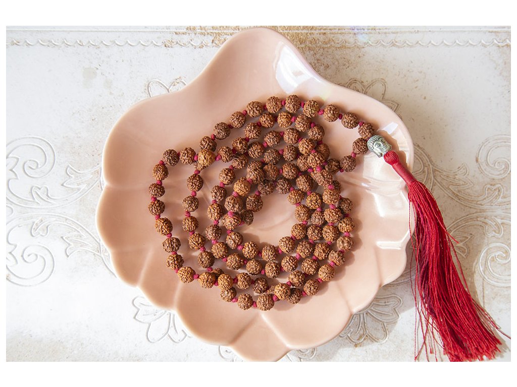 Mála 108 s červeným střapcem Pokud toužíte mít překrásný osobní šperk, který kromě toho, že vás ozobí, můžete použít při zpívání manter, kdekoliv se právě nacházíte, pořiďte si jednu z našich mál. Tato mála 108 s červeným střapcem je vytvořena ze světle hnědých semínek rudrakshy. Nad střapcem je korálek Budha.Doplňkové parametry