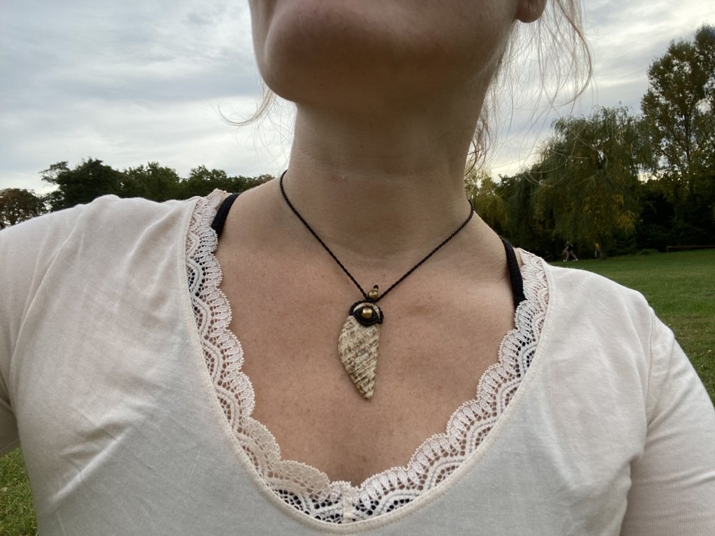 Náhrdelník aragonit Zajímavý náhrdelník s aragonitem a macramé šňůrkou ve tvaru dvoušroubovice DNA. Aragonit dokáže uzemňovat tělesnou energii, posiluje spojení se Matkou zemí a stabilizuje kořenovou čakru. Podporuje trpělivost a vstřícnost, potlačuje přecitlivělost. Lidem, kteří na sebe mají příliš velké nároky, pomůže naučit se delegovat část svých povinností na jiné. Je velmi vhodný do různých amuletů na dennodenní nošení.Doplňkové parametry