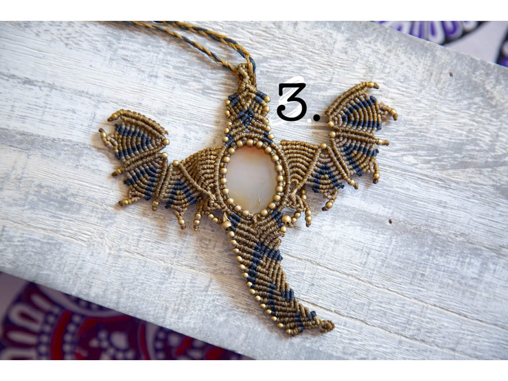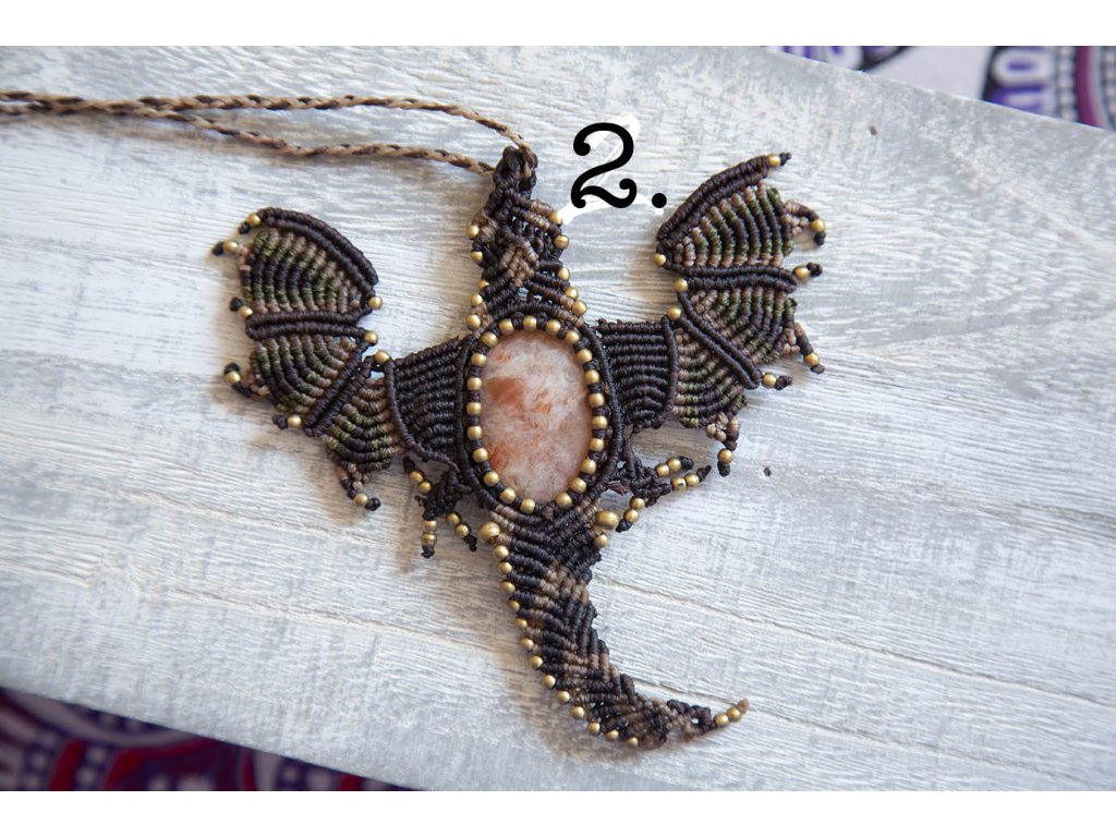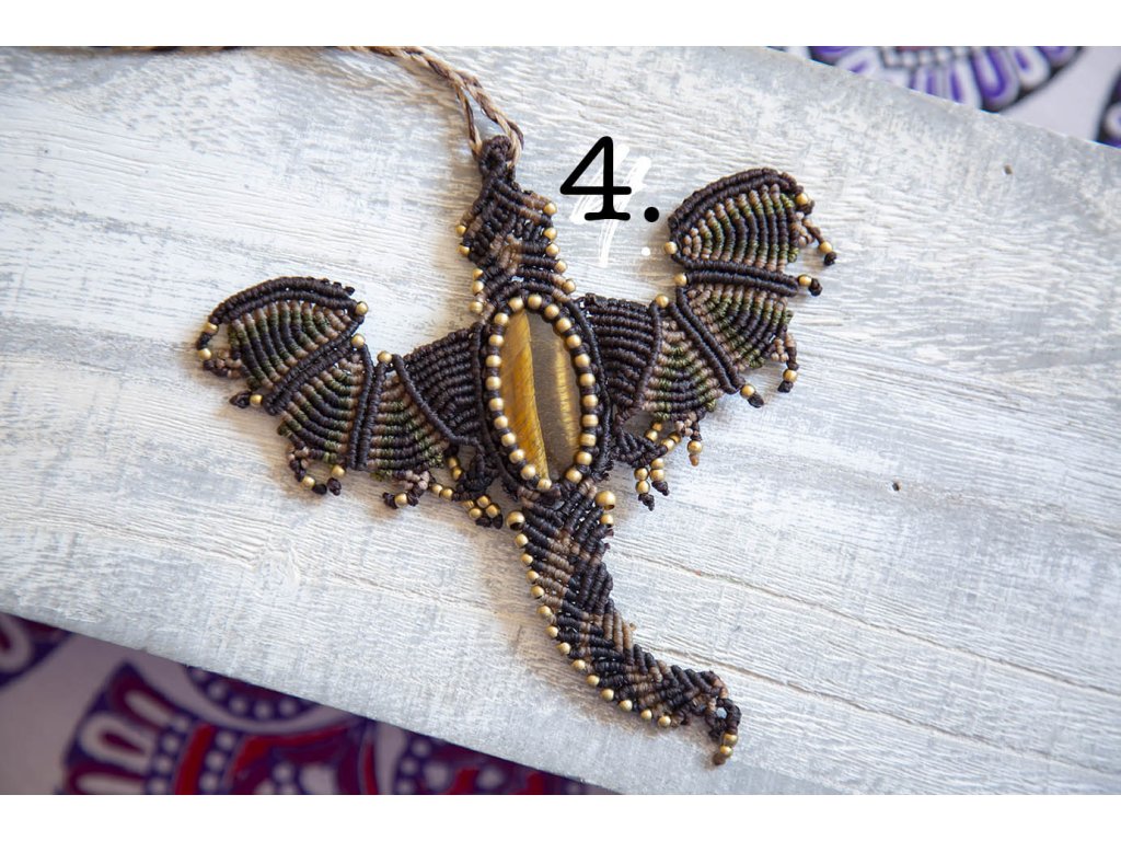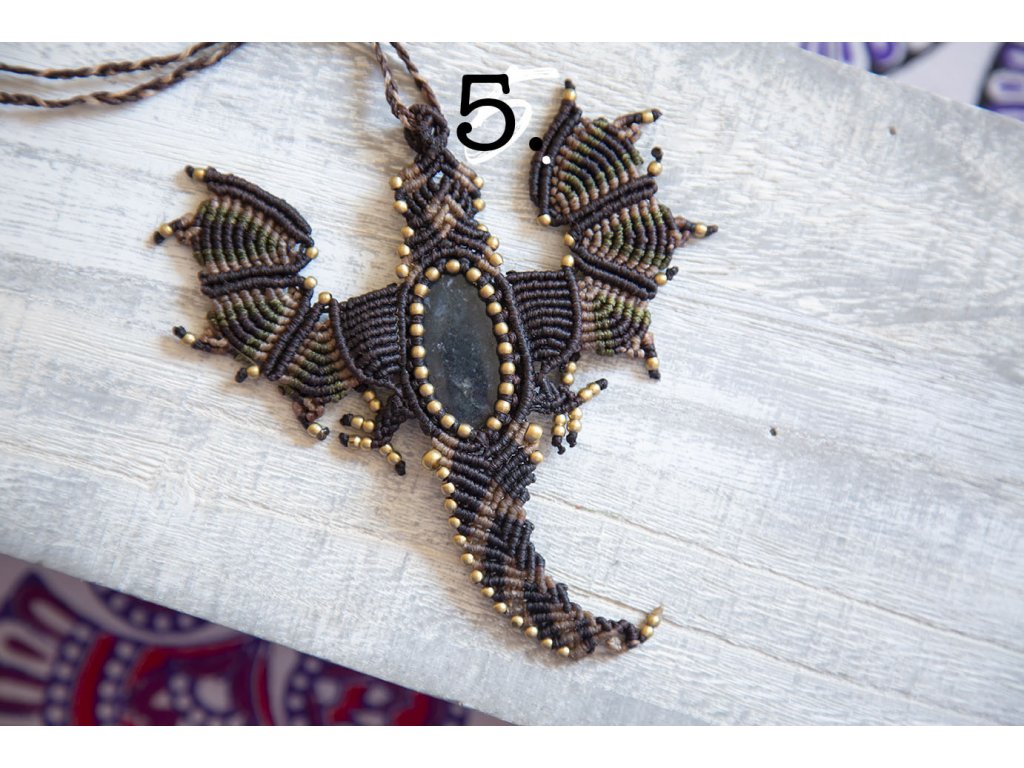 Náhrdelník Drak s drahokamem Jedinečný originální macramé náhrdelník ve tvaru letícího draka je nevšedním nádherným šperkem podtrhujícím vaši osobnost. Síla drahokamů násobí dračí sílu ukrytou ve šperku. Do objednávky napište číslo náhrdelníku, který jste vybrali: 2.Jaspis přináší do života klid, pomáhá ve stresu, uvádí do rovnováhy duševní i tělesnou stránku. Umožňuje dosahování cílů, tím že podporuje pronikavost vhledu na podstatu problému. Zvyšuje organizační schopnosti a schopnost dělat rychlá a správná rozhodnutí. Chrání před negativní energií. Je výborným pomocníkem v pracovním i soukromém životě. 3.Achát podporuje vnitřní stabilitu, vyrovnanost a zralost, pocit bezpečí a sebevědomí. Usnadňuje utřídění myšlenek, napomáhá při řešení složitých nebo komplikovaných úkolů. Ve vztazích podporuje věrnost a chápavost. Upevňuje rodinné a přátelské vztahy 4.Tygří oko je ochranný kámen, který se používá jako talisman před všemi formami nebezpečí. Propojuje sluneční a zemskou energii a tím pomáhá uzemnit lidi, kteří ztratili spojení s realitou a zároveň podporuje duchovní růst těch materialisticky zaměřených. Je to hřejivý kámen, podporuje tok energie v těle a dodává sílu, přitahuje peníze a prosperitu. Pomáhá s odbouráním závislostí na druhých uznáním vlastní hodnoty. Mírní deprese. 5. Lodolit je křišťál s inkluzemi. Často se o něm píše jako o „scénickém“ křišťálu, neboť inkluze různých minerálů v tomto křišťálu připomínají pohled oknem zelené zahrady či navozují obrazy vzdálených galaxií nebo podmořských korálových útesů. Odtud nese též označení „kámen zahrad“. A aby těch názvů tohoto nádherného kamene nebylo málo, často bývá nazýván „šamanským kamenem“, protože právě tento druh křišťálu mnozí léčitelé používají k navození vizionářské zkušenosti a pomoci při léčbě nemocí. Délka nastavitelná Rozpětí křídel cca 10-13 cm Hmotnost cca 30 gDoplňkové parametry