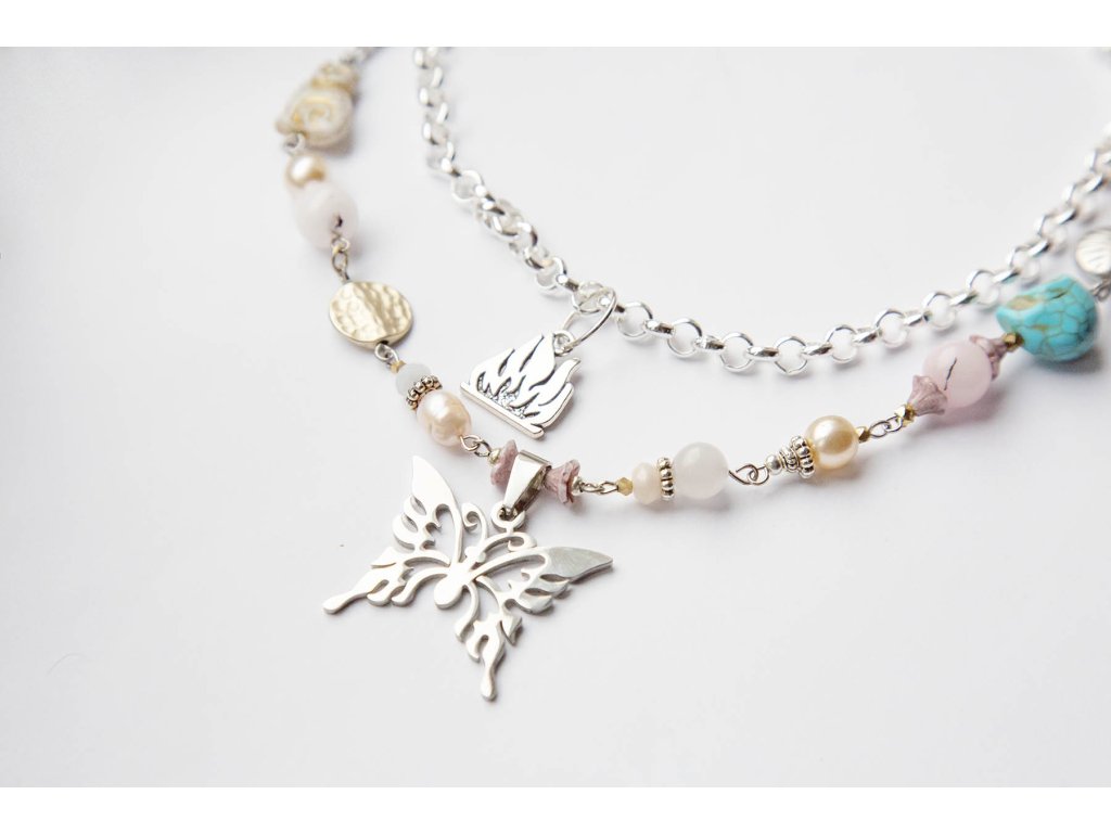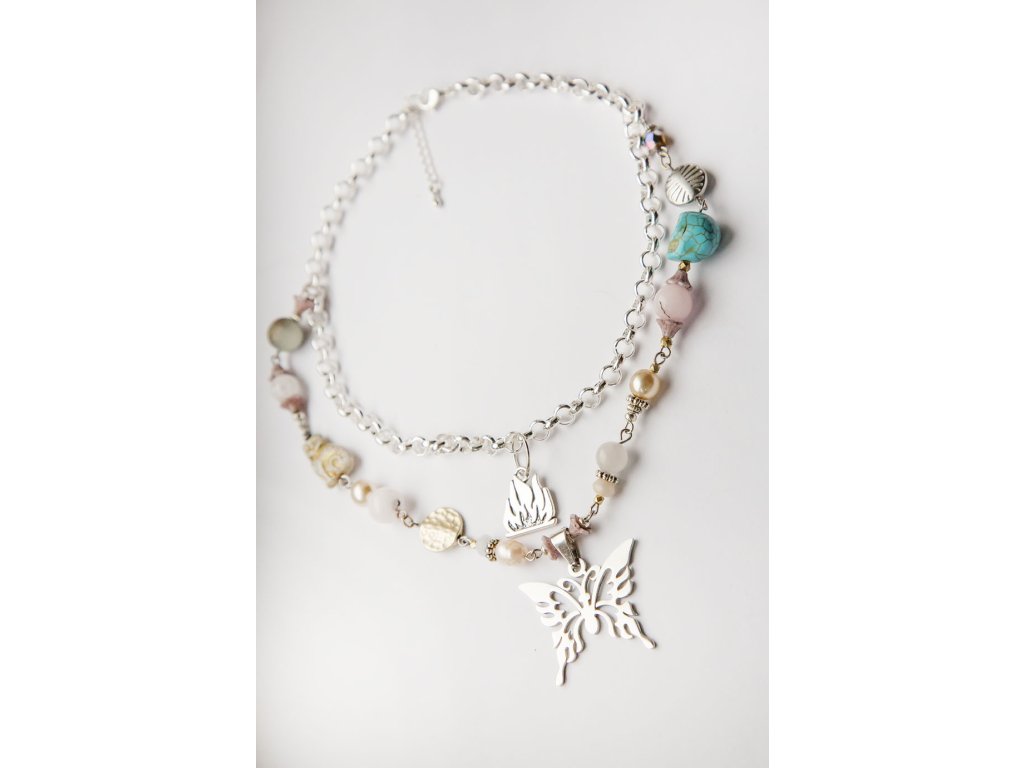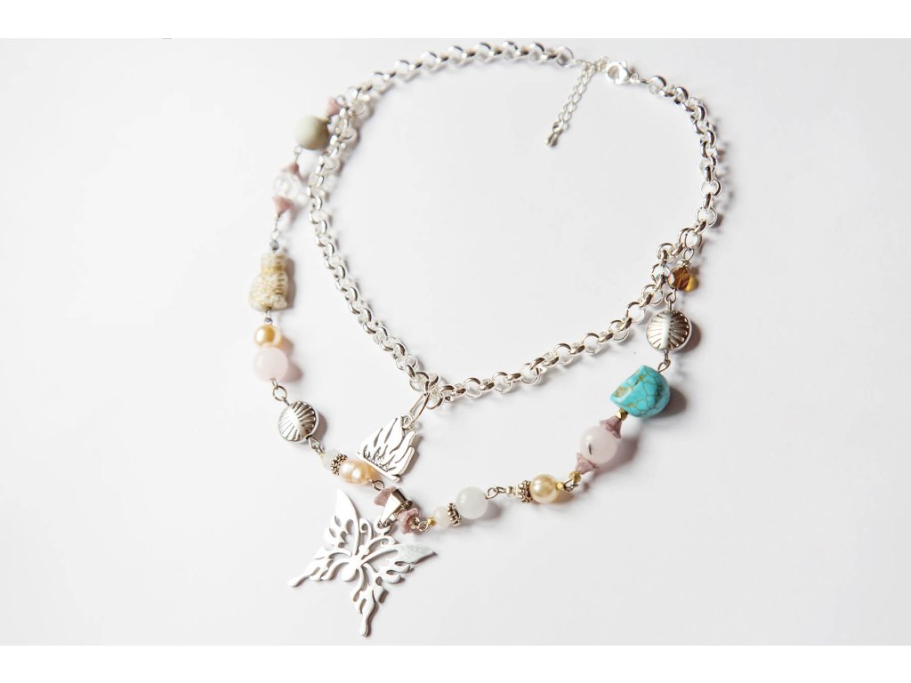 Náhrdelník harajuku motýl Rozehraj barvy své aury s tímto náhrdelníkem ve stylu pouliční módy harajuku. Náhrdelník je vytvořen z kovových komponentů, drahých kamenů a korálků od českých sklářů. V jeho středu je krásný nerezový motýl a symbol ohně. Nech se v pocitu zanést do ulic japonského Tokia, kde originalita a hravost vítězí. Tvá vzdušná kvalita to ocení. Achát podporuje vnitřní stabilitu, vyrovnanost a zralost, pocit bezpečí a sebevědomí. Usnadňuje třídění myšlenek, napomáhá při řešení komplikovaných úkolů. Ve vztazích podporuje věrnost a chápavost. Upevňuje rodinná a přátelská pouta. Amazonit je kamenem úspěchu, klidu a intuice. Je mimořádně uklidňující a tiší nervový systém. Udržuje v rovnováze mužskou a ženskou energii, rozptyluje energie negativní a rozpouští bloky. Zmenšuje obavy a strach, zvyšuje intuici, pohlcuje škodlivé záření z mobilních telefonů. Zajišťuje úspěch při riskantních krocích. Podporuje vitalitu, udržuje rovnováhu v těle. Křišťál je jedinečný kámen, který uvádí energii svého nositele do harmonie, zesiluje jí a tím povzbuzuje psychiku, jasnozřivost a samostatnost a sebezdokonalení. Ochraňuje před zlými a negativními silami. Harmonizuje, čistí a chrání auru a tím zajišťuje klidný spánek. Je vhodný pro meditace a magické účely. Perly vnášejí do života rovnováhu, racionalitu a zabraňují negativním vlivům. Perla vám bude sloužit jako osobní ochranný amulet, posílí vaší intuici a vůli dosáhnout vytyčených cílů. Jsou také symbolem moci, hojnosti a bohatství, které ale může mít, jak víme, mnohou podobu... Růženín je kámen lásky. Pomáhá projevovat city, dodává lásku a krásu, podporuje něžnost, mírnost, přátelskost a nesobeckost. Podněcuje citlivost a vnímavost vůči ostatním i sobě samému, podporuje fantazii, inspiraci a tvořivost a trpělivost. Dává sílu k odpuštění, učí sebeúctě a sebelásce. Délka cca 40 cm Hmotnost cca 46 g Další náhrdelníky najdete zde.Doplňkové parametry
