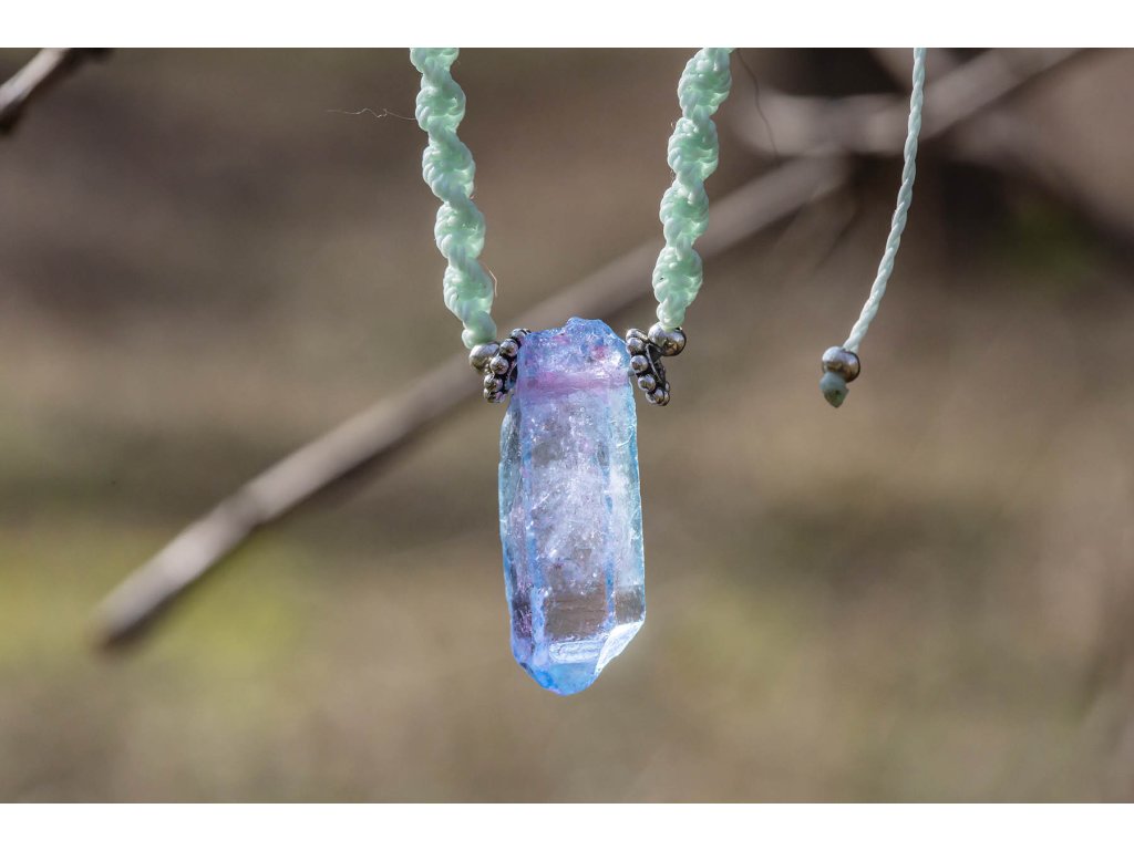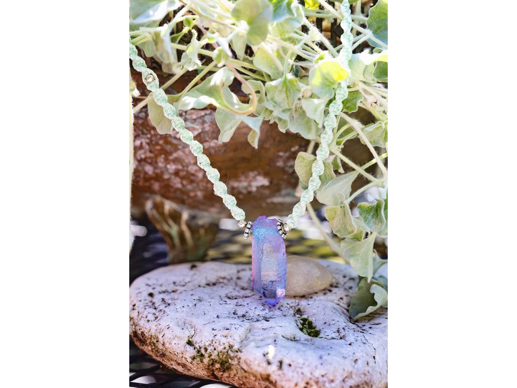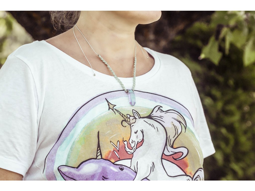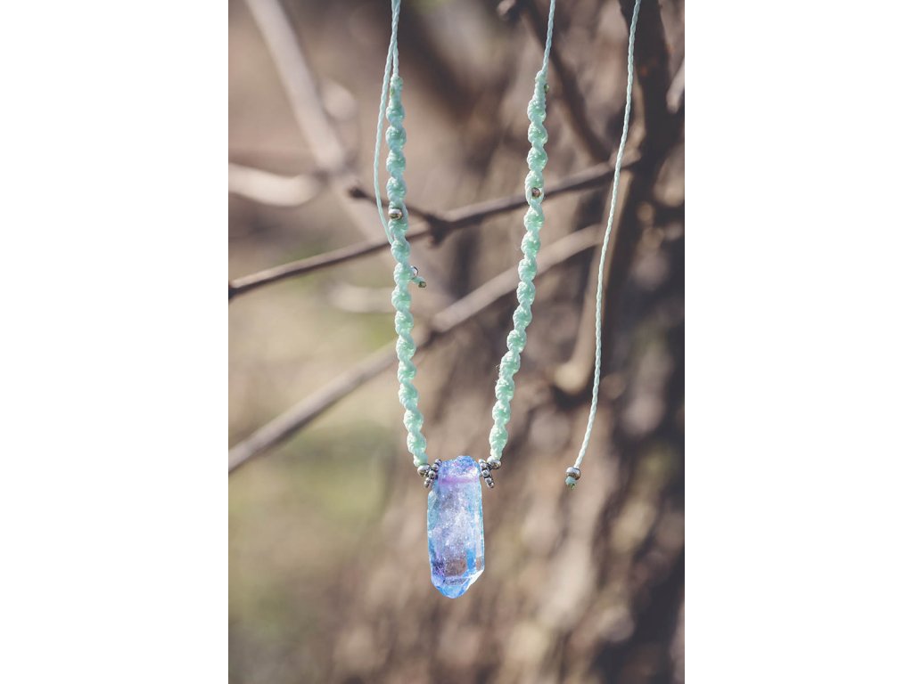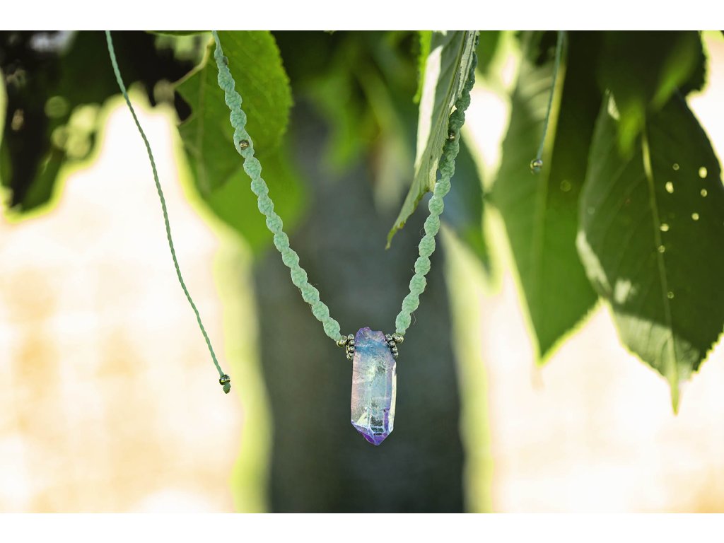 Náhrdelník macramé s křišťálem Náhrdelník macramé v mentolové barvě s duhovým křišťálem. Křišťál je jedinečný kámen, který uvádí energii svého nositele do harmonie, zesiluje jí a tím povzbuzuje psychiku, jasnozřivost a samostatnost a sebezdokonalení. Ochraňuje před zlými a negativními silami. Harmonizuje, čistí a chrání auru a tím zajišťuje klidný spánek. Je vhodný pro meditace a magické účely. Délka je nastavitelná pomocí macramé zámečku.Doplňkové parametry