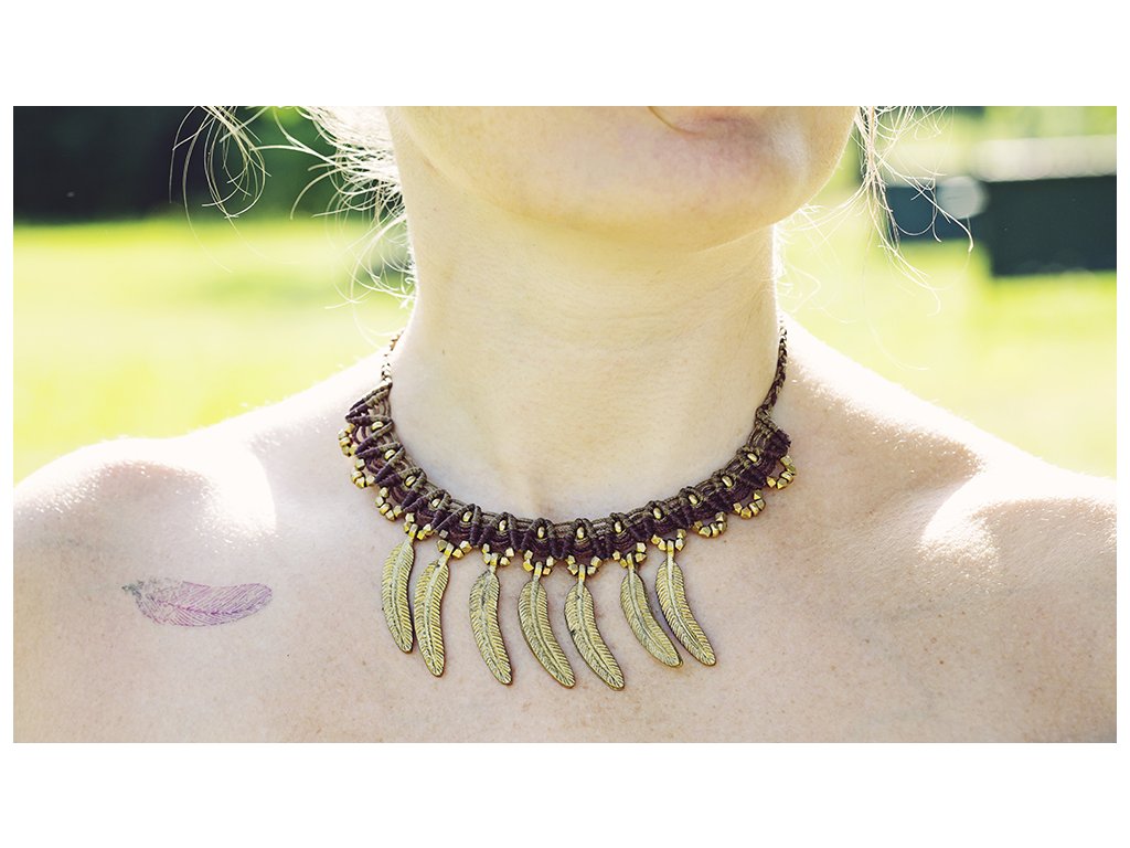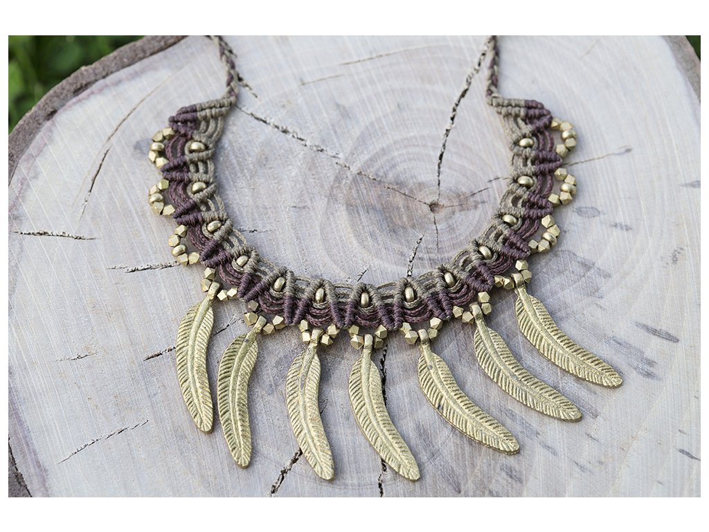 Náhrdelník macramé s mosaznými pírky Každý šperk macramé je originální jedinečný ručně vyrobený kus. Tento náhrdelník je ozdoben mosaznými pírky. Jedná se o kvalitní mosaz, která nečerná. Velmi krásný etno šperk pro jedinečnou ženu. Délka: NastavitelnáDoplňkové parametry