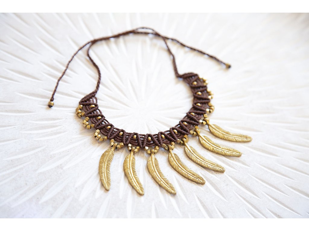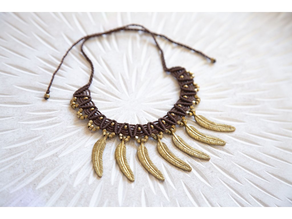 Náhrdelník macramé s pírky Macramé náhrdelník s mosaznými pírky. Každý výrobek macramé je jedinečný originál. Délka je nastavitelná.