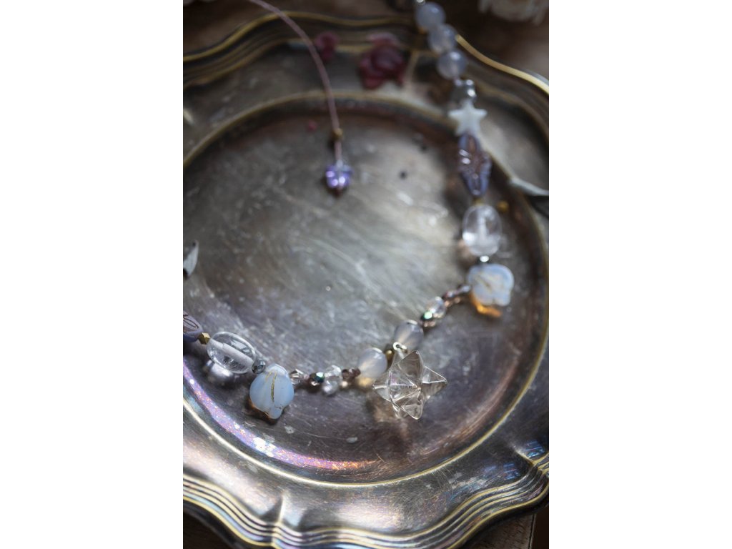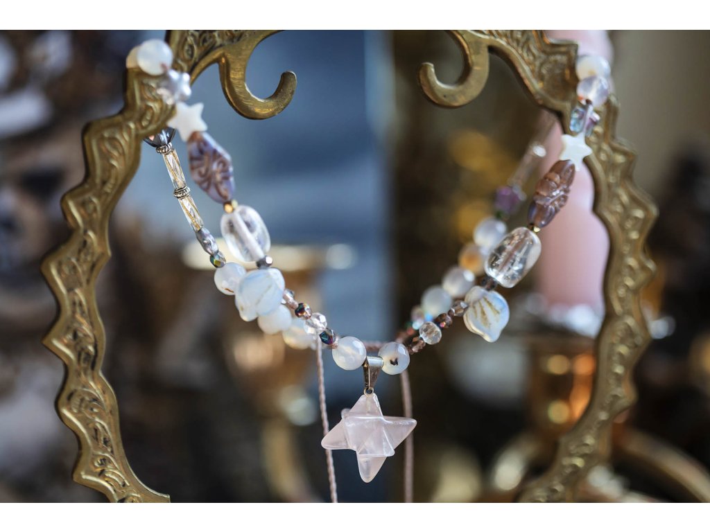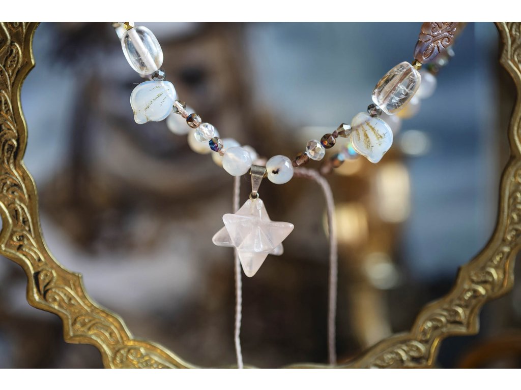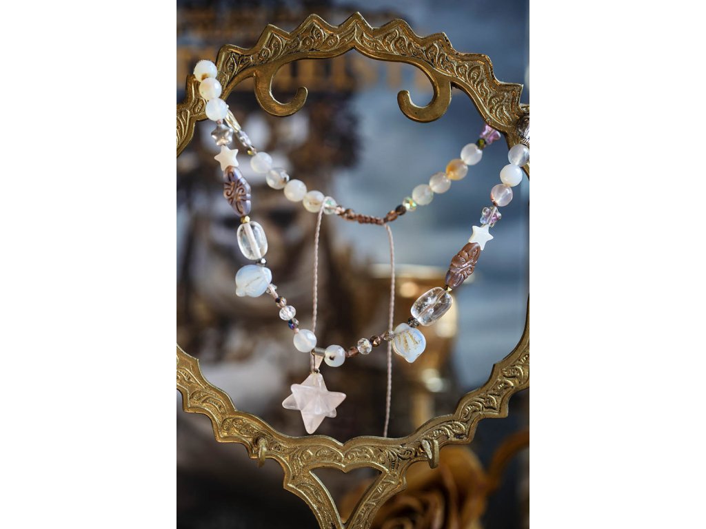 Náhrdelník mezigalaktické rady Molekulární struktura krystalů s vysoko vibrační frekvencí uvádí svého nositele bezprostředně do meditativní pravdy o tomto světě a světech jiných. Tento náhrdelník mezigalaktické rady má ve svém srdci mocný prostorový zářič metatron. Na výběr je mléčně růžový růženín a průsvitný kouřový křišťál. Dále v něm najdete achát, křišťál, perleťové hvězdičky a skleněné korálky od českých sklářů. Metatron je v judaismu jméno andělského vládce a knížete kůru serafínů, kteří slouží u Božího trůnu. Je znám též jako kníže moudrosti. Je to horlivý, energický anděl, který neúnavně pracuje na tom, aby pomáhal obyvatelům země. Dokáže nás podpořit při překonání váhavosti, kdy je třeba udělat jasné razantní kroky. Je rovněž průvodcem dětí, kterým pomáhá a vede je. Podporu u něj najdou zejména děti s poruchou soustředěnosti /ADD/ nebo poruchou pozornosti s hyper aktivitou /ADHD/. Pomáhá nejen jim, ale i jejich rodičům a vychovatelům. Achát podporuje vnitřní stabilitu, vyrovnanost a zralost, pocit bezpečí a sebevědomí. Usnadňuje třídění myšlenek, napomáhá při řešení komplikovaných úkolů. Ve vztazích podporuje věrnost a chápavost. Upevňuje rodinná a přátelská pouta. Křišťál je jedinečný kámen, který uvádí energii svého nositele do harmonie, zesiluje jí a tím povzbuzuje psychiku, jasnozřivost a samostatnost a sebezdokonalení. Ochraňuje před zlými a negativními silami. Harmonizuje, čistí a chrání auru a tím zajišťuje klidný spánek. Je vhodný pro meditace a magické účely. Růženín je kámen lásky. Pomáhá projevovat city, dodává lásku a krásu, podporuje něžnost, mírnost, přátelskost a nesobeckost. Podněcuje citlivost a vnímavost vůči ostatním i sobě samému, podporuje fantazii, inspiraci a tvořivost a trpělivost. Dává sílu k odpuštění, učí sebeúctě a sebelásce. Délka nastavitelné pomocí macramé zámečku.Buďte první, kdo napíše příspěvek k této položce.
