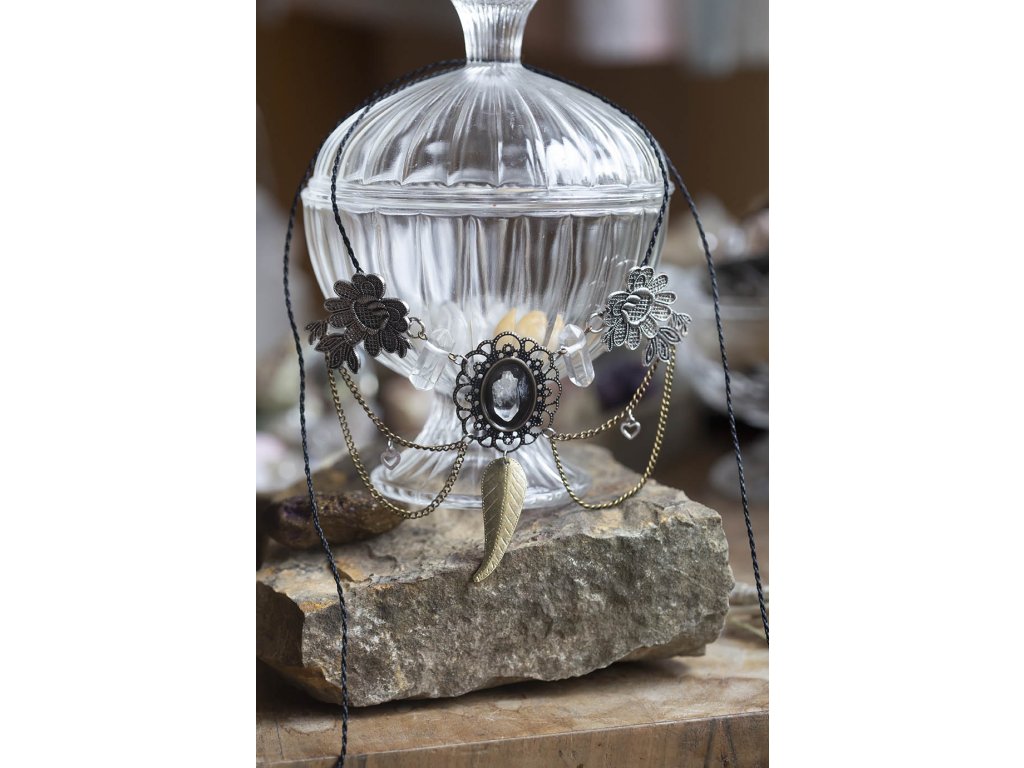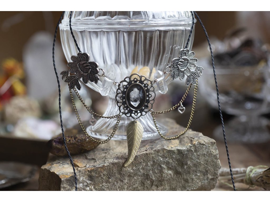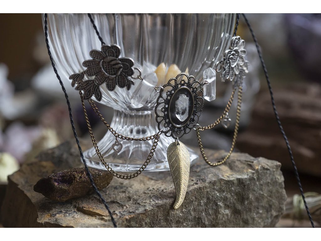 Náhrdelník Morgana Legenda o Artušovi říká, že Morgan le Fay byla zlá čarodějka, která zpočátku svému polovičnímu bratru Artušovi škodila, ale nakonec se usmířili a doprovázela ho na jeho poslední cestě do Avalonu. Můžeme si snadno představit, že tento magický náhrdelník je z její šperkovnice. Je vytvořen z kovových komponentů. Ve středu dominuje křišťál a mosazný lístek. Vše je na macramé šňůrce s možností nastavit délku. Křišťál je jedinečný kámen, který uvádí energii svého nositele do harmonie, zesiluje jí a tím povzbuzuje psychiku, jasnozřivost a samostatnost a sebezdokonalení. Ochraňuje před zlými a negativními silami. Harmonizuje, čistí a chrání auru a tím zajišťuje klidný spánek. Je vhodný pro meditace a magické účely. Hmotnost cca 30 gDoplňkové parametry