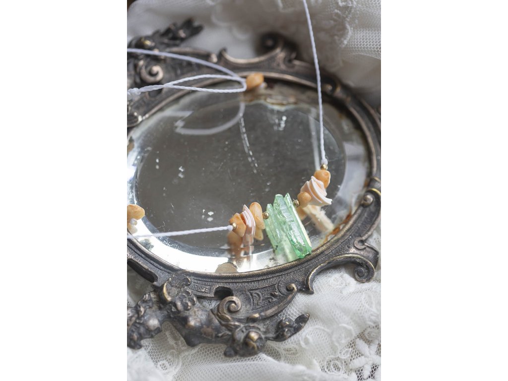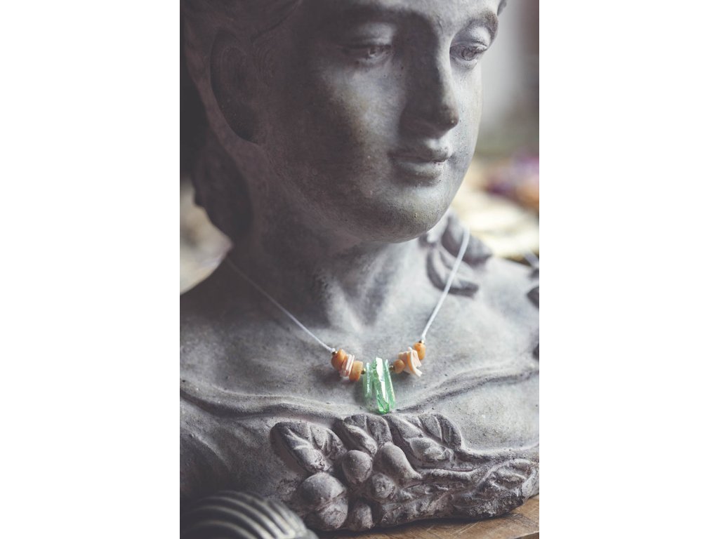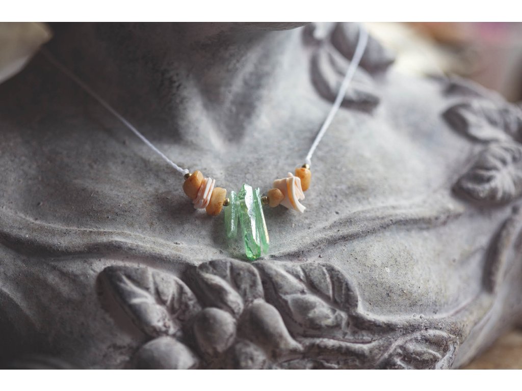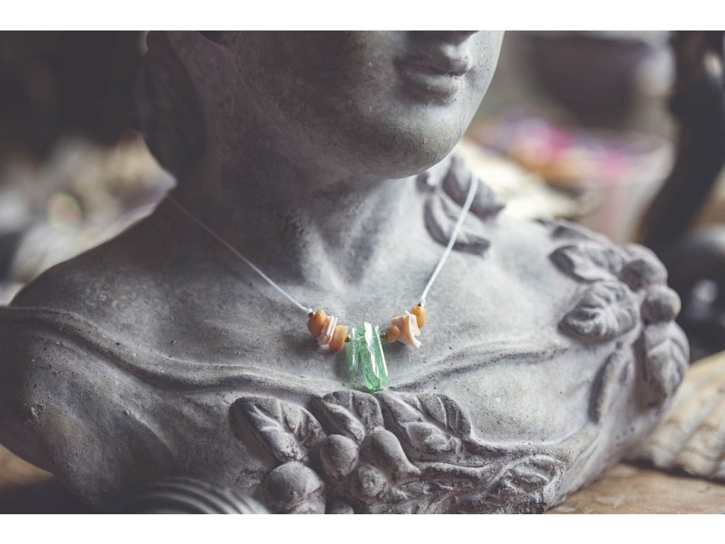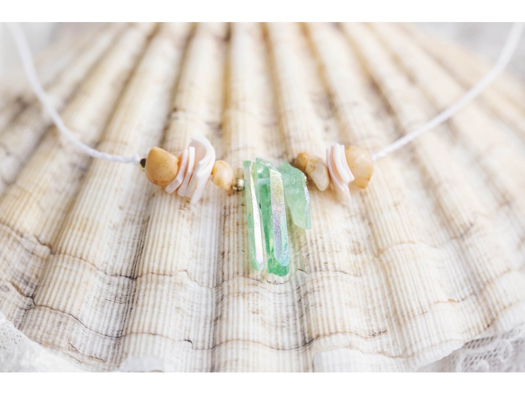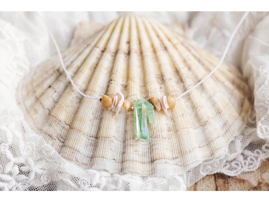 Náhrdelník Mořská panna: Symbol spojení s mořem a ženskou silou Jste ta mořská panna, kterou ve svých úvahách popisuje skvělá Jana Radová? Ta žena s vlastností bytosti z šíře mořského pobřeží a z hloubky tichého oceánu? Tak to jste tu dobře. Navlékněte náhrdelník s křišťály nefritové barvy, úlomky mušliček a zlomky slunečního kamene a odlehčete svou chůzi po zemi... Ta krása všude kolem za tu pouť přece stojí. Probuďte mořskou pannu ve svém srdci s náhrdelníkem plným mořské magie: Jedinečný design: Náhrdelník je vyroben z křišťálů nefritové barvy, úlomků mušliček a zlomků slunečního kamene a osloví všechny milovnice moře a mořských panen. Skvěle se hodí do setu s náramkem Mořská panna. Spojení s mořem: Náhrdelník symbolizuje spojení s mořem a jeho tajemnou krásou. Přináší klid, mír a pocit harmonie. Mořská energie: Náhrdelník evokuje sílu a majestátnost moře a dodává vám sílu a odvahu překonávat překážky. Ženská síla: Náhrdelník oslavuje ženskou sílu a krásu a podporuje spojení s vnitřní bohyní. Vlastnosti drahokamů: Křišťál obarvený nefritovou zelení: Kámen klidu a harmonie. Podporuje duchovní růst, meditaci a spojení s vnitřní moudrostí. Mušle: Symbol moře, ženskosti a plodnosti. Podporuje intuici a vnímavost. Sluneční kámen: Kámen radosti a optimismu. Dodává energii, vitalitu a podporuje sebevědomí. Náhrdelník pro Mořskou pannu je: Ručně vyrobený s láskou Dodávaný v dárkové krabičce Perfektní dárek pro sebe i pro milovnice moře, mořských panen, šperků s duchovním významem a symbolů ženské síly a krásy Symbol moře, krásy, klidu, harmonie, duchovního růstu, ženskosti a síly Tip: Náhrdelník skvěle doplní letní oblečení a plážové outfity, ale také se hodí k běžnému oblečení pro dodání nádechu mořské energie a ženské elegance. Velikost je nastavitelná pomocí macramé zámečku. Proč si vybrat náhrdelník pro Mořskou pannu? Podporujete ruční práci a lokální řemeslo. Vlastníte originální a jedinečný kousek. Nosíte šperk s hlubokou symbolikou a duchovním významem. Kupujete si dárek vyrobený s láskou a péčí. Probuďte mořskou pannu ve svém srdci a oslavte ženskou sílu a krásu s náhrdelníkem pro Mořskou pannu!Doplňkové parametry