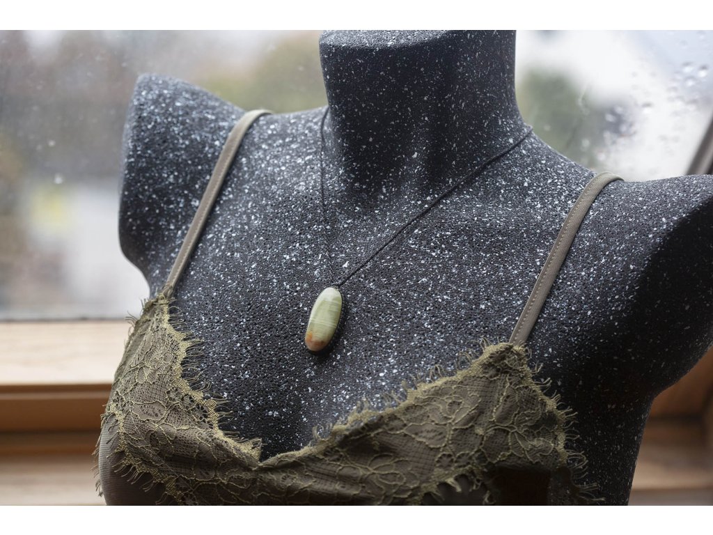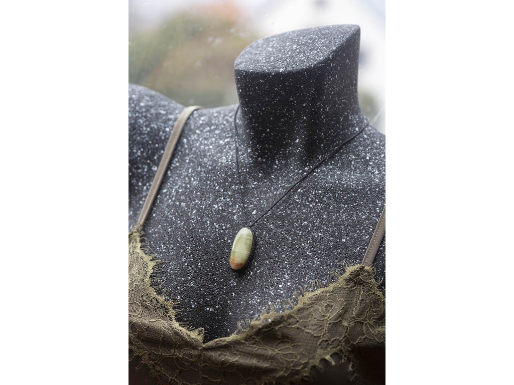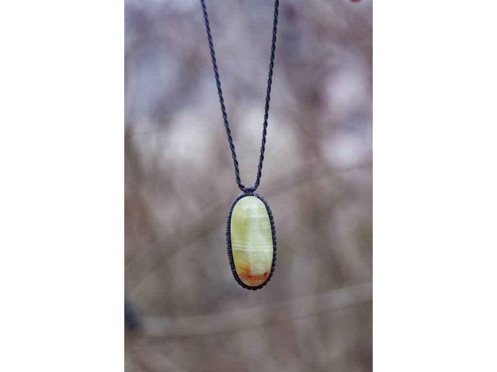 Náhrdelník onyx Tajemný žíhaný onyx v macramé okruží - to je tento překrásný náhrdelník , který může sloužit i jako amulet, předmět, do kterého vložíte vaše posilující zdroje. Onyx je ochranný kámen, který odráží negativitu vědomě namířenou proti vám. Chrání život, dodává sílu, pomáhá v těžkých obdobích, při mimořádném fyzickém a citovém vypětí. Zaměřuje energii jedním směrem, přináší ráznost a vytrvalost, dovoluje svému nositeli stát se pánem svého osudu. Poskytuje poučení z minulosti, zvyšuje sebedůvěru a sebekontrolu, léčí stará traumata ovlivňující současný život a snižuje strach a obavy. Udržuje v těle rovnováhu energií jin a jang. Délka nastavitelná pomocí macramé zámečku. Rozměry kamene cca 1,5 x 3,5 cm Hmotnost cca 12 gDoplňkové parametry