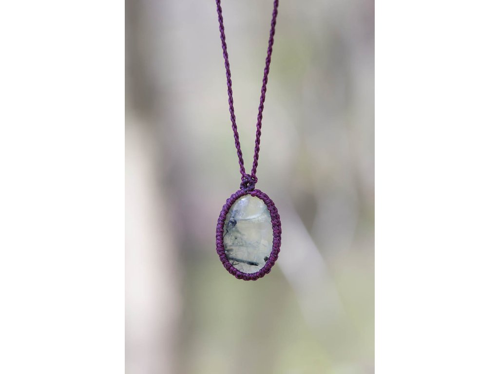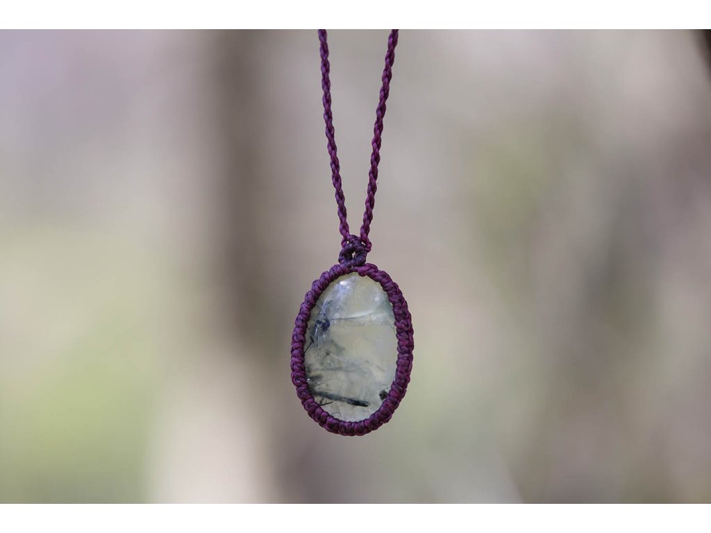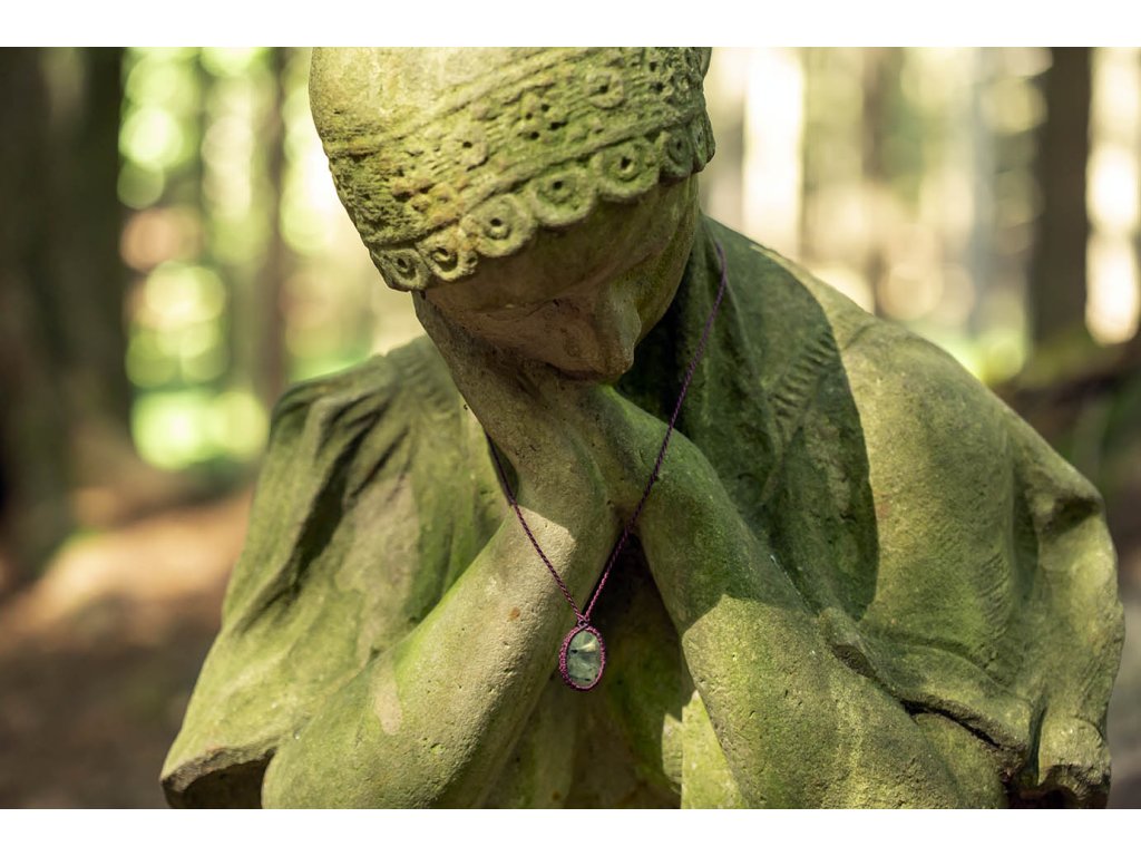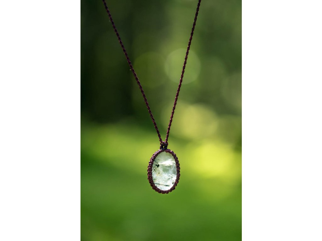 Náhrdelník prehnit s epidotem Jemný náhrdelník tvořený tmavě bordovým macramé opletením a pravidelným průsvitným lehce zeleným prehnitem s tmavšími výkvěty epidotu. Šperk byl navržen a ručně vytvořen v dílně našeho milého přítele a kolegy, kečuánského indiána Arona. Jeho tvorba vychází z tradičních peruánských technik výroby šperků. Prehnit s inkluzemi epidotu je zázračný kámen, který má posilující účinky na naši duši a napomáhá nám pochopit podstatu bezpodmínečné lásky. Epidot zesiluje naši vnímavost a intuici. Toto spojení přináší do srdce štěstí a klid do mysli. Je vhodný ke zklidnění a posílení po náročných životních obdobích. Délka se dá upravit pomocí macramé zámečku. Rozměry kamene cca 1,7 x 2,6 cm Hmotnost cca 8 gDoplňkové parametry