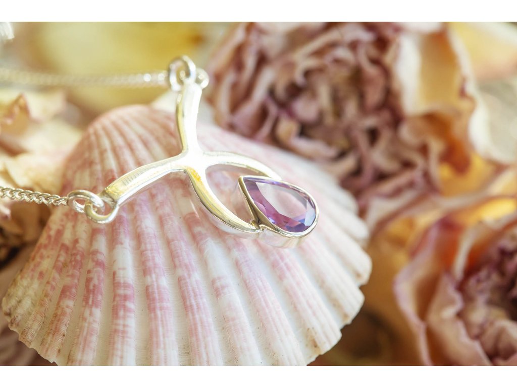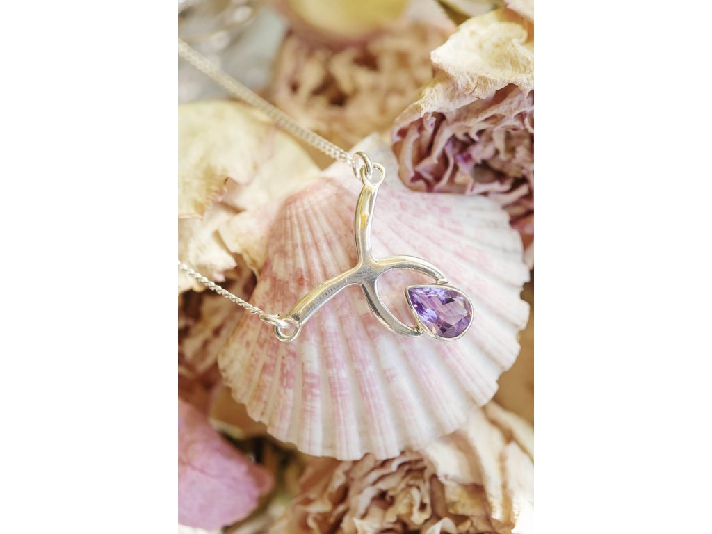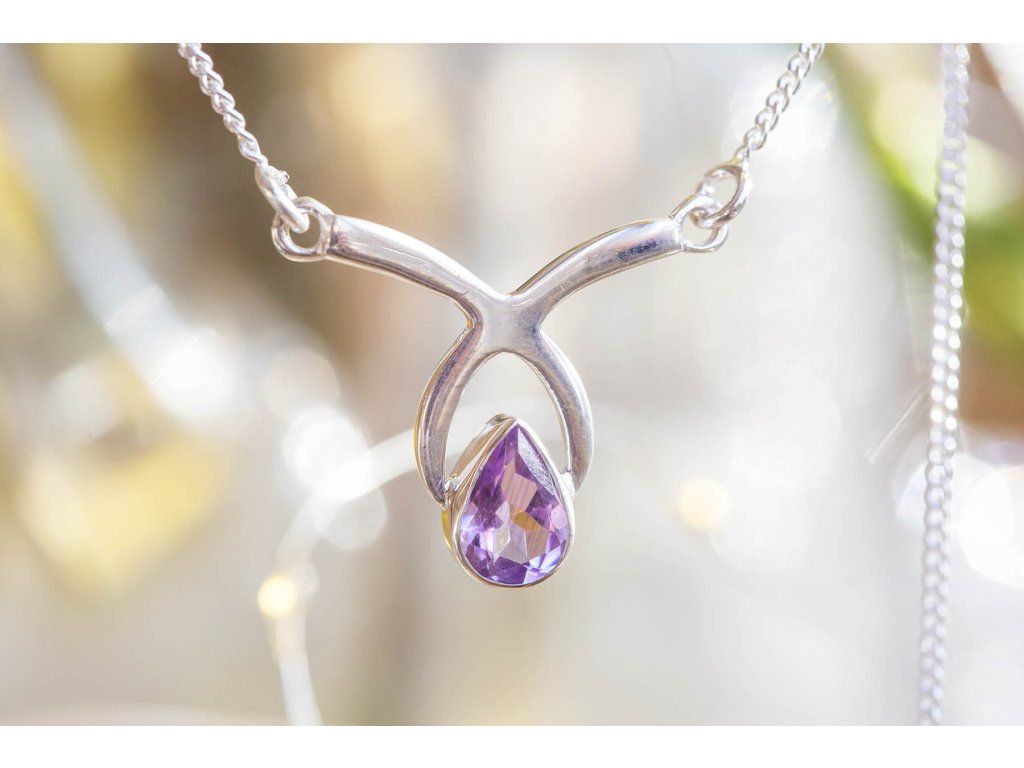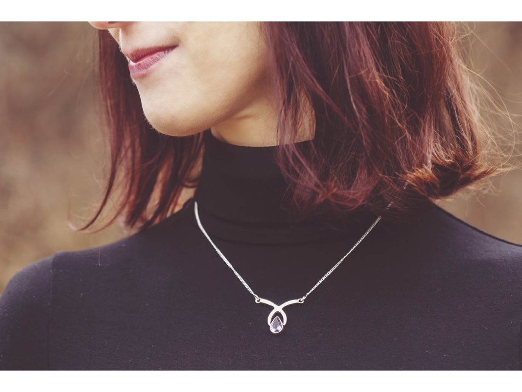 Náhrdelník s ametystem Překrásný stříbrný náhrdelník s fasetovaným ametystem. Jemný a elegantní šperk pro ozdobu vašeho dekoltu. Další šperky s ametystem najdete zde. Ametyst je kamenem čistoty ducha a meditace. Pomáhá nám v sobě objevovat sebeobětování, lásku, pokoru a nezištnost. Těmito vlastnostmi nám otevírá cestu do jiných dimenzí bytí. Je to kámen inspirace, směřuje naše myšlení k tvořivé práci a probouzí v nás intuici. Více o ametystu se dočtete na našem blogu. Rozměry kamene 0,7 x 1 cm Obvod lze upravit, maximální možná délka cca 45 cm Hmotnost cca 5 g Materiál kov: Stříbro Ag 925/1000Doplňkové parametry