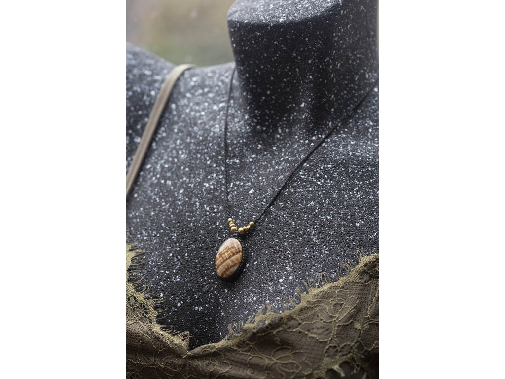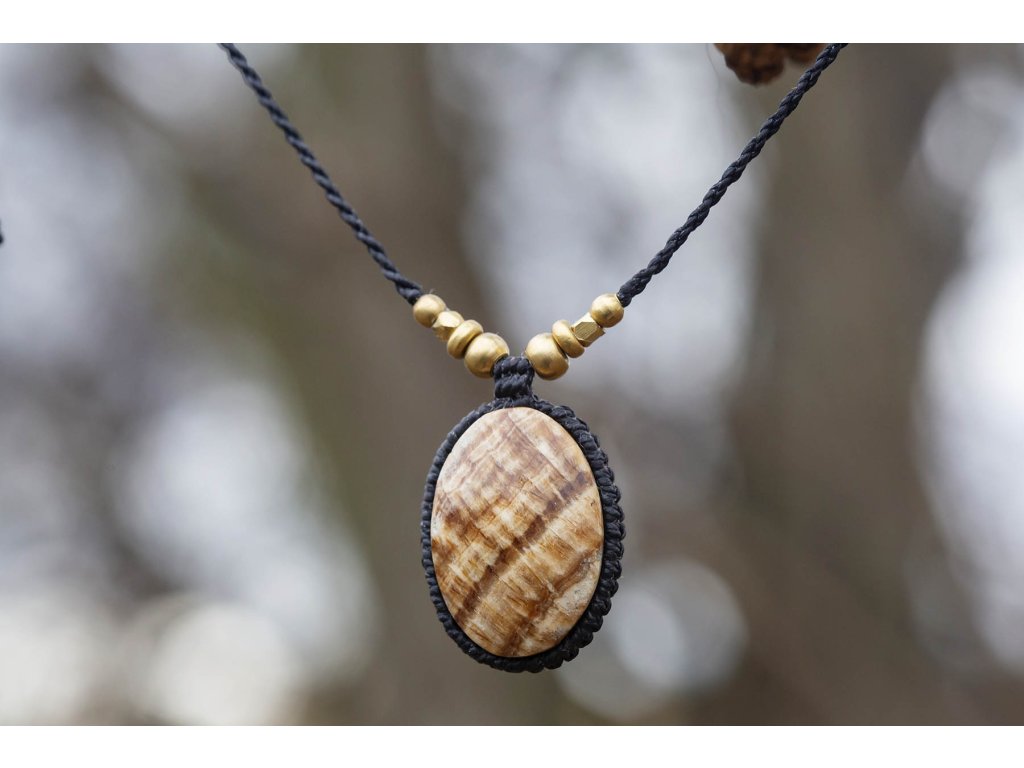 Náhrdelník s aragonitem Krásně zbarvený žíhaný aragonit v macramé vytváří jedinečný přírodní náhrdelník. Šperk byl navržen a ručně vytvořen v dílně našeho milého přítele a kolegy, kečuánského indiána Arona. Jeho tvorba vychází z tradičních peruánských technik výroby šperků. Aragonit dokáže uzemňovat tělesnou energii, posiluje spojení se Matkou zemí a stabilizuje kořenovou čakru. Podporuje trpělivost a vstřícnost, potlačuje přecitlivělost. Lidem, kteří na sebe mají příliš velké nároky, pomůže naučit se delegovat část svých povinností na jiné. Je velmi vhodný do různých amuletů na dennodenní nošení. Délka nastavitelná pomocí macramé zámečku. Hmotnost cca 11 gDoplňkové parametry