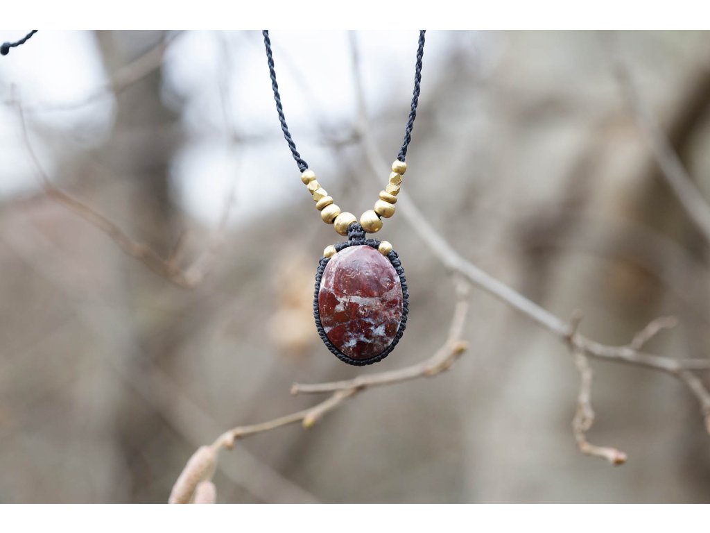 Náhrdelník s jaspisem Překrásný hnědočervený mramorovaný jaspis na macramé šňůrce s mosaznými korálky. To je tento náhrdelník s jaspisem. Šperk byl navržen a ručně vytvořen v dílně našeho milého přítele a kolegy, kečuánského indiána Arona. Jeho tvorba vychází z tradičních peruánských technik výroby šperků. Délka je nastavitelná pomocí macramé zámečku. Rozměry kamene cca 2 x 3 cm Hmotnost cca 12 gDoplňkové parametry