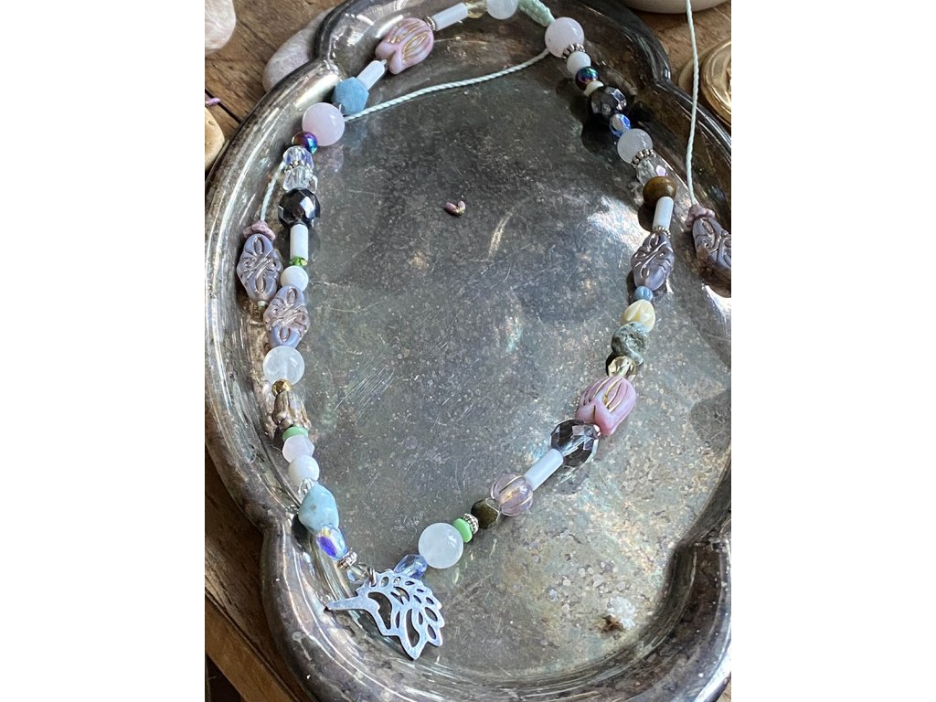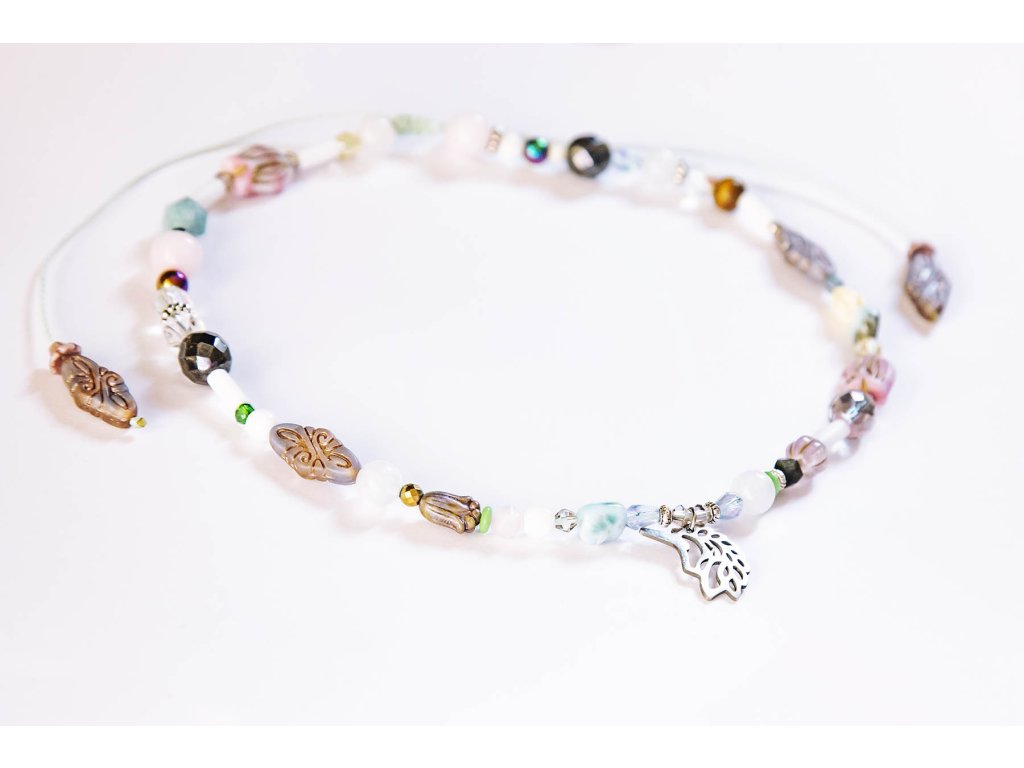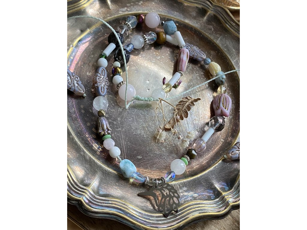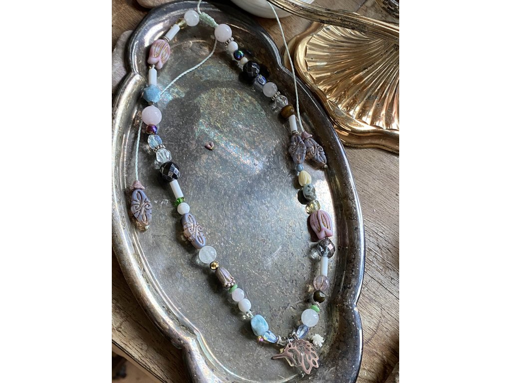 Náhrdelník s jednorožcem Náhrdelník s nerezovým jednorožcem je hravý a veselý šperk povzbuzující každodenní manifestaci všech vašich fantazií. Má jemné pastelové barvy, je tvořen z křišťálu, apatitu, růženínu, larimaru, hematitu, vintage korálků a korálků od českých sklářů. Neváhejte, je to unikátní autorský kousek a je jen jeden! Apatit nám pomáhá dobíjet energii. Podporuje sebevědomí a otevřenost. Potlačuje lhostejnost, nepřátelství a odstraňuje negativní postoje. Zmírňuje emoce hněvu, podrážděnosti a smutku. Podporuje energii na rozvoj nových projektů, neboť povzbuzuje tvůrčí schopnosti a intelekt. Harmonizuje tělesnou, emocionální a duševní stránku a čakry. Hematit je zvláště účinný při uzemnění a jako ochranný kámen. Uvádí do rovnováhy tělo, mysl i ducha. Nese v sobě silný element jang a zajišťuje rovnováhu meridiánů, čímž napravuje nevyváženost prvku jin. O hematitu se píše, že působí zvlášť blahodárně v situacích spojených s právem a zákony. Silně působí také v duševní rovině. Pomáhá plachým osobám zvyšovat sebevědomí a podporuje schopnost přežít. Dodává větší vůli k životu a rozvíjí spolehlivost. Zvyšuje rovněž důvěryhodnost. Tento kámen odstraňuje omezení, která si jeho majitel v minulosti sám stanovil, a napomáhá rozvoji osobnosti. Účinně asistuje při překonávání různých nutkání a návyků. Hematit obrací pozornost k nenaplněným touhám představujícím hnací motor lidského života. Křišťál je jedinečný kámen, který uvádí energii svého nositele do harmonie, zesiluje jí a tím povzbuzuje psychiku, jasnozřivost a samostatnost a sebezdokonalení. Ochraňuje před zlými a negativními silami. Harmonizuje, čistí a chrání auru a tím zajišťuje klidný spánek. Je vhodný pro meditace a magické účely. Larimar je kámen se silným přínosem pro podporu meditace, který podporuje vnitřní uvolnění díky nádherným pocitům, které přináší. Podporuje stav pohody a relaxace. Pomáhá při odbourávání zábran, jež jsme si vystavěli kolem srdce a umožňuje emocionální uvolnění a očistu hlubokých citových vzorů. Vnáší do našeho života více přirozeného stavu hravosti a radostné energii. Jedná se o vynikající kámen pro všechny, kdo hledají spřízněnou duši. Růženín je kámen lásky. Pomáhá projevovat city, dodává lásku a krásu, podporuje něžnost, mírnost, přátelskost a nesobeckost. Podněcuje citlivost a vnímavost vůči ostatním i sobě samému, podporuje fantazii, inspiraci a tvořivost a trpělivost. Dává sílu k odpuštění, učí sebeúctě a sebelásce. Délka je nastavitelná pomocí macramé zámečku.Doplňkové parametry