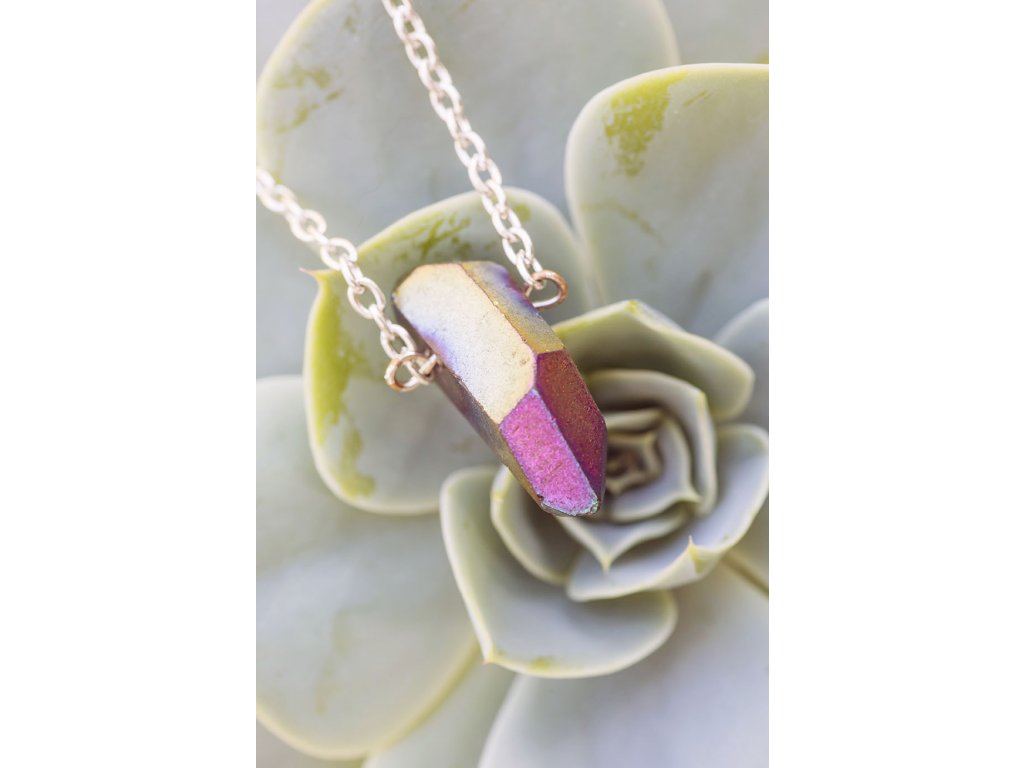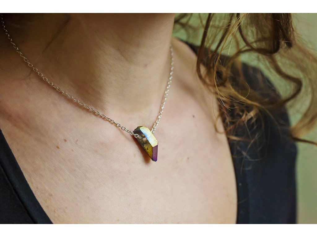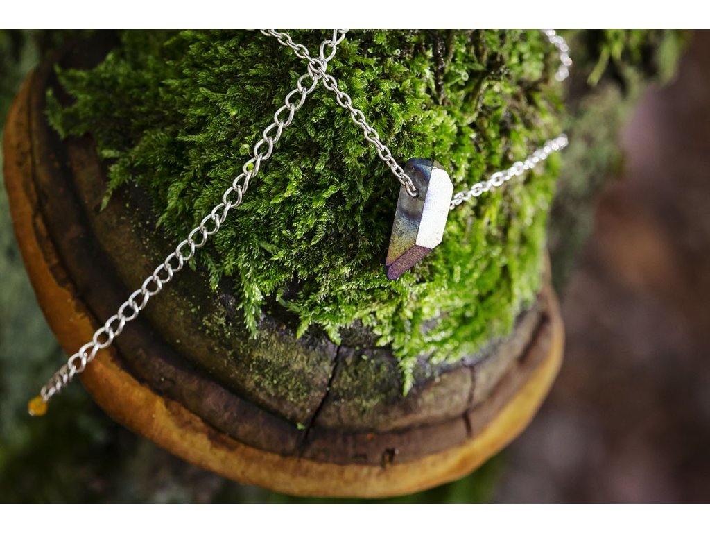 Náhrdelník s křišťálem Náhrdelník s krystalem křišťálu s titanovou povrchovou úpravou, která dává kameni temně duhový odstín. Křišťál je jedinečný kámen, který uvádí energii svého nositele do harmonie, zesiluje jí a tím povzbuzuje psychiku, jasnozřivost a samostatnost a sebezdokonalení. Ochraňuje před zlými a negativními silami. Harmonizuje, čistí a chrání auru a tím zajišťuje klidný spánek. Je vhodný pro meditace a magické účely. Obvod cca 35 cm.Doplňkové parametry