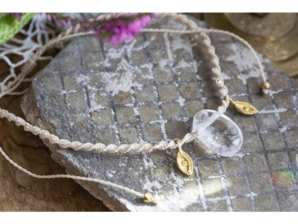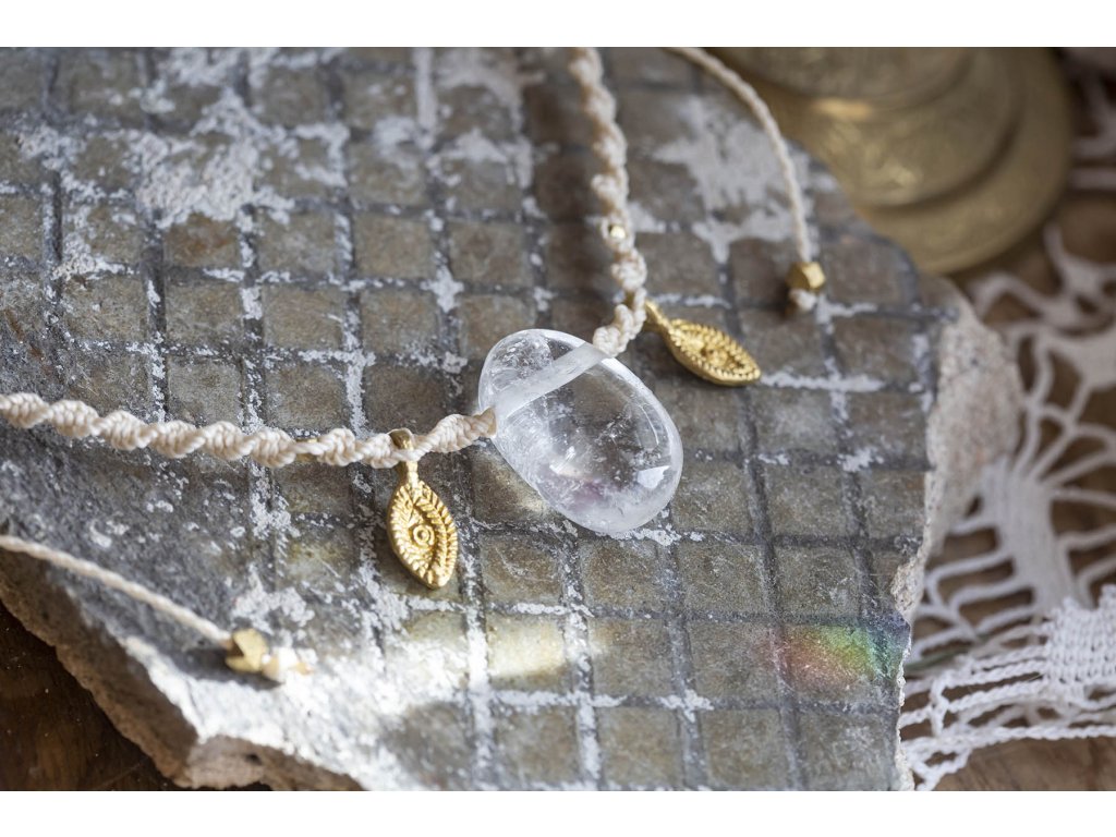 Náhrdelník s křišťálem Překrásný jedinečný náhrdelník s křišťálem. Drahokam je na světlém macramé s mosaznými spirálami. Náhrdelník je opravdu originální tribal kousek. Křišťál je jedinečný kámen, který uvádí energii svého nositele do harmonie, zesiluje jí a tím povzbuzuje psychiku, jasnozřivost a samostatnost a sebezdokonalení. Ochraňuje před zlými a negativními silami. Harmonizuje, čistí a chrání auru a tím zajišťuje klidný spánek. Je vhodný pro meditace a magické účely. Délka je nastavitelná pomocí macramé zámečku. Hmotnost cca 16 gDoplňkové parametry