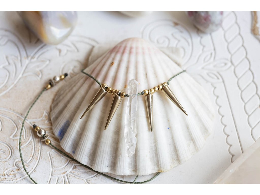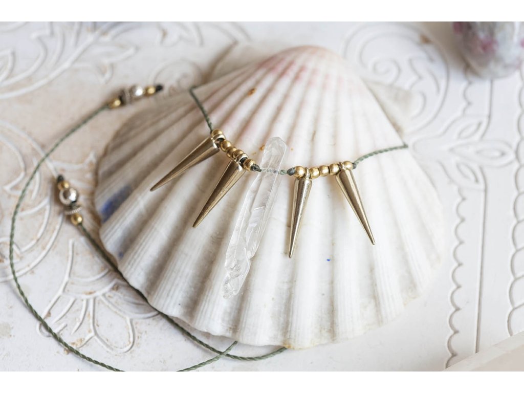 Náhrdelník s křišťálem Překrásný náhrdelník s křišťálem a recycled bodci na šňůrce dvoušroubovice DNA. Křišťál je jedinečný kámen, který uvádí energii svého nositele do harmonie, zesiluje jí a tím povzbuzuje psychiku, jasnozřivost a samostatnost a sebezdokonalení. Ochraňuje před zlými a negativními silami. Harmonizuje, čistí a chrání auru a tím zajišťuje klidný spánek. Je vhodný pro meditace a magické účely. Délka je nastavitelná pomocí macramé zámečku.Doplňkové parametry