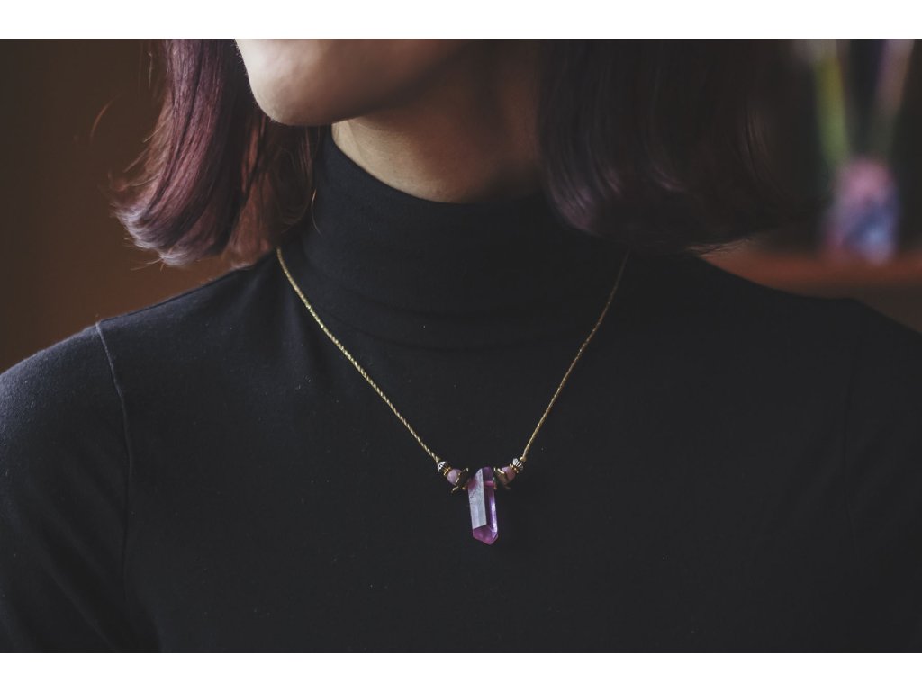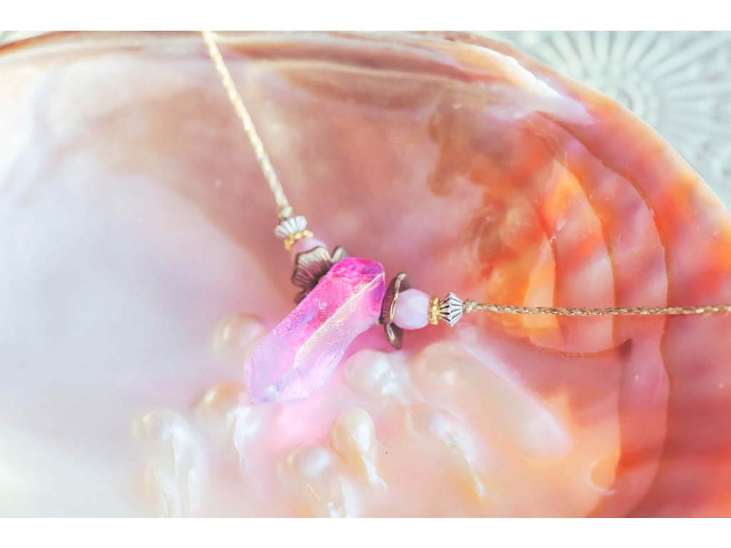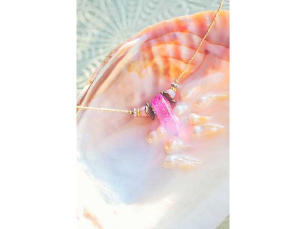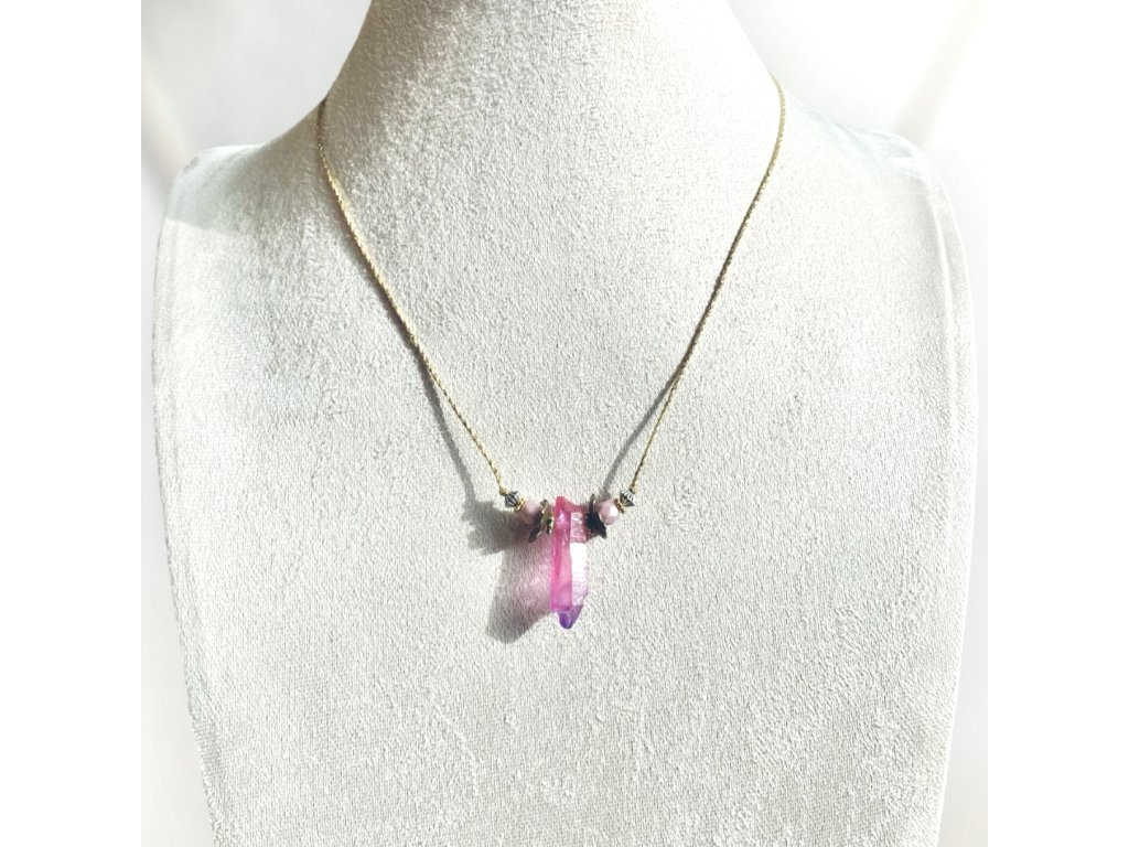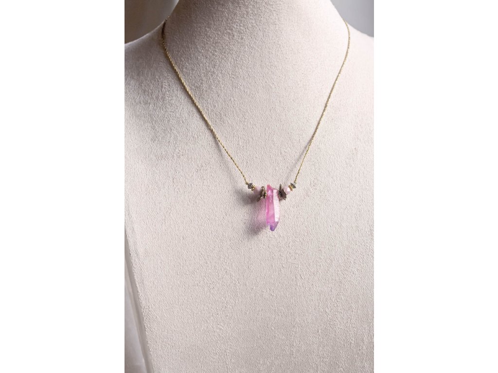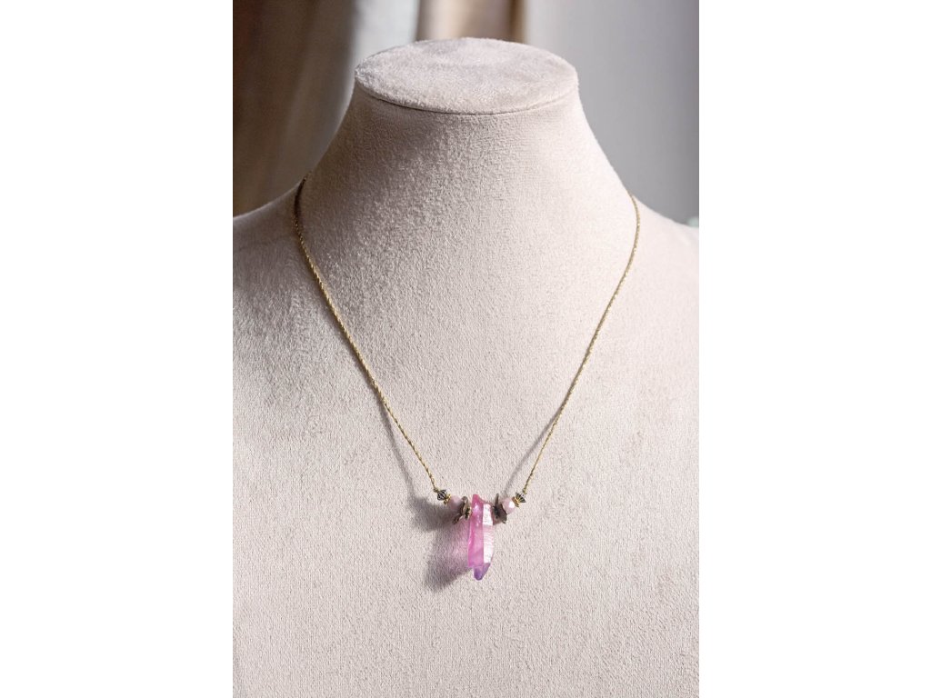 Náhrdelník s křišťálem Tento náhrdelník s křišťálem byl vytvořen ve vílím stylu aby podtrhl veselou, koketní a hravou část v každé ženě či dívce. Křišťál spolu s korálky od českých sklářů a kovovými komponentami navlečenými na zlatém makramé provázku je lazen do růžovo-fialových odstínů a bude se krásně vyjímat samostatně či v kombinaci s jinými řetízky a korálky ve vašem dekoltu v oblíbeném vrstvení.Doplňkové parametry