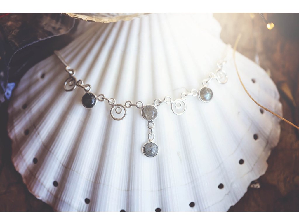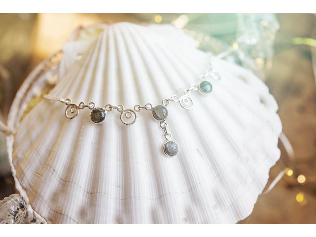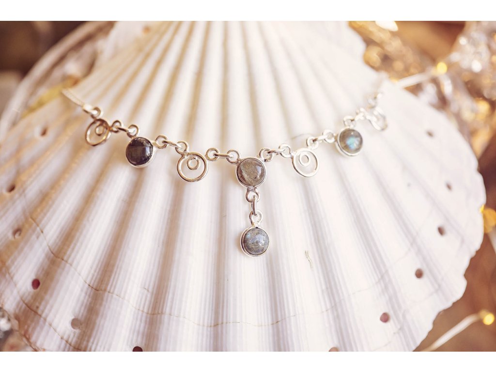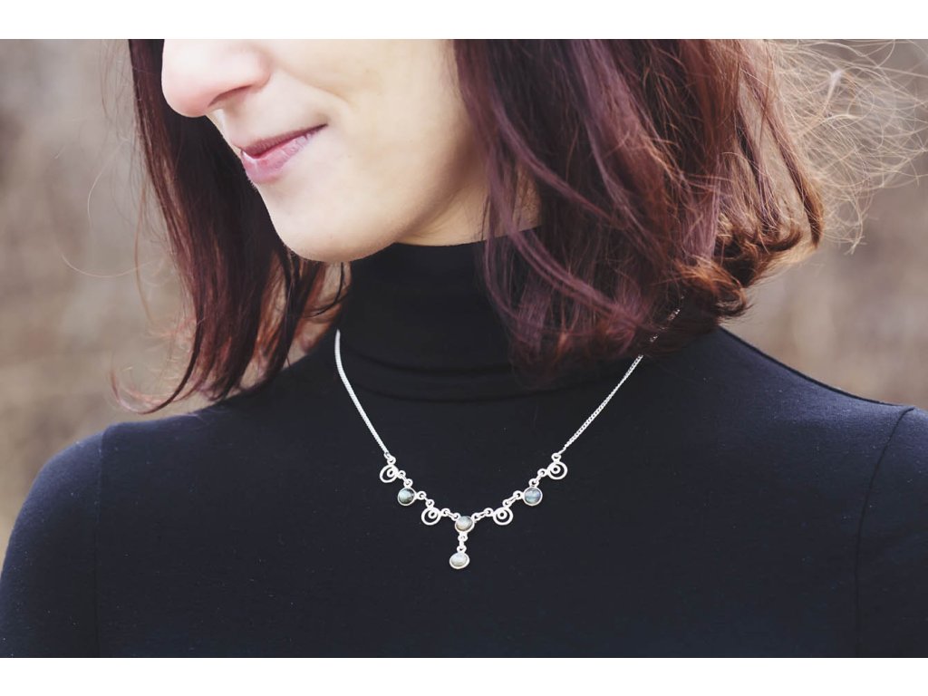 Náhrdelník s labradority Překrásný jemný stříbrný náhrdelník s čtyřmi labradority. Ozdobí každý dekolt. K tomuto náhrdelníku se krásně hodí stříbrný prsten s labradoritem. Labradorit je vhodný pro bytost, která je připravená ukázat světu své skryté hlubiny. Vynáší na povrch to, co před světem ukrýváme a osvobozuje naši osobnost od starých vzorců a zábran. Odložením zábran se navrací do života spontánnost a radost. Je to také ochranný kámen šamanů a mágů, aby nesešli z cesty při propojování různých dimenzí a světů, přináší světlo, které rozjasňuje tuto cestu. Obvod lze upravit, maximální možná délka cca 45 cm Hmotnost cca 9 g Materiál kov: Stříbro Ag 925/1000Doplňkové parametry
