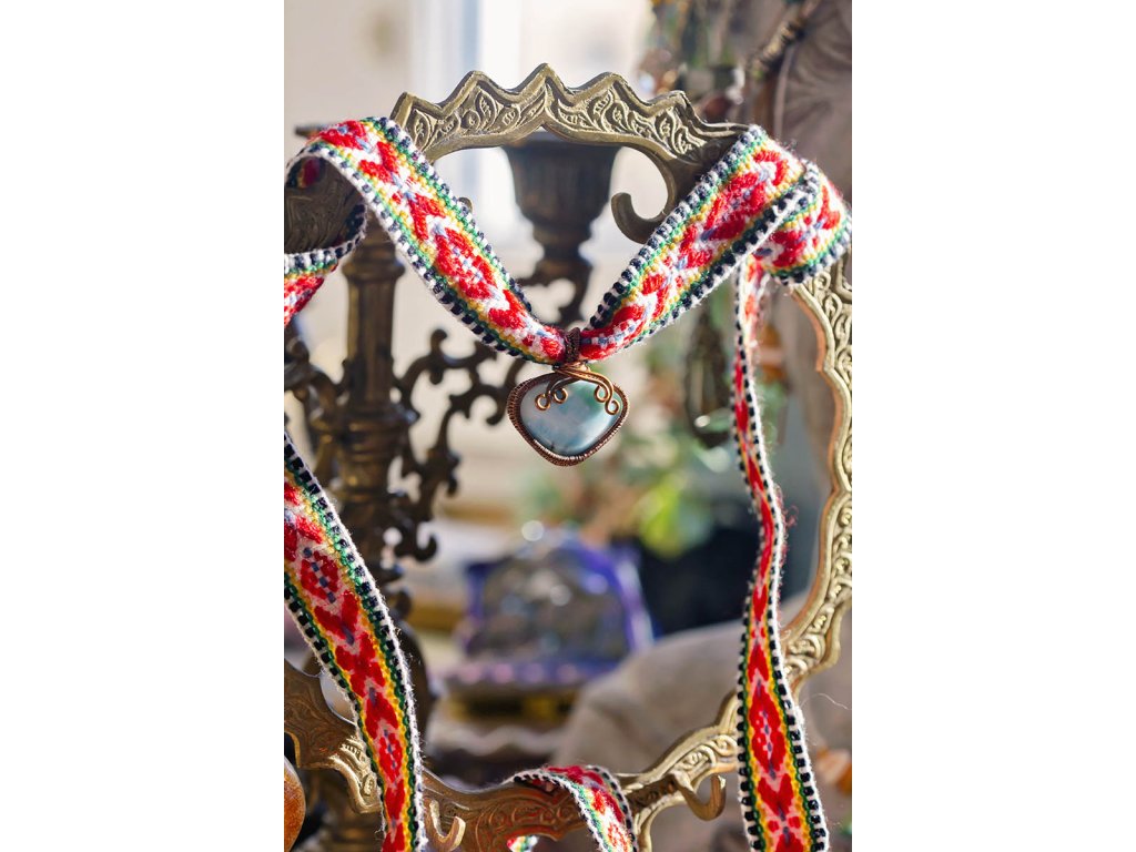 Náhrdelník s larimarem a indiánským vzorem Tento okouzlující náhrdelník je ručně vyrobený a zdobený mořským kamenem larimarem. Kámen je zasazen v ručně zpracovaném měděném uchycení, které zdůrazňuje jeho krásu. Náhrdelník doplňuje dlouhá textilní stužka s tradičním indiánským vzorem, která dodává celému šperku boho styl. Šperk byl navržen a ručně vytvořen v dílně našeho milého přítele a kolegy, kečuánského indiána Arona. Jeho tvorba vychází z tradičních peruánských technik výroby šperků. Larimar je vzácný kámen, který se vyskytuje pouze na jednom místě na světě - na Dominikánské republice. Je známý pro svou klidnou modrou barvu, která připomíná mořskou hladinu. Mnoho lidí věří, že larimar má uklidňující a harmonizující účinky a podporuje vnitřní mír a pohodu. Tento náhrdelník je jedinečným kouskem, který se stane ozdobou vašeho letního outfitu. Je ideální pro ženy, které oceňují ruční práci, boho styl a sílu drahých kamenů. Účinky kamene Larimar: Uklidňuje a harmonizuje Podporuje vnitřní mír a pohodu Podněcuje kreativitu a intuici Pomáhá zbavit se stresu a úzkosti Podporuje komunikaci a vyjadřování Tento náhrdelník je perfektním dárkem pro každou ženu, která ocení jeho krásu a jedinečnost. Délka: Délka náhrdelníku je nastavitelná díky stužce, zavážete si ji v požadované délce sami. Tento náhrdelník je vyroben s láskou a péčí. Věříme, že se vám bude líbit a stane se vašim oblíbeným šperkem.Doplňkové parametry