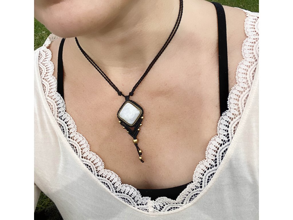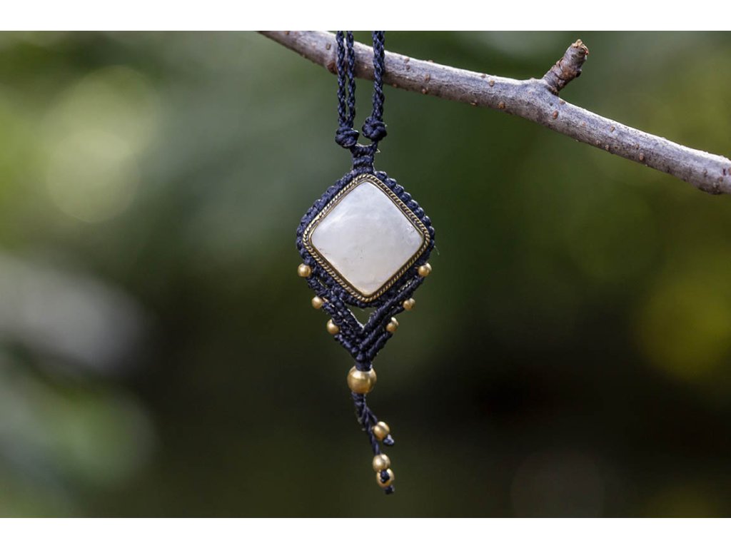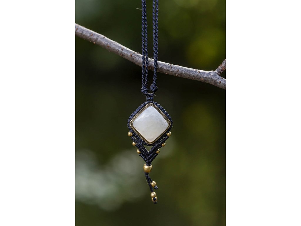 Náhrdelník s měsíčním kamenem Tento macramé náhrdelník s měsíčním kamenem ozdobí každý dekolt. Šperk byl navržen a ručně vytvořen v dílně našeho milého přítele a kolegy, kečuánského indiána Arona. Jeho tvorba vychází z tradičních peruánských technik výroby šperků. Měsíční kámen je uchvacující drahokam, který má silné magické účinky. Ochraňuje citlivé povahy a napomáhá vyrovnaným šťastným vztahům. Je považován za drahokam štěstí. Působí pozitivně na intuici, tvořivost a podpoří Vás v nových začátcích. Šperk s měsíčním kamenem by neměl chybět ve šperkovnici žádné ženy. Více o měsíčním kameni se dočtete na našem blogu Délka je nastavitelná Rozměry kamene cca 2 x 2 cm Hmotnost cca 10 gDoplňkové parametry