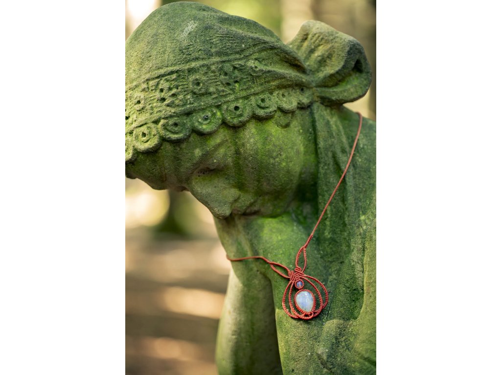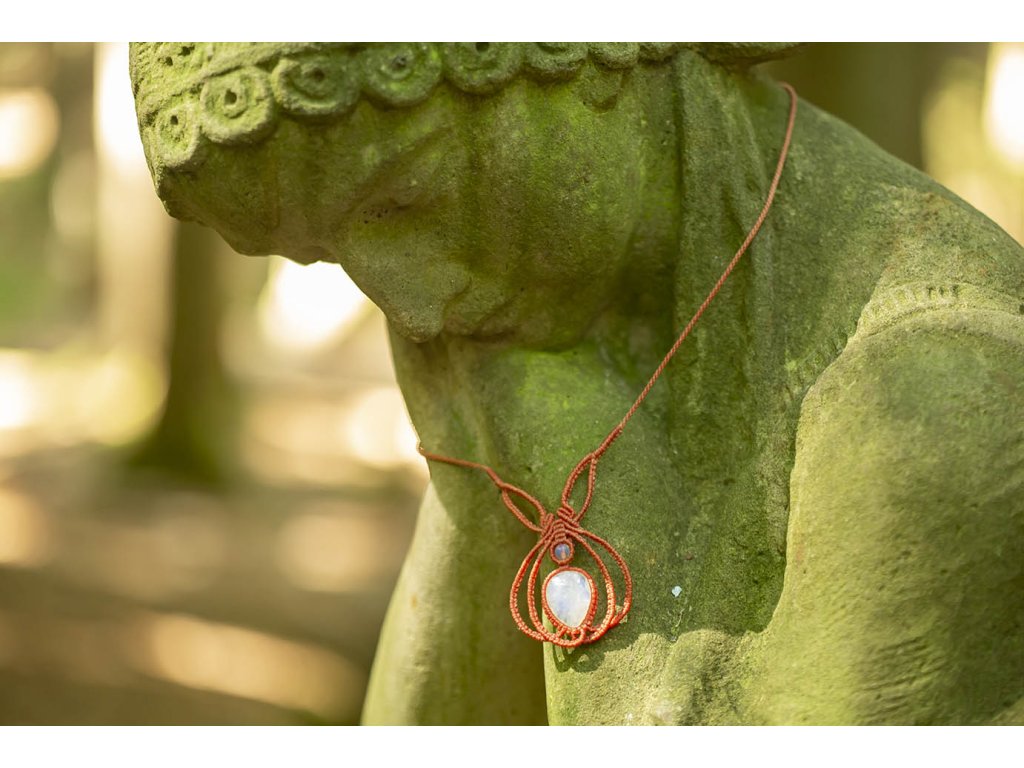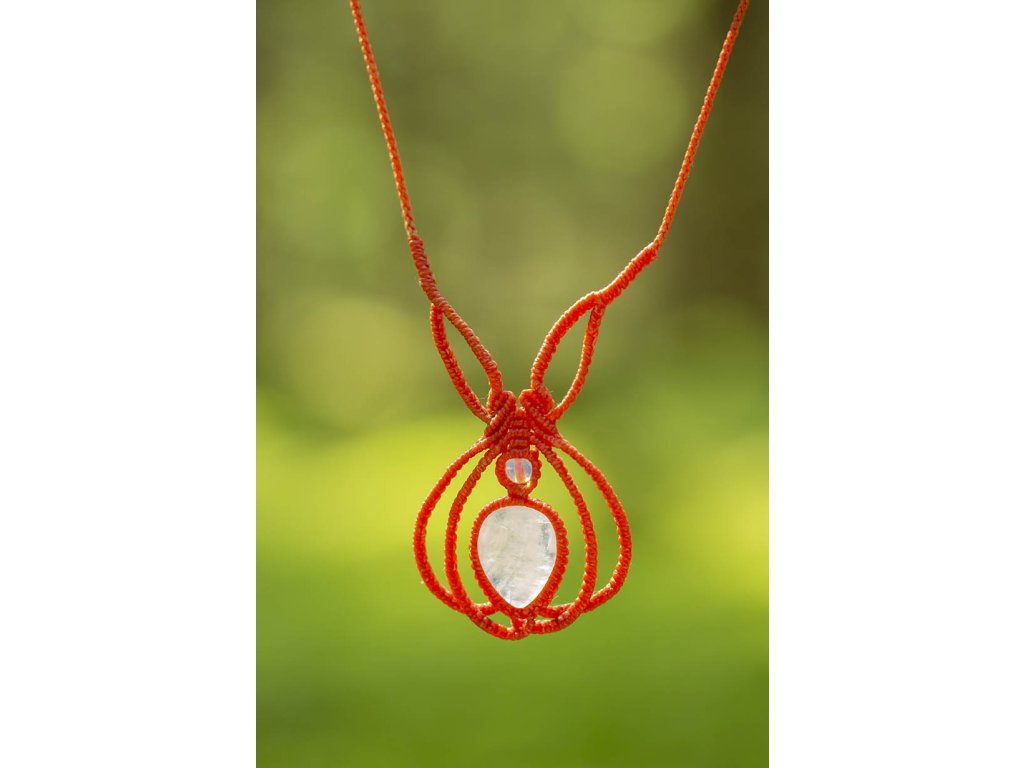 Náhrdelník s měsíčním kamenem Červený macramé ornament s měsíčními kameny - to je tento nevšední náhrdelník. Šperk byl navržen a ručně vytvořen v dílně našeho milého přítele a kolegy, kečuánského indiána Arona. Jeho tvorba vychází z tradičních peruánských technik výroby šperků. Měsíční kámen je uchvacující drahokam, který má silné magické účinky. Ochraňuje citlivé povahy a napomáhá vyrovnaným šťastným vztahům. Je považován za drahokam štěstí. Působí pozitivně na intuici, tvořivost a podpoří Vás v nových začátcích. Šperk s měsíčním kamenem by neměl chybět ve šperkovnici žádné ženy. Více o měsíčním kameni se dočtete na našem blogu. Obvod cca 50 cm Rozměry kamene cca 1,5 x 2 cmDoplňkové parametry