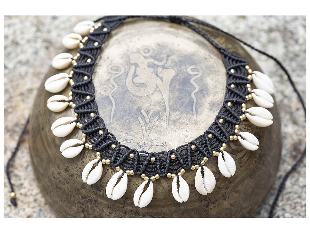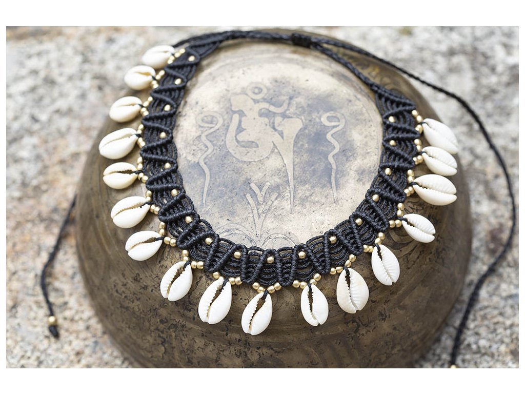 Náhrdelník s mušlemi černý Náhrdelník macramé s přírodními mušlemi a mosaznými komponenty. Délka nastavitelná