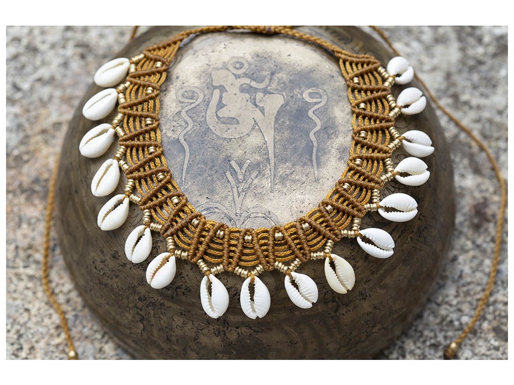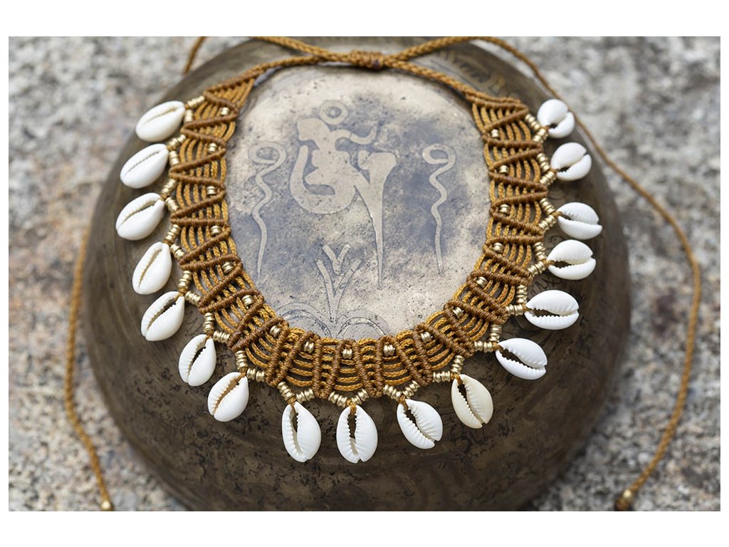 Náhrdelník s mušlemi hnědý Náhrdelník macramé s přírodními mušlemi a mosaznými komponenty. Délka nastavitelná