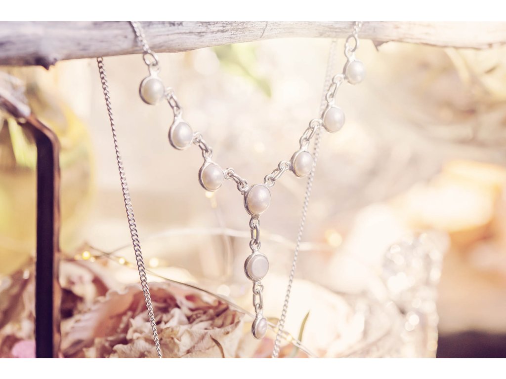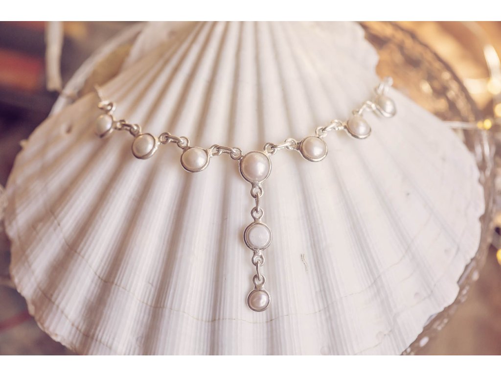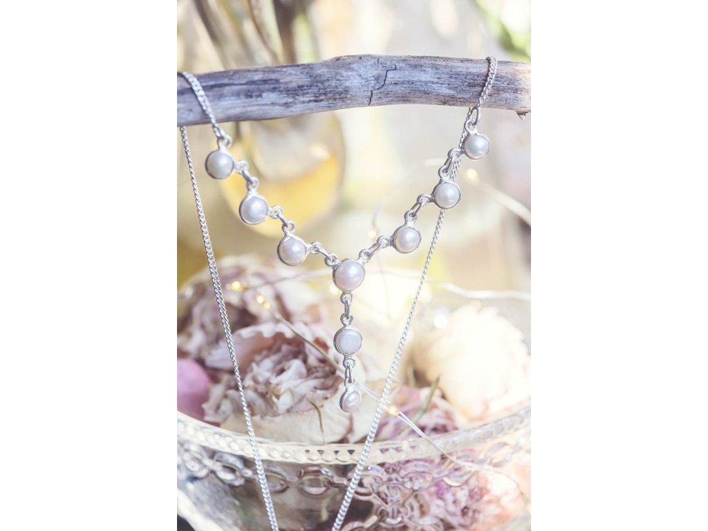 Náhrdelník s perlami Překrásný jemný stříbrný náhrdelník s devíti říčními perlami. Krásná ozdoba nejen pro vodní vílu. K tomuto náhrdelníku se krásně hodí stříbrný prsten s perlou. Perly vnášejí do života rovnováhu, racionalitu a zabraňují negativním vlivům. Perla vám bude sloužit jako osobní ochranný amulet, posílí vaší intuici a vůli dosáhnout vytyčených cílů. Jsou také symbolem moci, hojnosti a bohatství, které ale může mít, jak víme, mnohou podobu... Obvod lze upravit, maximální možná délka cca 45,5 cm Hmotnost cca 10 g Materiál kov: Stříbro Ag 925/1000Doplňkové parametry