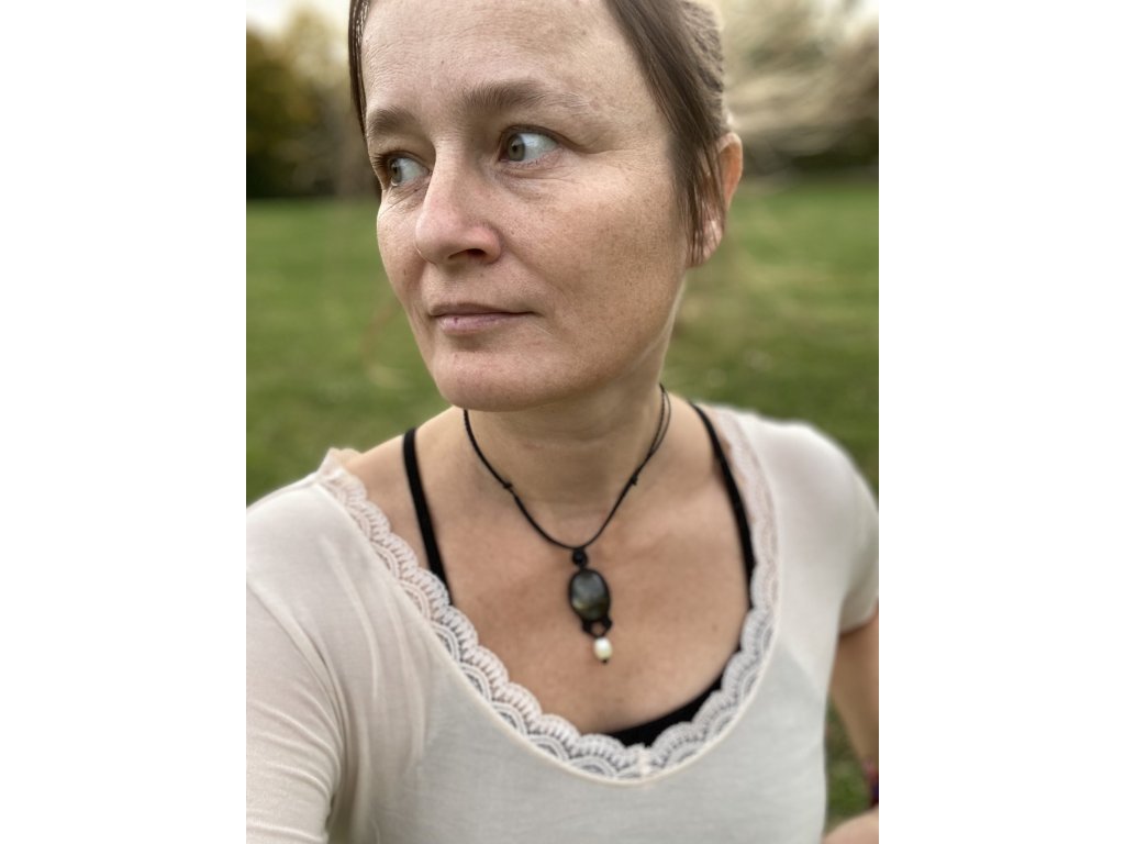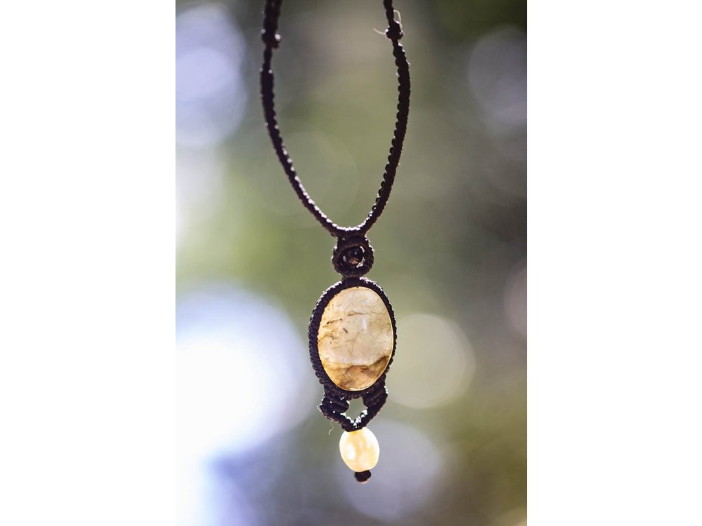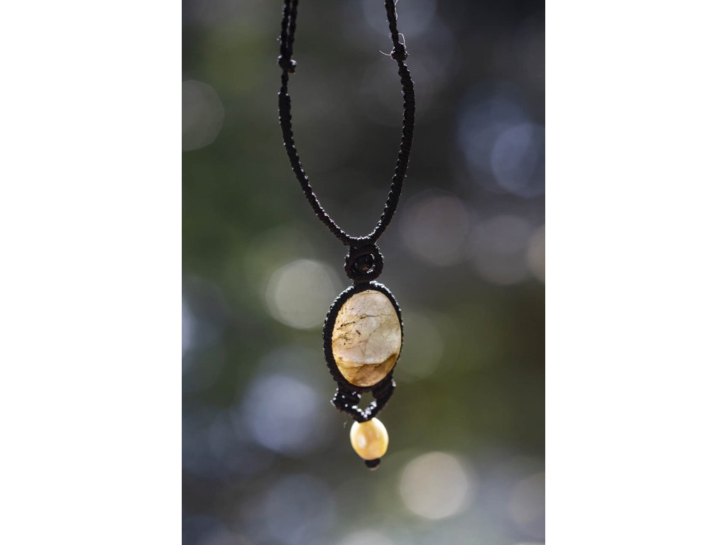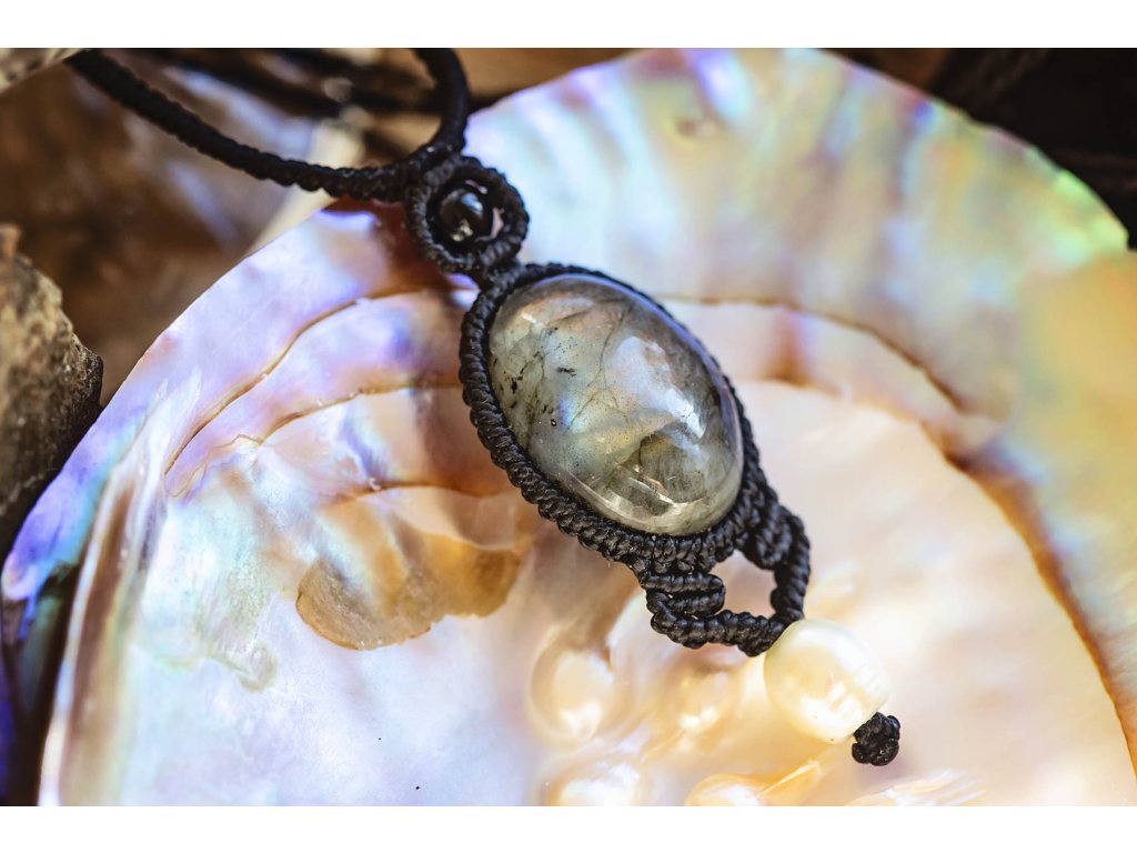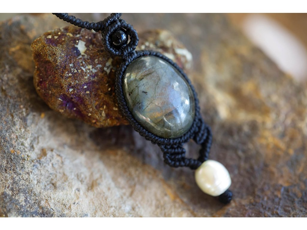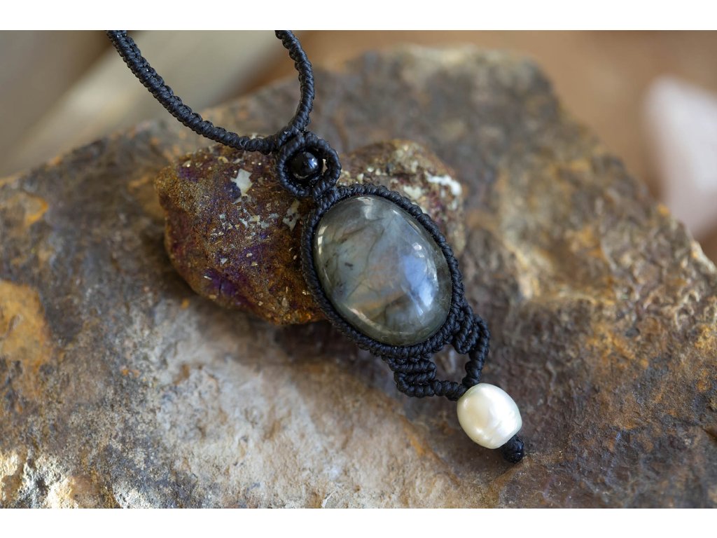 Náhrdelník s perlou a labradoritem Nádherný opalizující labradorit a říční perla v černém macramé - tvoří tento výjimečný náhrdelník. Šperk byl navržen a ručně vytvořen v dílně našeho milého přítele a kolegy, kečuánského indiána Arona. Jeho tvorba vychází z tradičních peruánských technik výroby šperků. Labradorit je vhodný pro bytost, která je připravená ukázat světu své skryté hlubiny. Vynáší na povrch to, co před světem ukrýváme a osvobozuje naši osobnost od starých vzorců a zábran. Odložením zábran se navrací do života spontánnost a radost. Je to také ochranný kámen šamanů a mágů, aby nesešli z cesty při propojování různých dimenzí a světů, přináší světlo, které rozjasňuje tuto cestu. Perly vnášejí do života rovnováhu, racionalitu a zabraňují negativním vlivům. Perla vám bude sloužit jako osobní ochranný amulet, posílí vaší intuici a vůli dosáhnout vytyčených cílů. Jsou také symbolem moci, hojnosti a bohatství, které ale může mít, jak víme, mnohou podobu... Délka je nastavitelná Rozměr kamene cca 2 x 2,5 cm Hmotnost cca 14 gDoplňkové parametry