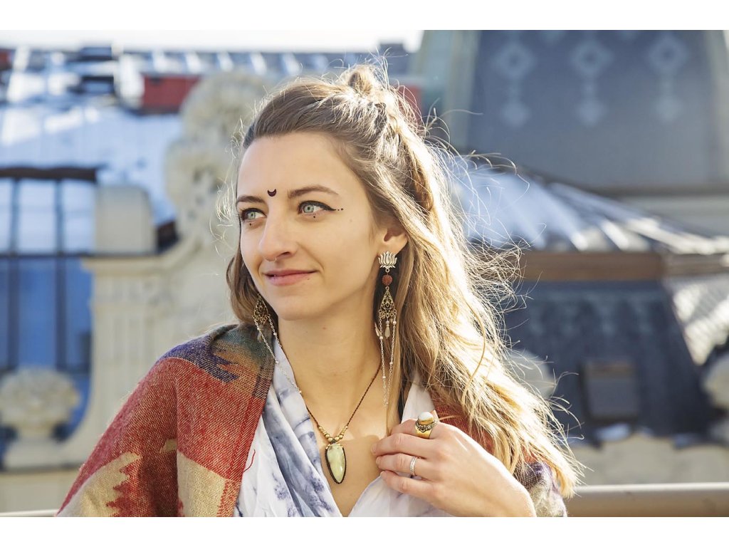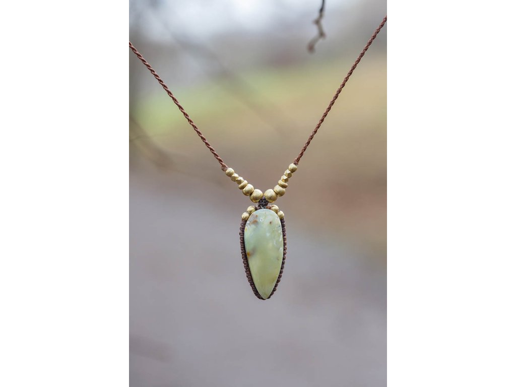 Náhrdelník se zeleným opálem Překrásný náhrdelník s zeleným opálem z Peru na hnědé macramé šňůrce s mosaznými korálky. Nevšední a nápadná ozdoba vašeho dekoltu. Šperk byl navržen a ručně vytvořen v dílně našeho milého přítele a kolegy, kečuánského indiána Arona. Jeho tvorba vychází z tradičních peruánských technik výroby šperků. Opál je vzácný nádherný kámen. V jakémkoliv šperku upoutává pozornost. Podporuje intuici, harmonizuje organizmus, zmírňuje deprese. S nesmírnou silou neutralizuje všechny druhy starých nánosů a krystalizací. Svou zářivostí vede k očistě duše, k sebepoznání, intuici, k propojení fyzického s duchovním v nedělitelný celek a k pochopení souvislostí. Délka je nastavitelná pomocí macramé zámečku. Hmotnost cca 13 gDoplňkové parametry
