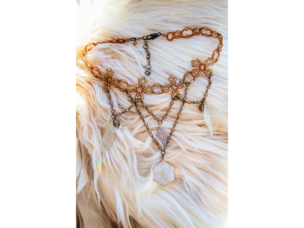 Náhrdelník Sunqu - Trash Art s achátovou drúzou Tento jedinečný náhrdelník z kolekce trash art je inspirován estetikou whimsygoth, která v sobě snoubí romantiku, temnotu a pohádkovou mystiku. Vášnivé fanynky gotiky si zamilují jeho tajemný nádech, zatímco milovnice vintage a handmade kousků ocení jeho jedinečný design a recyklované materiály. Ruční práce s láskou k detailu: Náhrdelník Sunqu je originálním dílem autorky Markéty, která do něj vložila svůj talent a cit pro detail. Každý kousek je ručně vyrobený s použitím ingrediencí ze second handů, čímž šperk dostává nový život a jedinečný příběh. Krásné korálky od českých sklářů: Náhrdelník zdobí korálky od českých sklářů, kteří jsou proslulí svým mistrovstvím a precizní prací. Tyto korálky dodávají šperku punc elegance a originality a podtrhují jeho jedinečný styl. Dominantní achátová drúza: Srdcem náhrdelníku je majestátní hexagonová achátová drúza, která je symbolem síly, stability a vnitřního klidu. Achát je vnímán jako ochranný kámen, který podporuje duševní rovnováhu a odvahu. Název s hlubokým významem: Markéta dala náhrdelníku název Sunqu, což v jazyce Quechua znamená "srdce". Toto pojmenování symbolizuje lásku a péči, vloženou do tvorby šperku, a zdůrazňuje jeho hlubší význam a emoční hodnotu. Náhrdelník Sunqu je perfektní volbou pro: Milovnice gotiky, vintage a handmade šperků Ženy, které hledají jedinečný a originální kousek Duchovně založené osoby, které ocení sílu achátu Dámy, které touží po šperku s hlubším významem a příběhem Tento náhrdelník není jen módním doplňkem, ale spíše uměleckým dílem, které nese kus duše své autorky. Objevte krásu a tajemství Sunqu a nechte se unášet na vlně fantazie a originality. Maximální délka 42 cm, lze zkrátit.Doplňkové parametry