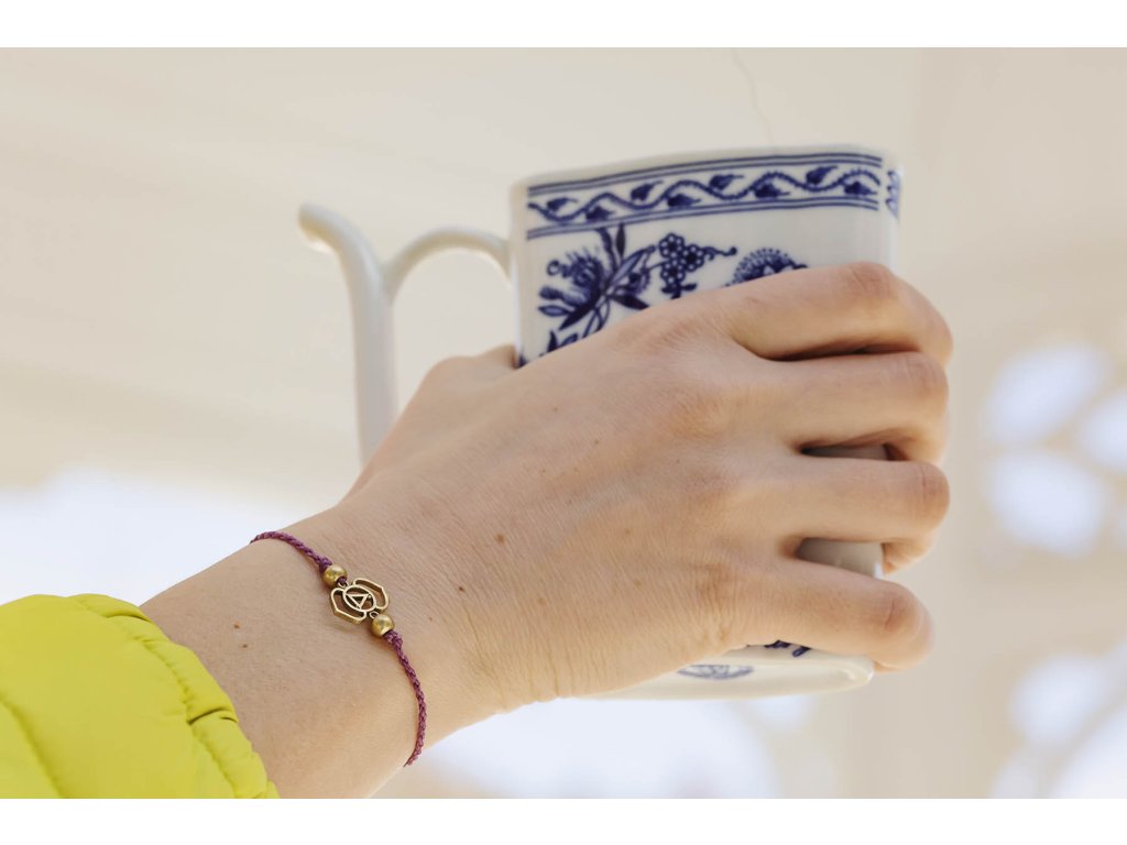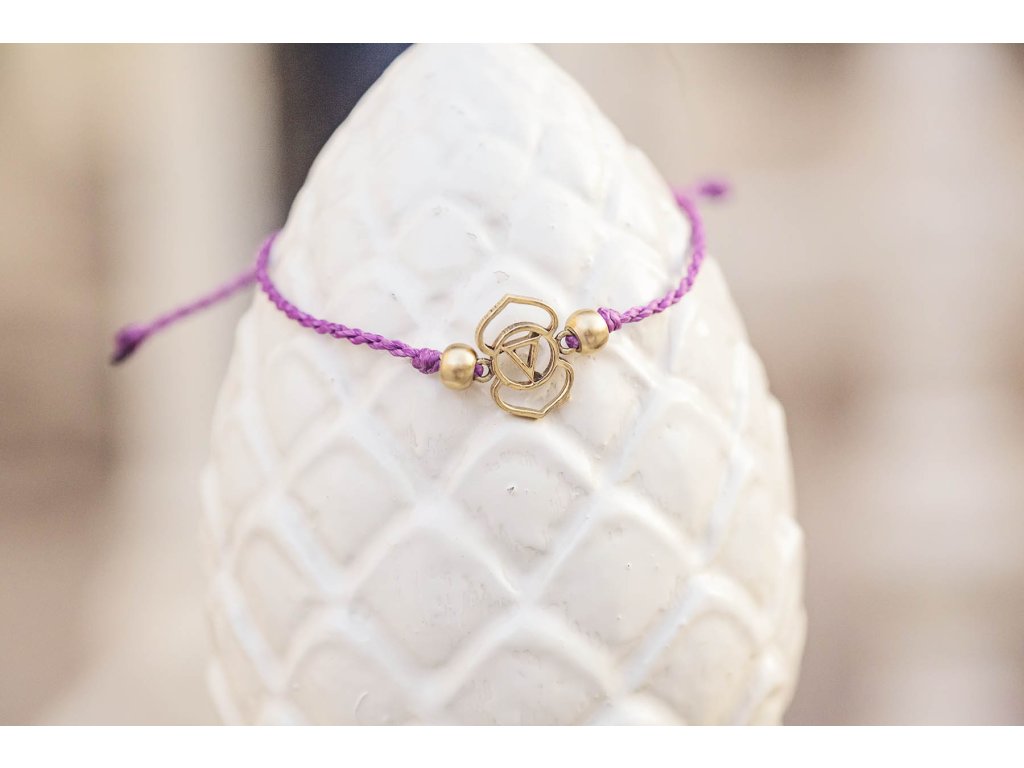 Náramek 6. čakra Ádžňá Jemný náramek s mosazným symbolem šesté čakry a macramé řetízkem ve tvaru dvoušroubovice DNA ve fialové barvě. Nošení tohoto náramku pomáhá balancovat energii čakry. Ádžňá – 6. čakra neboli třetí oko propojuje obě hemisféry mozku a tím vyvažuje kreativitu s analytickým myšlením. Je-li tato čakra vyvážená, jsme propojeni s božským vědomím, máme schopnost intuice a nadhledu. Pomocí meditace pak umíme zklidnit mysl a vytvářet vlastní pozitivní realitu. Velikost je nastavitelná pomocí macramé zámečku.Doplňkové parametry
