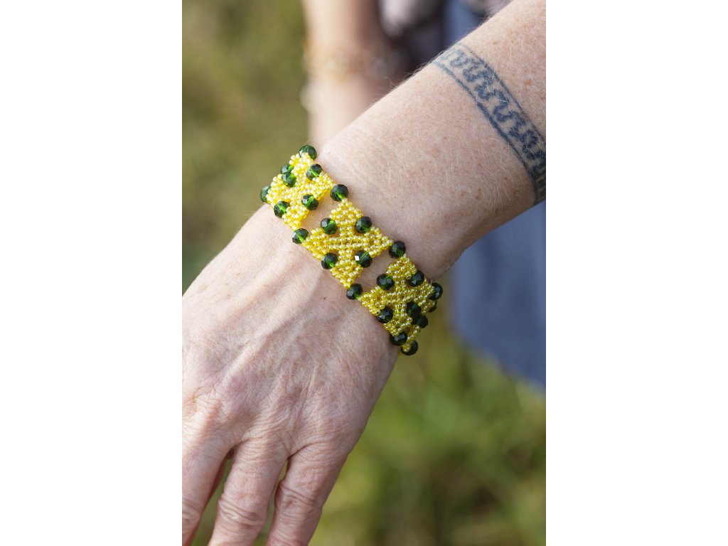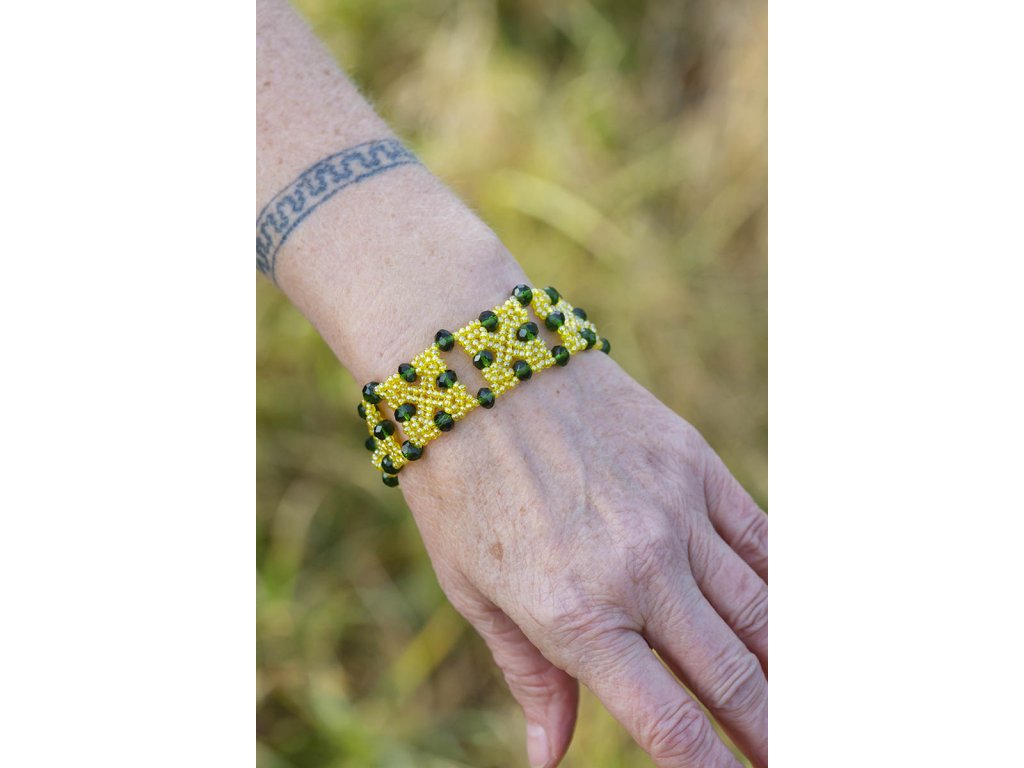 Náramek Hadí bohyně Tajemná bohyně s ladnýma rukama ozdobenýma klenoty v barvách vzácných jedovatých hadů...jejích duchovních přátel s hlubokým poselstvím. Tento náramek Hadí bohyně je novinkou v našem náramkovém světě. Je tvořen ze skleněných jabloneckých korálků. Vytvořila ho paní Helenka a Markét o tom napsala krátký příběh: "Helenka je mámina kámoška a stejně jako ona je nesmírně šikovná na ruční práce. Umí zasadit a sklidit řepu i brambory a vedle toho tvoří z jabloneckých korálků rozličné šperky navlíkané na vlasec do krásných tvarů. Na Jamaru vám exkluzivně nabízíme zlomek z Heleniny tvorby, protože milujeme tu krásu a je nám ctí ji podpořit." Délka náramku 18,5 cmDoplňkové parametry