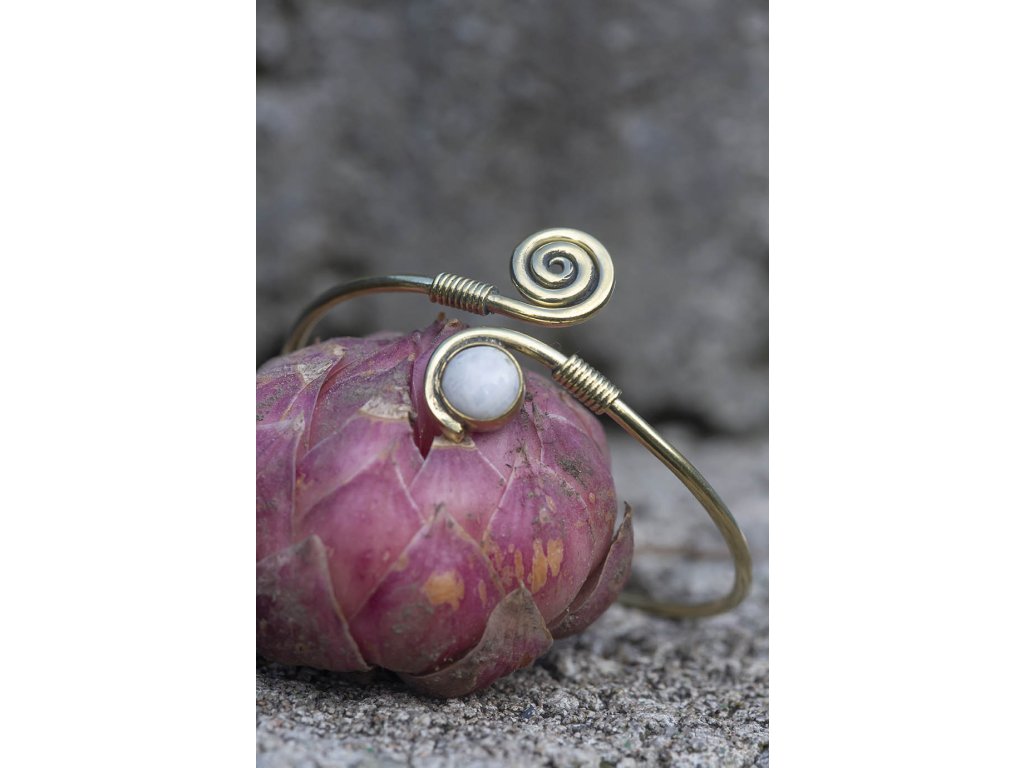 Náramek kámen se spirálou Nádherný mosazný náramek se spirálou a drahokamem. Na výběr je měsíční kámen, růženín a tygří oko. Měsíční kámen je uchvacující drahokam, který má silné magické účinky. Ochraňuje citlivé povahy a napomáhá vyrovnaným šťastným vztahům. Je považován za drahokam štěstí. Působí pozitivně na intuici, tvořivost a podpoří Vás v nových začátcích. Šperk s měsíčním kamenem by neměl chybět ve šperkovnici žádné ženy. Více o měsíčním kameni se dočtete na našem blogu. Růženín je kámen lásky. Pomáhá projevovat city, dodává lásku a krásu, podporuje něžnost, mírnost, přátelskost a nesobeckost. Podněcuje citlivost a vnímavost vůči ostatním i sobě samému, podporuje fantazii, inspiraci a tvořivost a trpělivost. Dává sílu k odpuštění, učí sebeúctě a sebelásce. Tygří oko je ochranný kámen, která se používá jako talisman před všemi formami nebezpečí. Propojuje sluneční a zemskou energii a tím pomáhá uzemnit lidi, kteří ztratili spojení s realitou a zároveň podporuje duchovní růst těch materialisticky zaměřených. Je to hřejivý kámen, podporuje to energie v těle a dodává sílu, přitahuje peníze a prosperitu. Pomáhá s odbouráním závislostí na druhých uznáním vlastní hodnoty. Mírní deprese.Buďte první, kdo napíše příspěvek k této položce.
