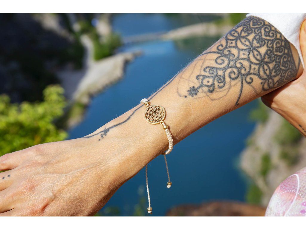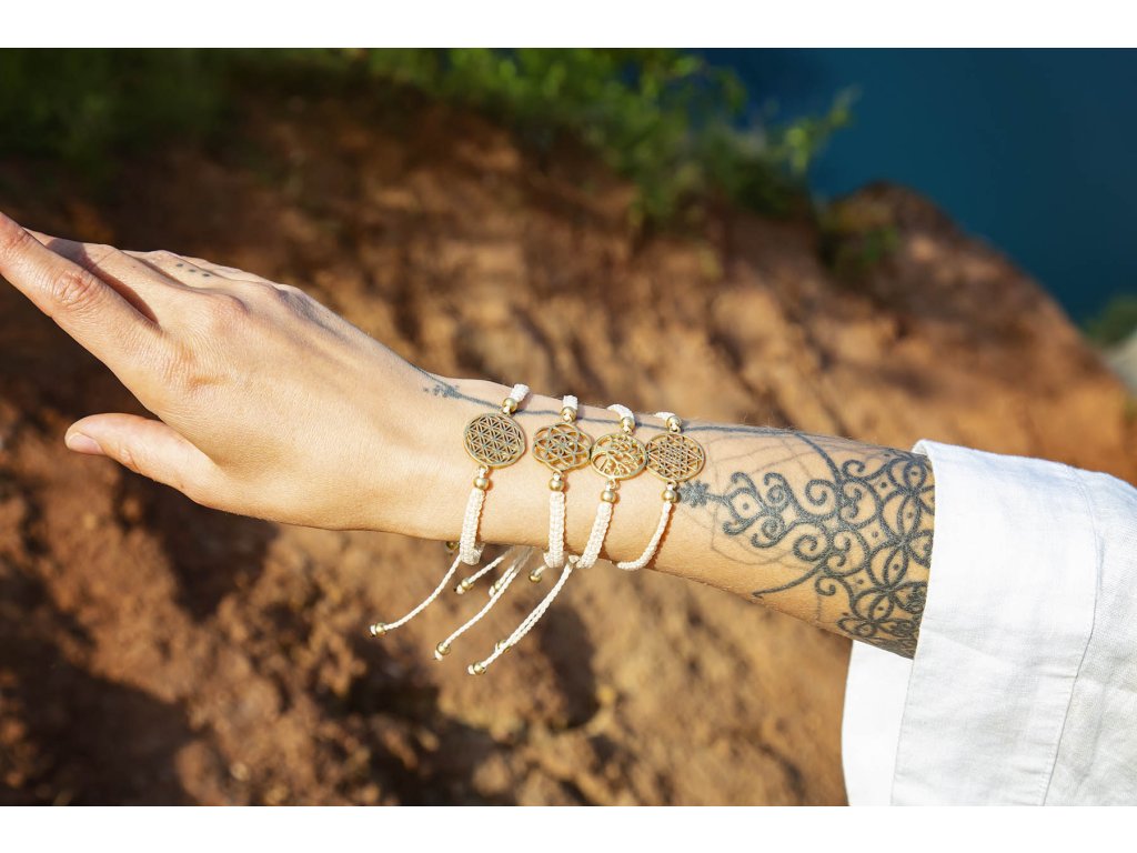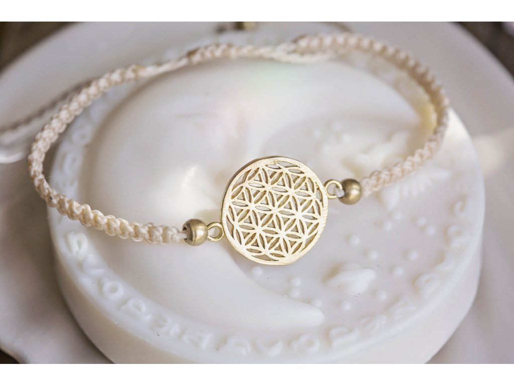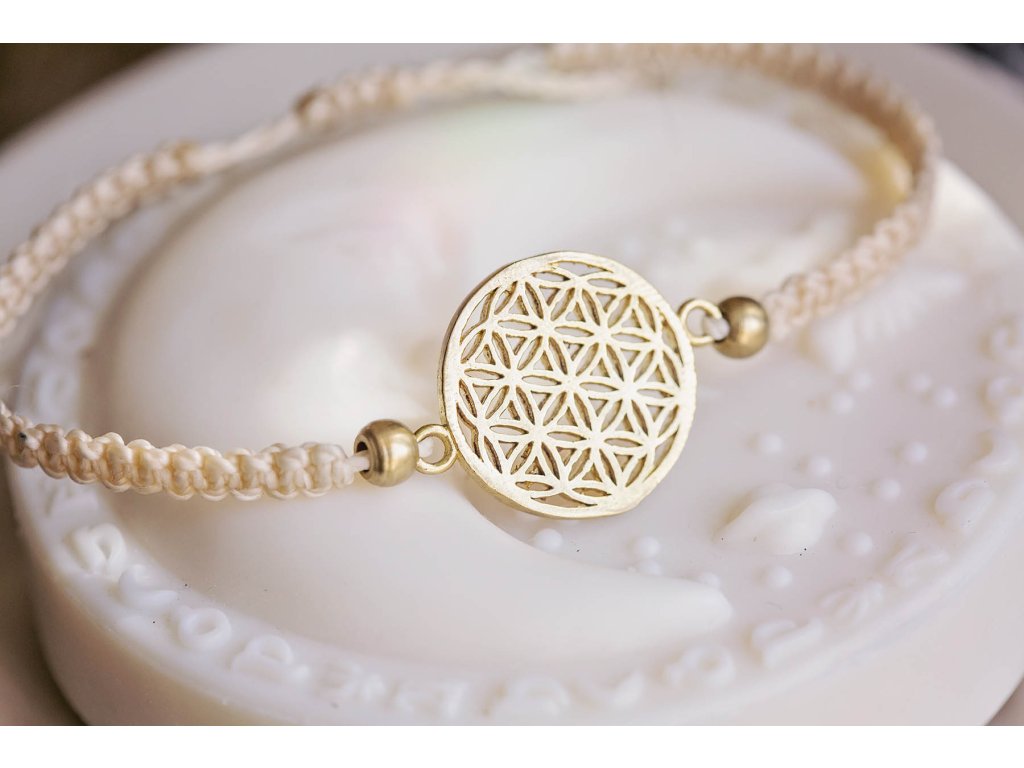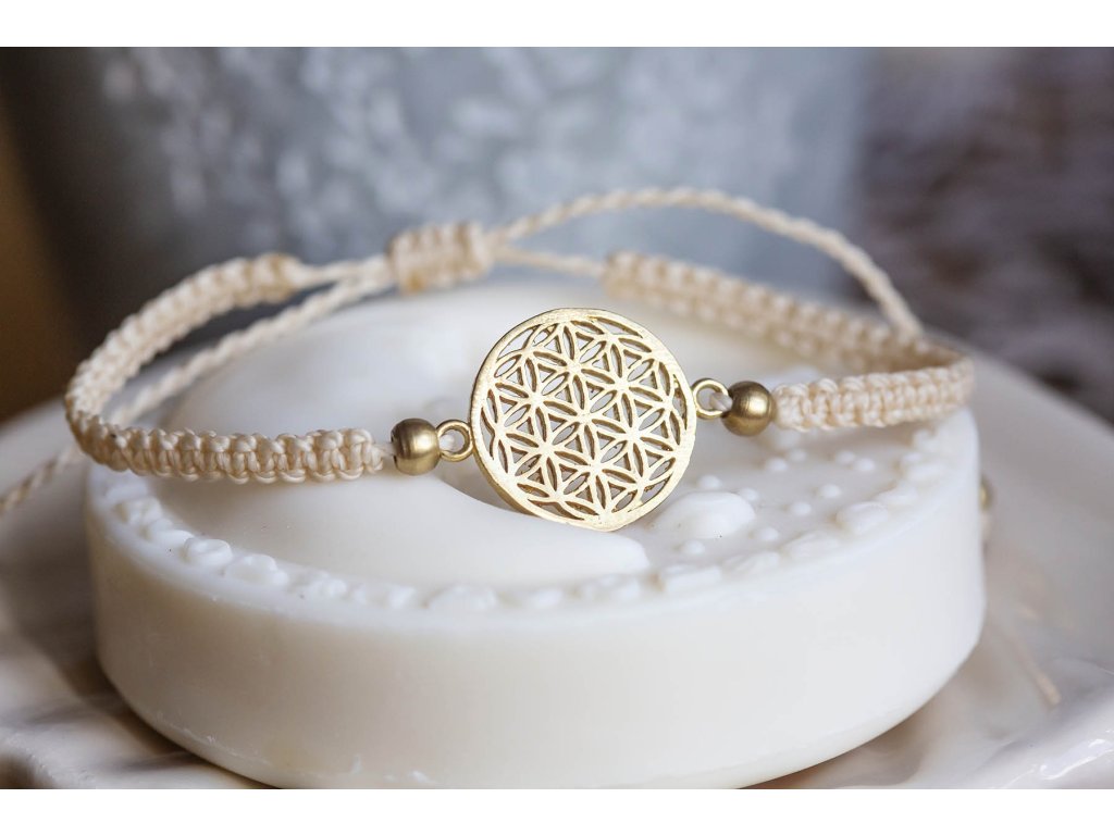 Náramek květ života Krásný macramé náramek s mosazným květem života. Květ života – symbol posvátné geometrie je nalézán v různých místech mnoha kultur na celé planetě. Léčí tělo i duši, harmonizuje osobnost, dodává energii, pomáhá napojit se na božskou sílu, na vesmírné světlo. Velikost nastavitelná pomocí macramé zámečku.Doplňkové parametry